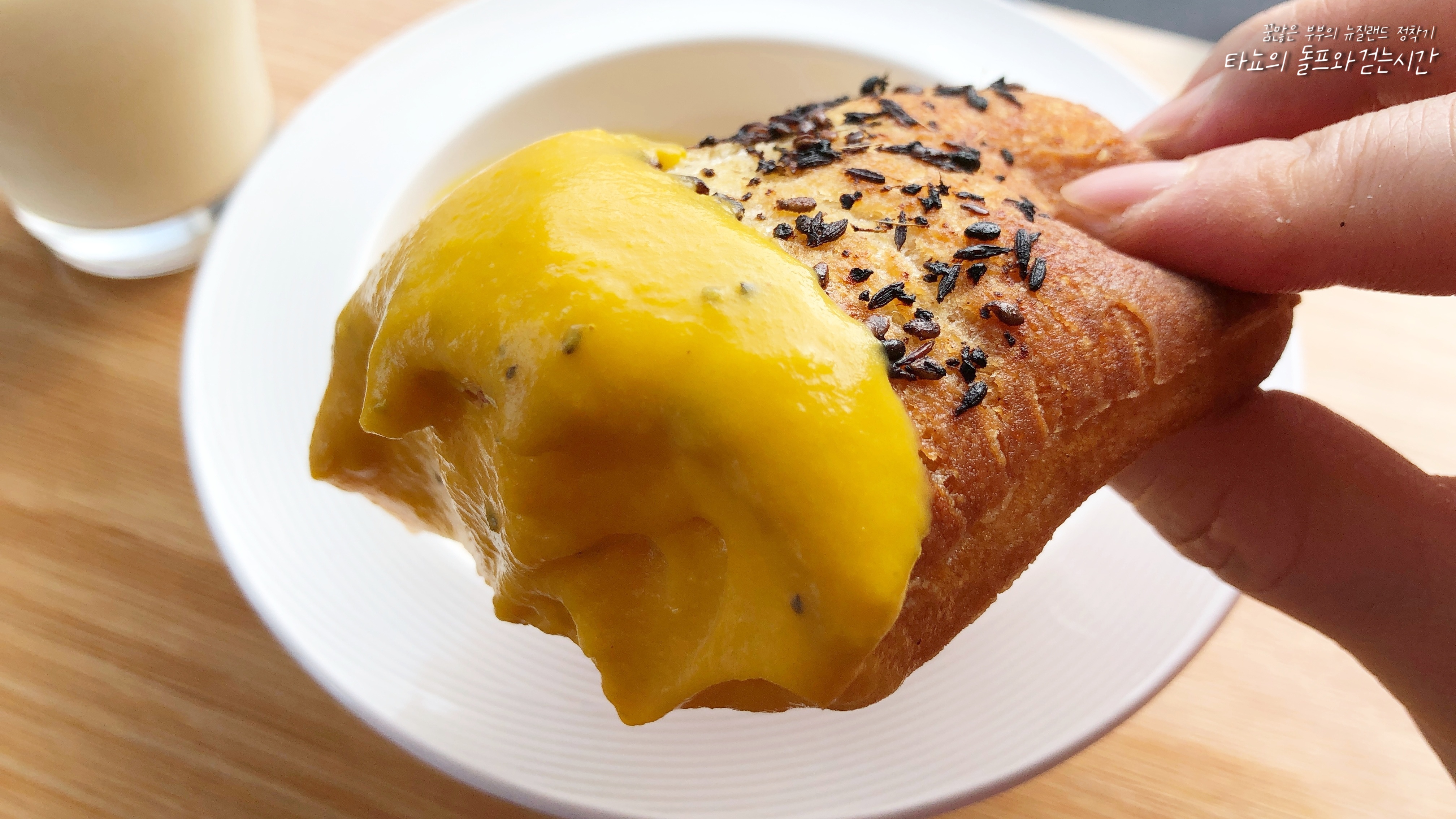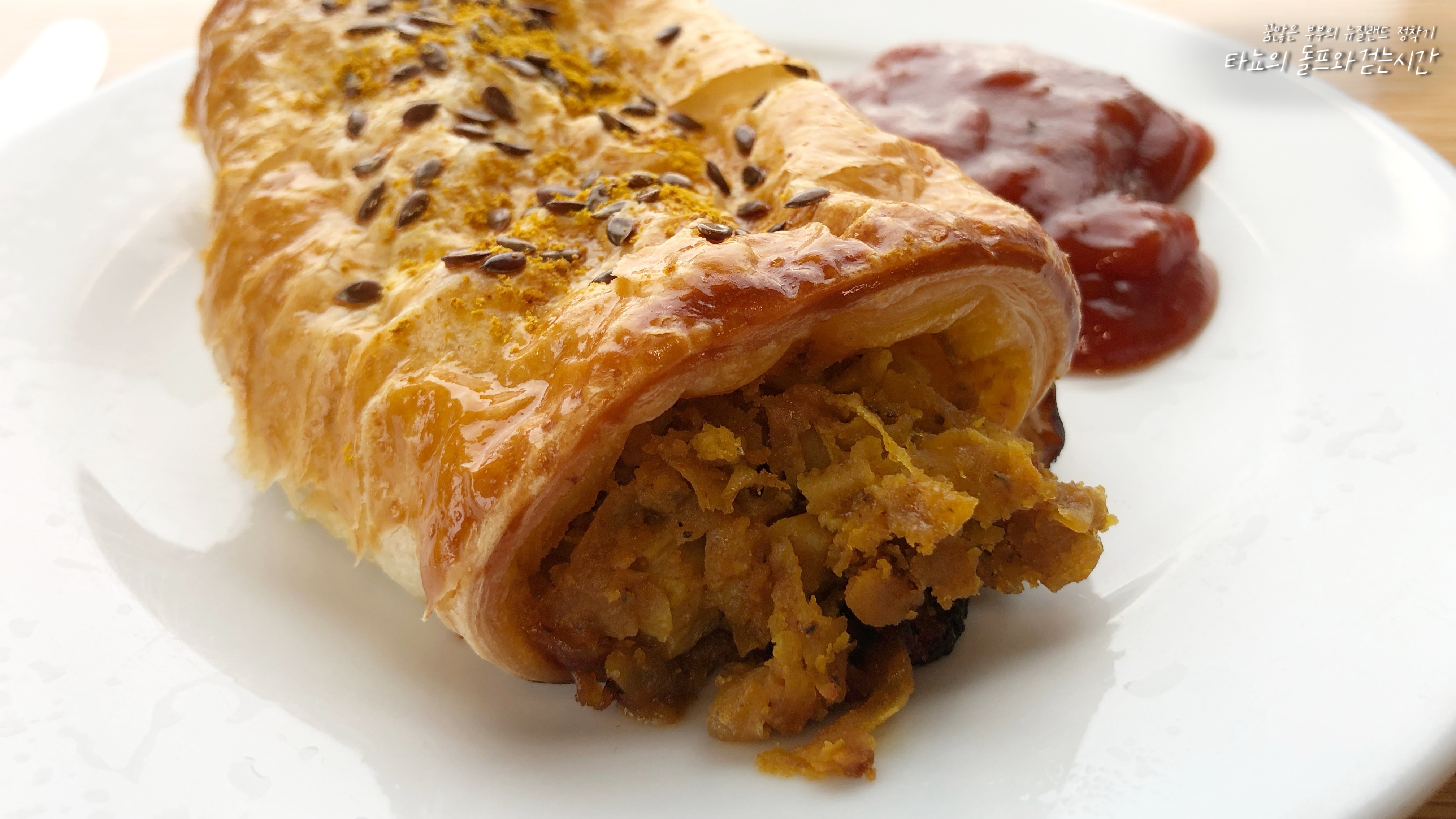커리 스파이스드 롤과 플랫화이트입니다. 한국 카레와는 조금 다른 맛의 인도 커리가 들어가 맛도 향도 묵직한 편입니다.