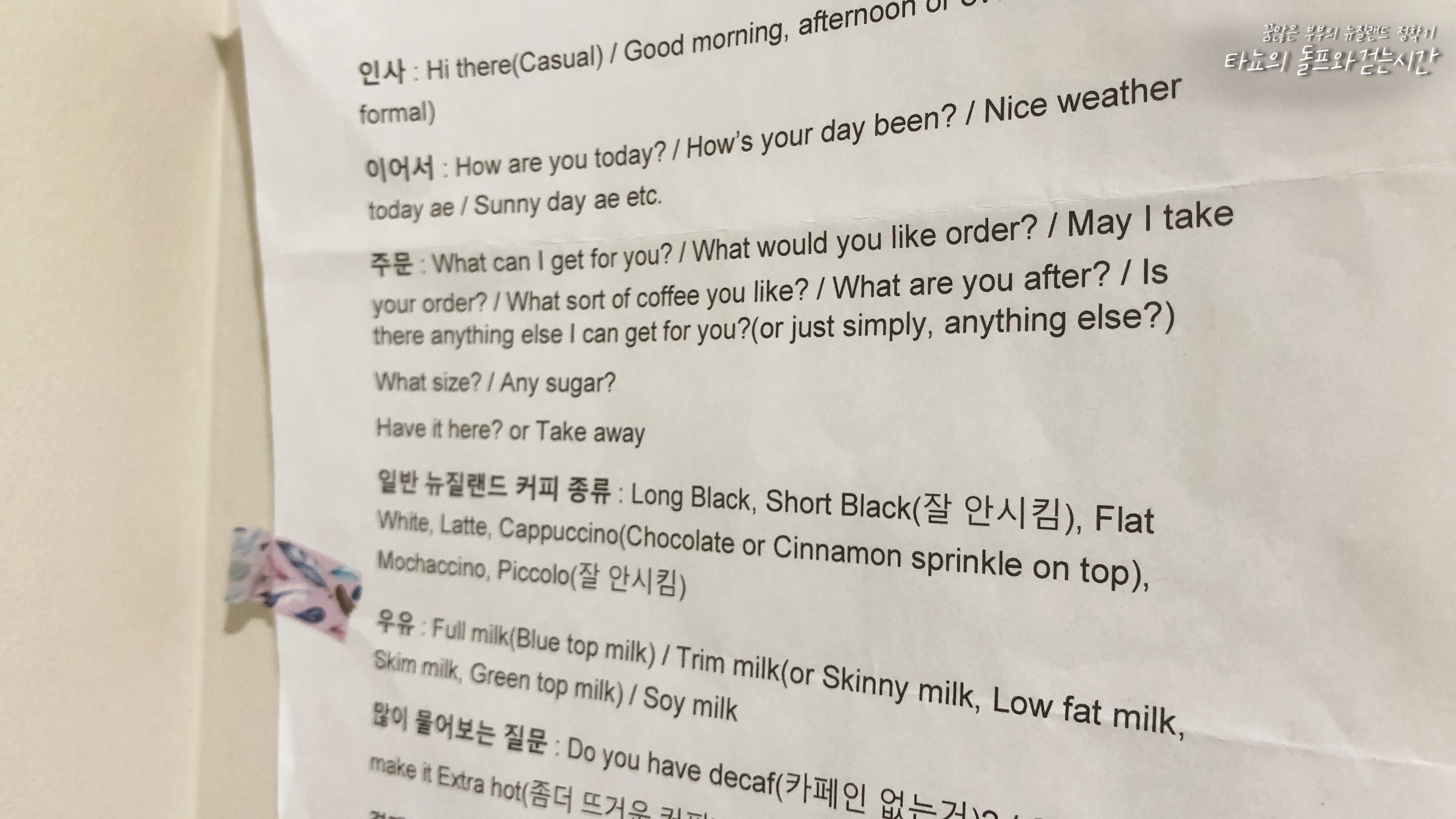 이 종이는 뉴질랜드에서 꽤 오랜시간 카페 일을 했던 가까운 동생에게 카페에서 주로 쓰는 문장들을 적어달라고 했던 종이예요. 처음에는 여기 있는 문장만 달달 외워서 근무를 시작했답니다. 사실 커피 주문에서는 여기 있는 문장만 외워도 충분히 근무가 가능하죠. 하지만 실전에서는 이 외에도 스몰 톡 스킬이 필요했던 것 같습니다. 친한 척 농담도 던지고 일상의 주제를 가지고 대화를 해야 하는데 이런 것들이 많이 어려웠던 것 같네요. 약간 뻘쭘하다고 할까요? 하하. 어쨌든 뉴질랜드 카페 분위기를 1도 몰랐던 제게 큰 도움이 되었던 문장들입니다.
