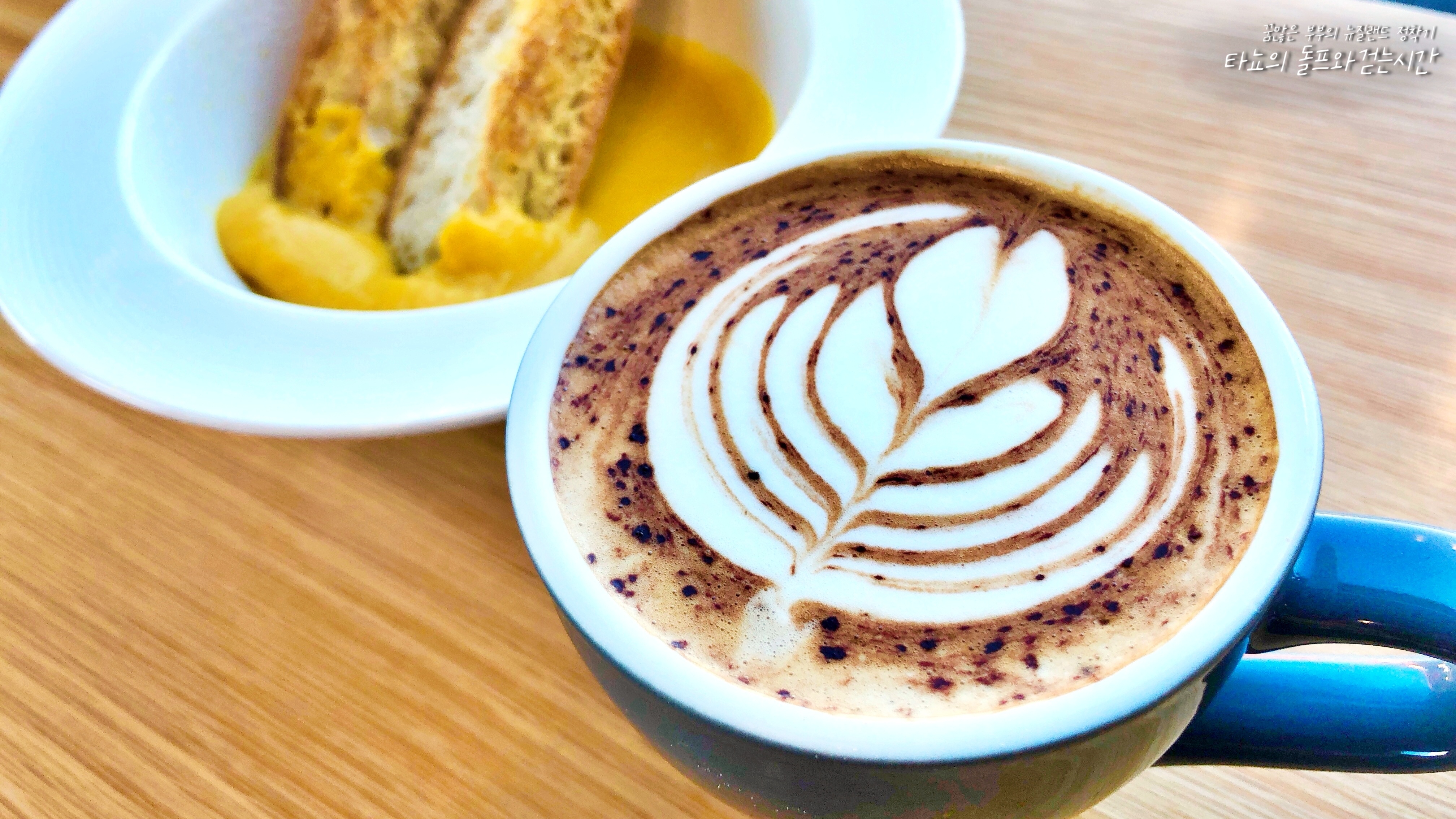 보통 브레이크 때는 웬만하면 플랫화이트 싱글 샷으로 마셨던 것 같네요. 평소보다 피곤하거나 힘들어서 달콤한 맛이 생각나는 날이면 초코 파우더 듬뿍 뿌려서 마셨어요. 크리미 펌킨 수프에 치아바타 빵 곁들였습니다.