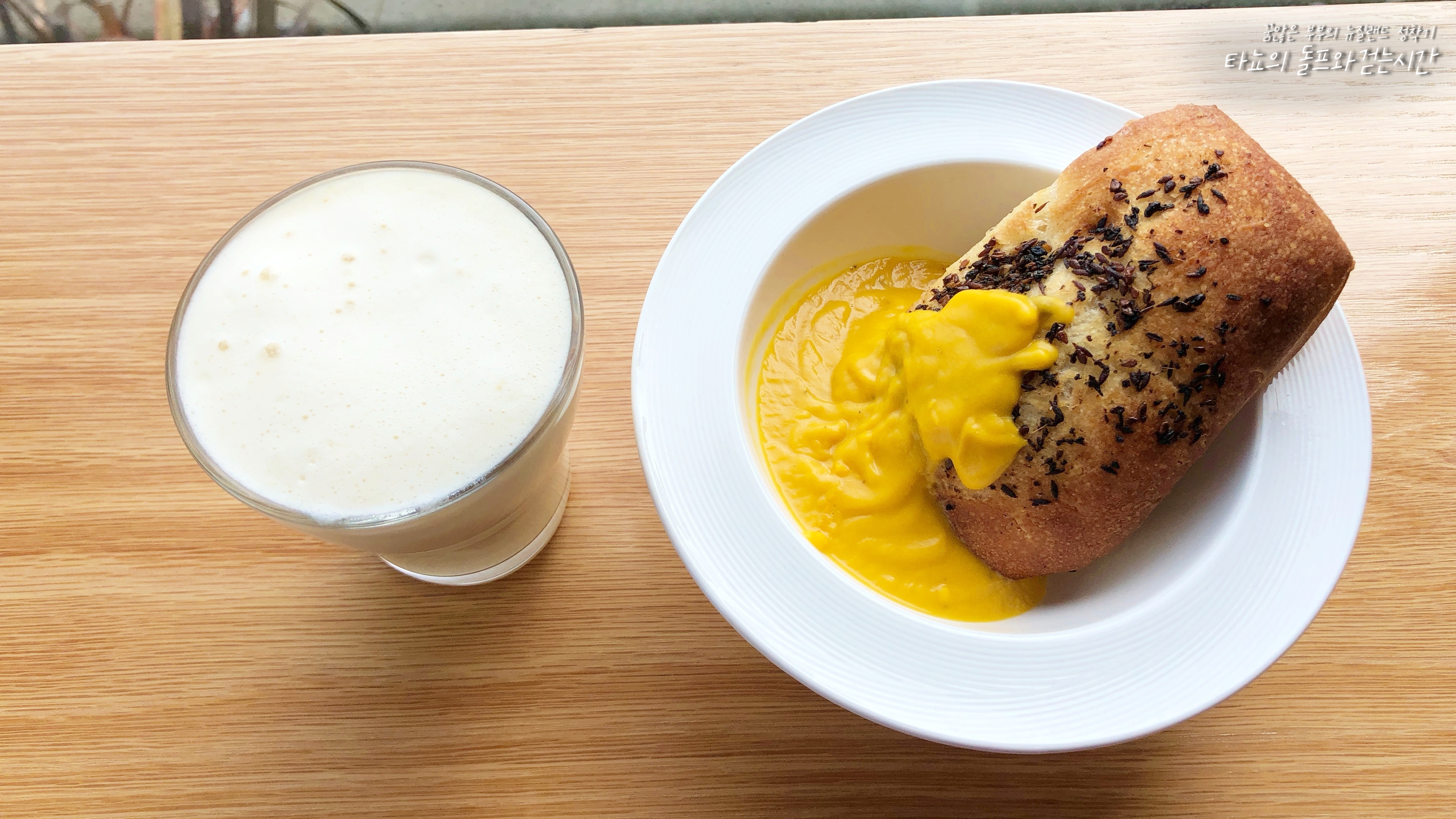 마침 바나나 스무디 주문이 들어와서 만들었는데 생각보다 양이 조금 많아서 남은 것을 제가 먹었습니다. 터키쉬 브래드와 크리미 펌킨 수프 함께 먹었어요.
