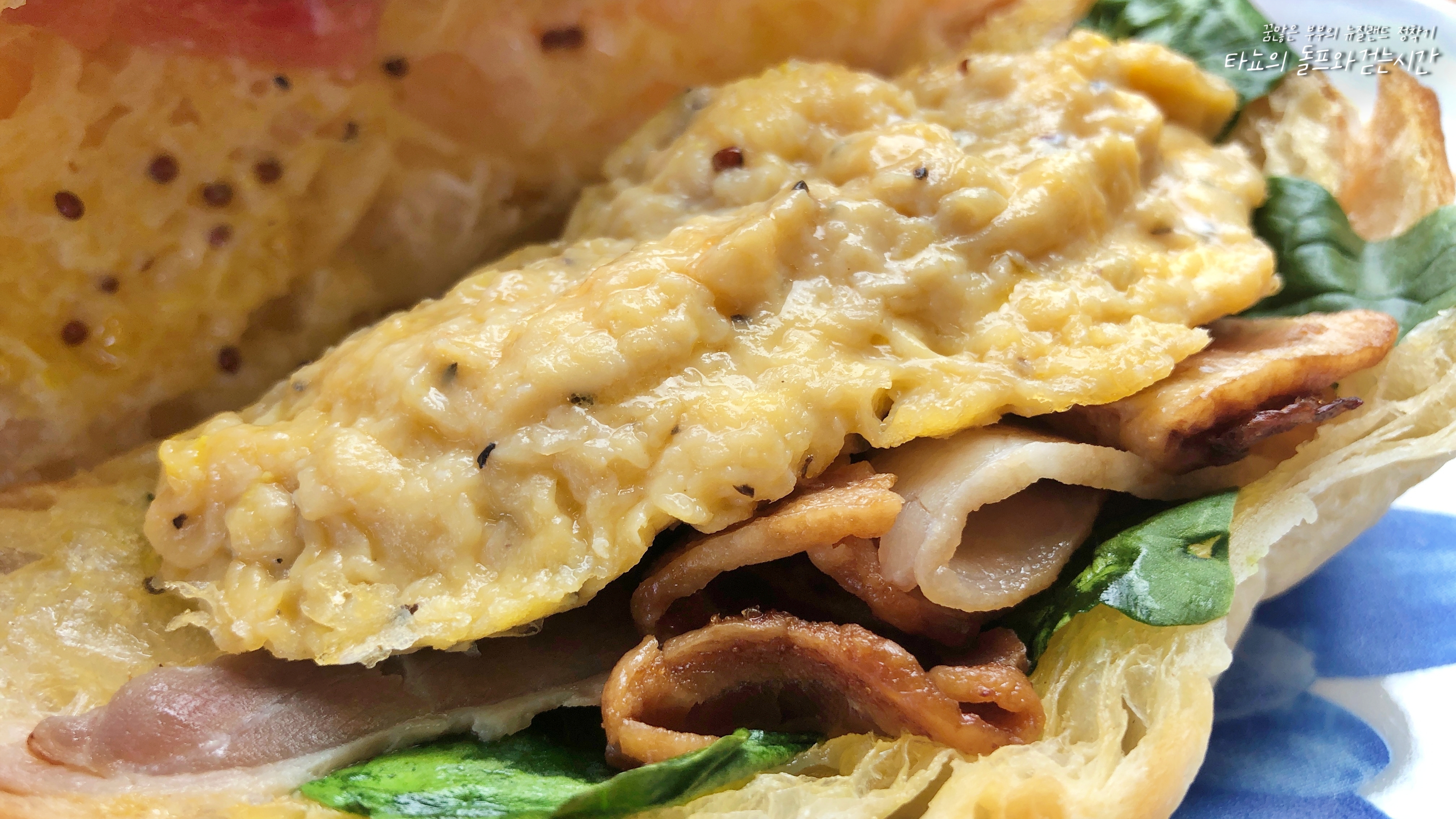 베이컨과 스크램블 에그, 시금치, 토마토가 들어간 크로와상에 플랫화이트