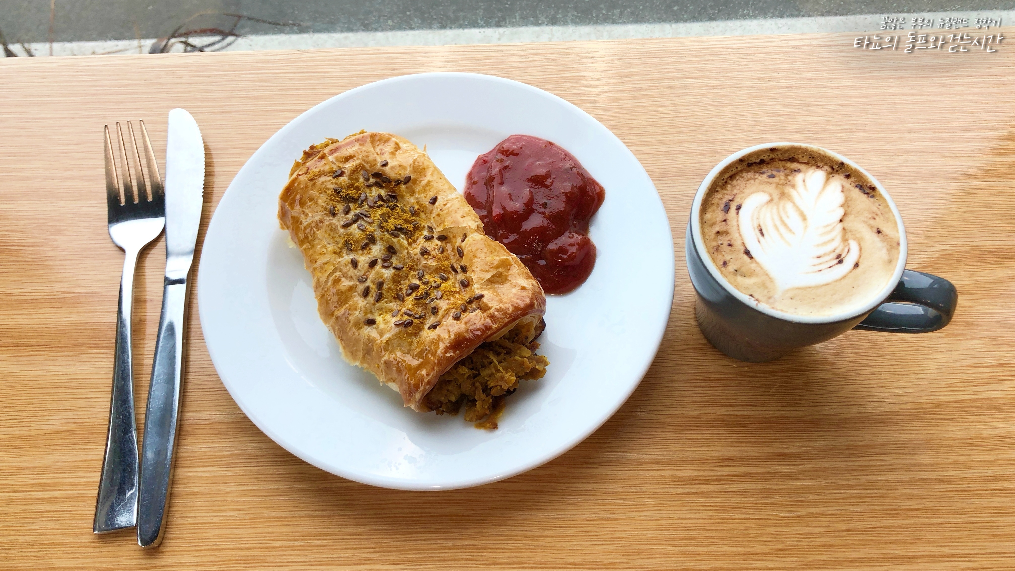 커리 스파이스드 롤과 플랫화이트입니다. 한국 카레와는 조금 다른 맛의 인도 커리가 들어가 맛도 향도 묵직한 편입니다.