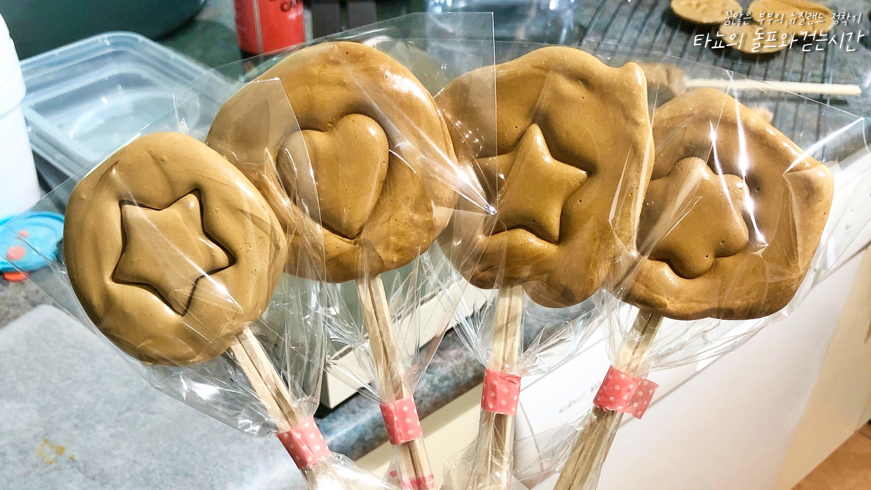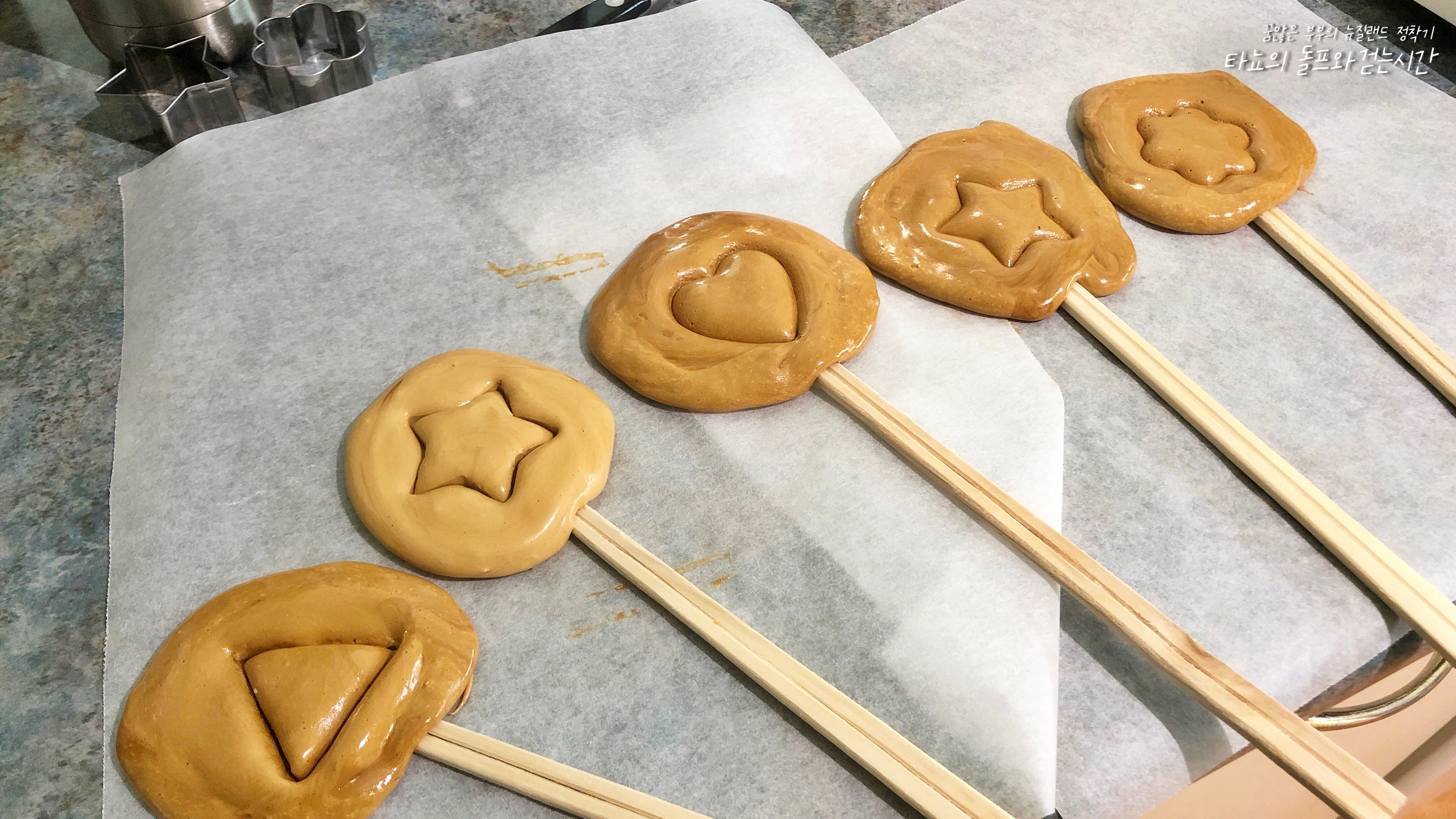 집에서 쓰던 국자를 꺼내 호떡 누르개로 똑같이 만들었지만 역시나 실패했습니다. 기름도 바르고 설탕도 뿌렸지만 완전 다 달라붙었어요. 저는 완전한 마스터는 아닌가 봅니다. 장비빨에 엄청난 영향을 받는 보통 사람이었죠. 이게 정말 뭔가 있나 봅니다. 결국 호떡 누르개를 사용하지 않고 달고나를 최대한 촉촉하고 부드럽게 만든 뒤 손잡이가 달린 사탕 형태로 만들어서 쿠키 틀로 모양을 찍어봤습니다.