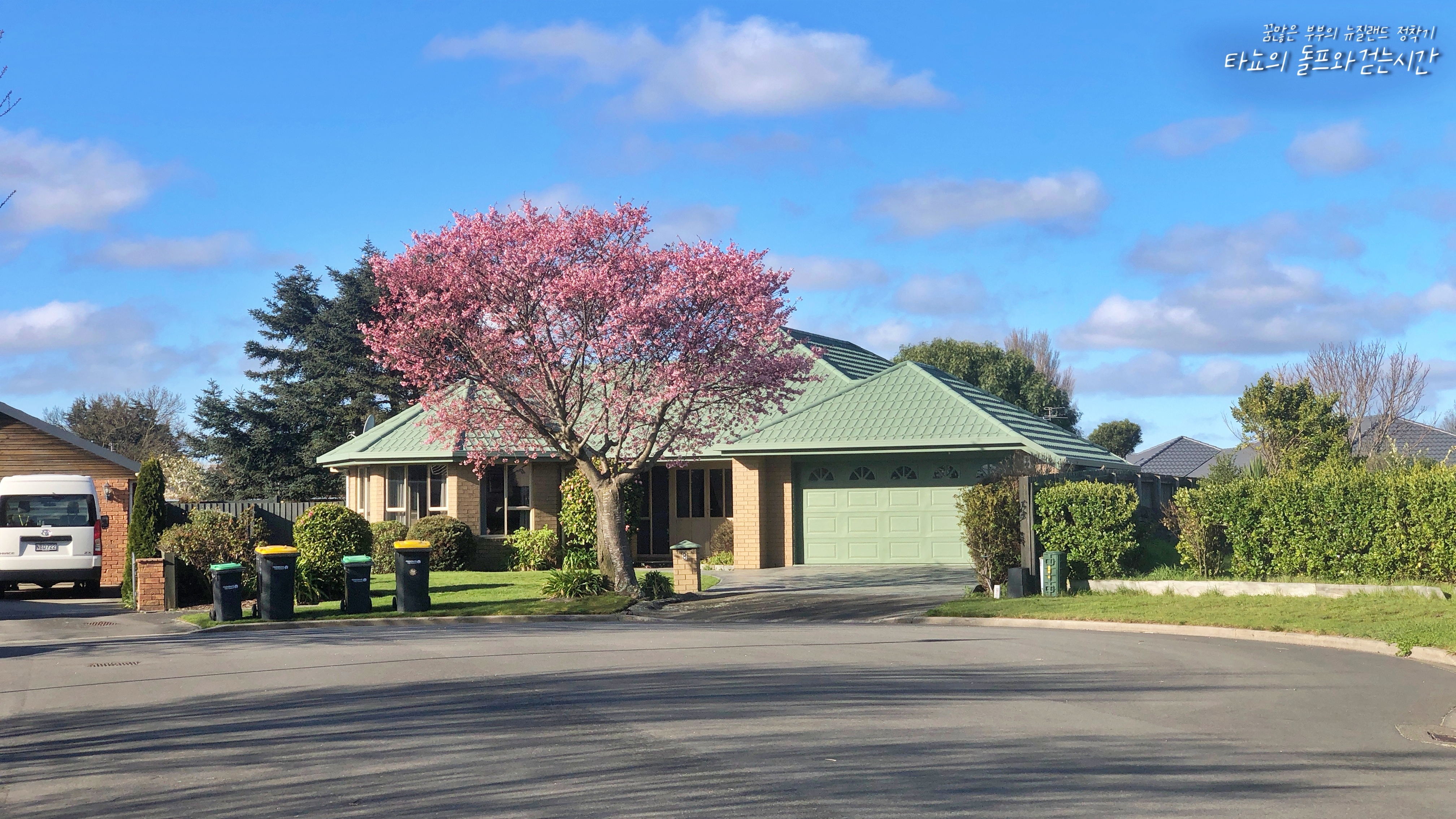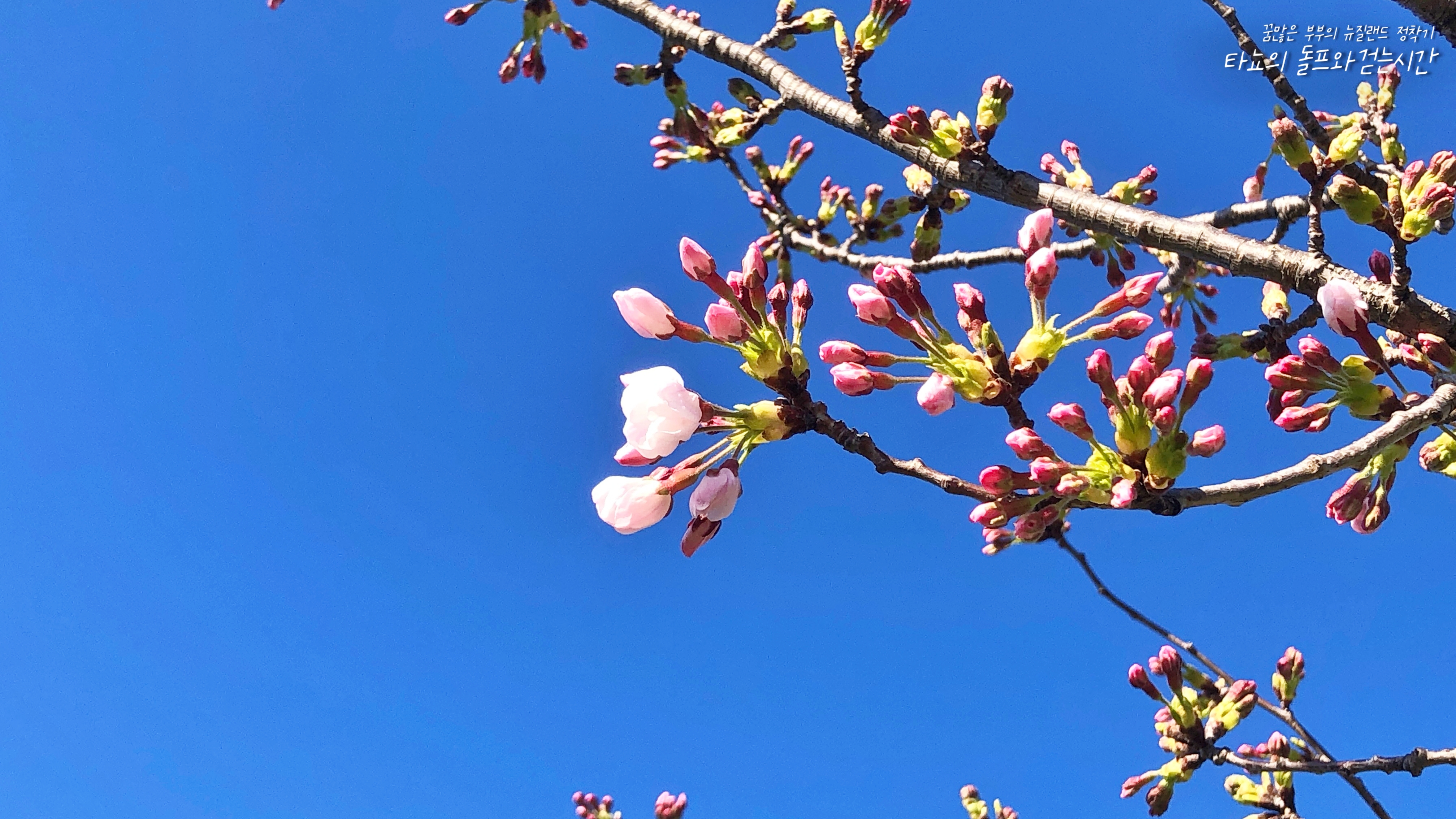요즘 저희 동네는 보는 맛이 있습니다. 크라이스트처치는 뉴질랜드에서도 '가든시티'로 유명한 지역인데요. 실제로 높은 데서 보면 하나의 커다란 정원 같은 느낌이 듭니다. 건물보다 나무나 숲이 더 큰 것 같기도 하고요. 집집마다 꽃나무가 다양한 색상으로 피어나니 봄과 여름이 되면 알록달록 참 아름다워요. 앞마당에서 하늘을 보니 꽃봉오리가 보이고 하늘은 정말 푸르네요. 나이 들면 들수록 꽃 사진 많이 찍는다는데... 저도 점점 늙어가나 봅니다.