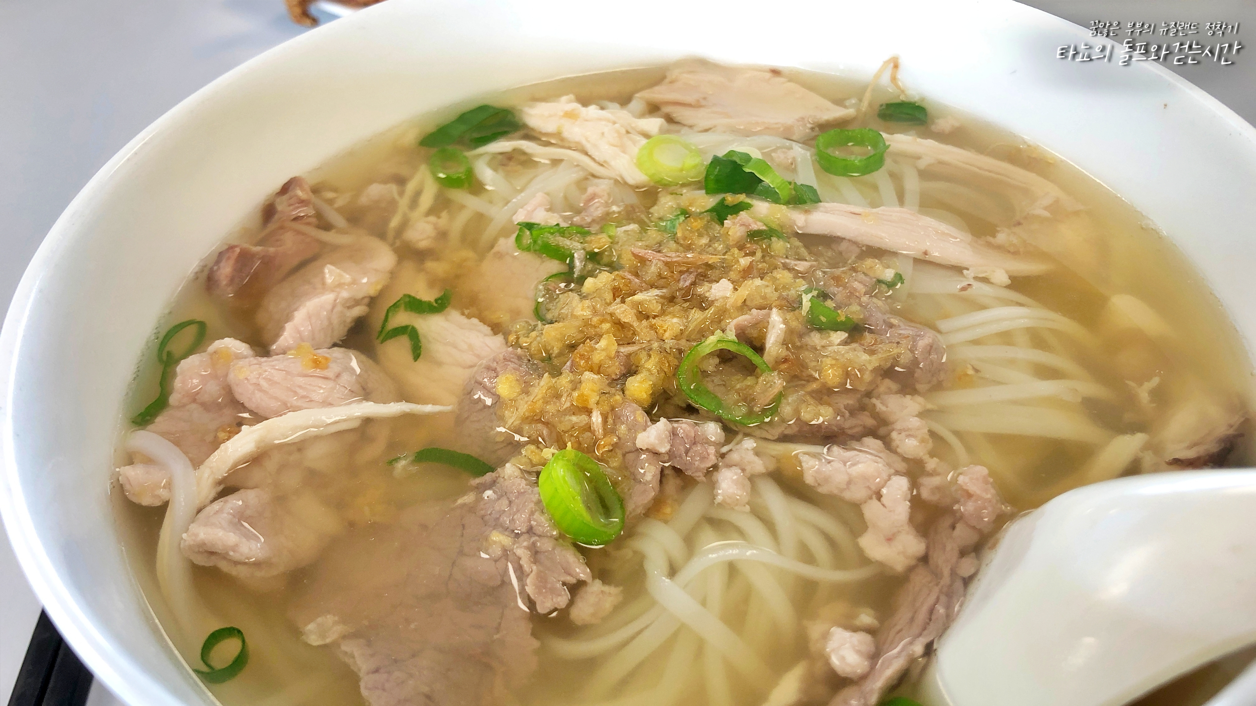 저녁에는 신랑과 함께 오랜만에 리카톤에 있는 캄보디안 쌀 국숫집에 갔습니다. 저희는 늘 가성비를 따지는 편인데요. 맛있고 저렴하고 양이 많은 이 3박자가 굉장히 중요합니다. 여긴 딱 그 3박자에 미치는 곳이고요. 콤비네이션 쌀국수를 주문했습니다. 닭고기, 소고기, 돼지고기가 모두 들어가 있는 쌀국수예요. 숙주는 아래에 깔려 있고 고수는 좋아하지 않아서 올리지 않았습니다.