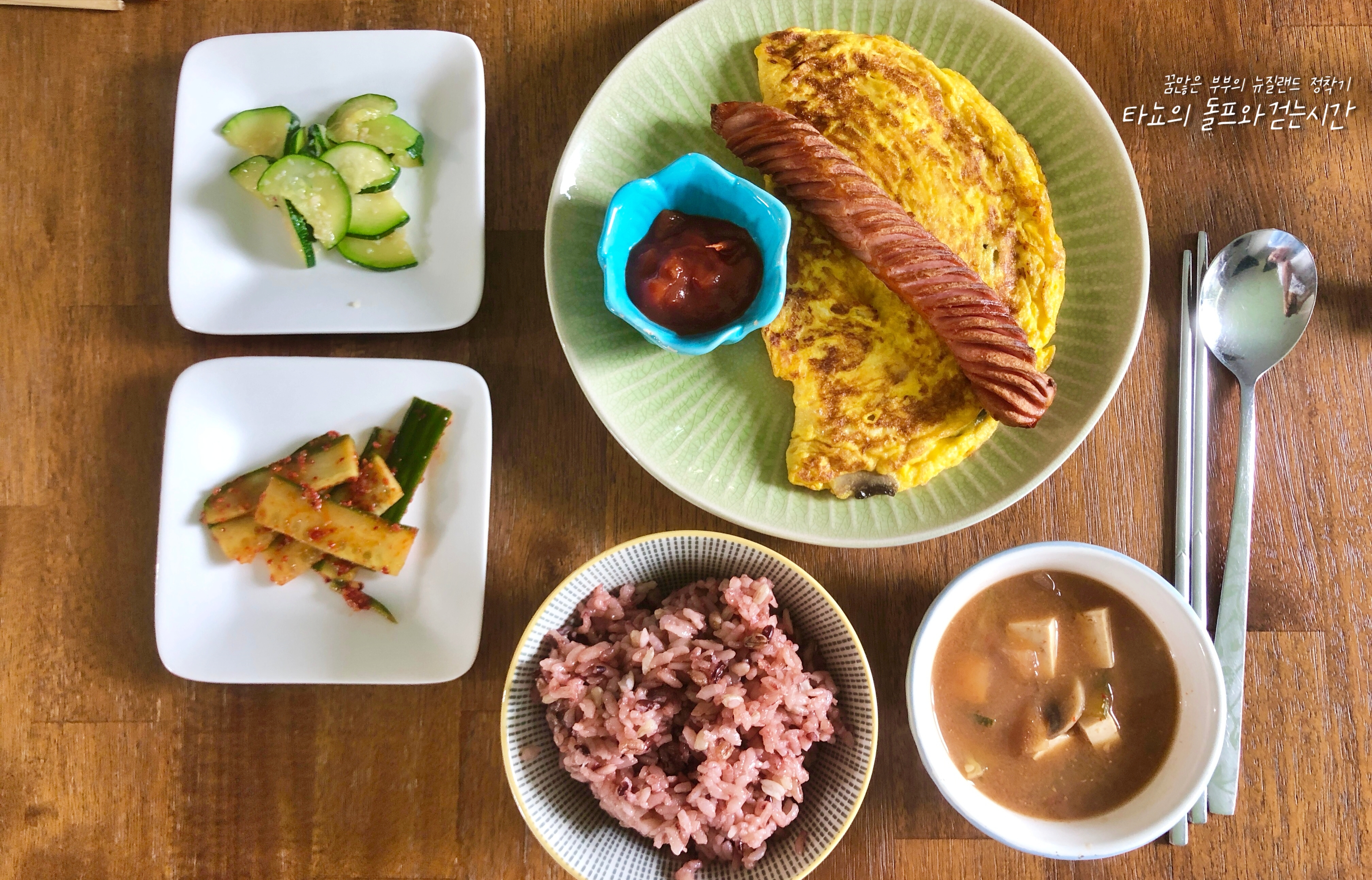신랑을 위해 차린 1인 밥상입니다. 저는 이때 배가 불렀던 것 같아요. 호박 나물, 오이 무침, 오믈렛, 소시지, 된장국 덜어서 차렸습니다.