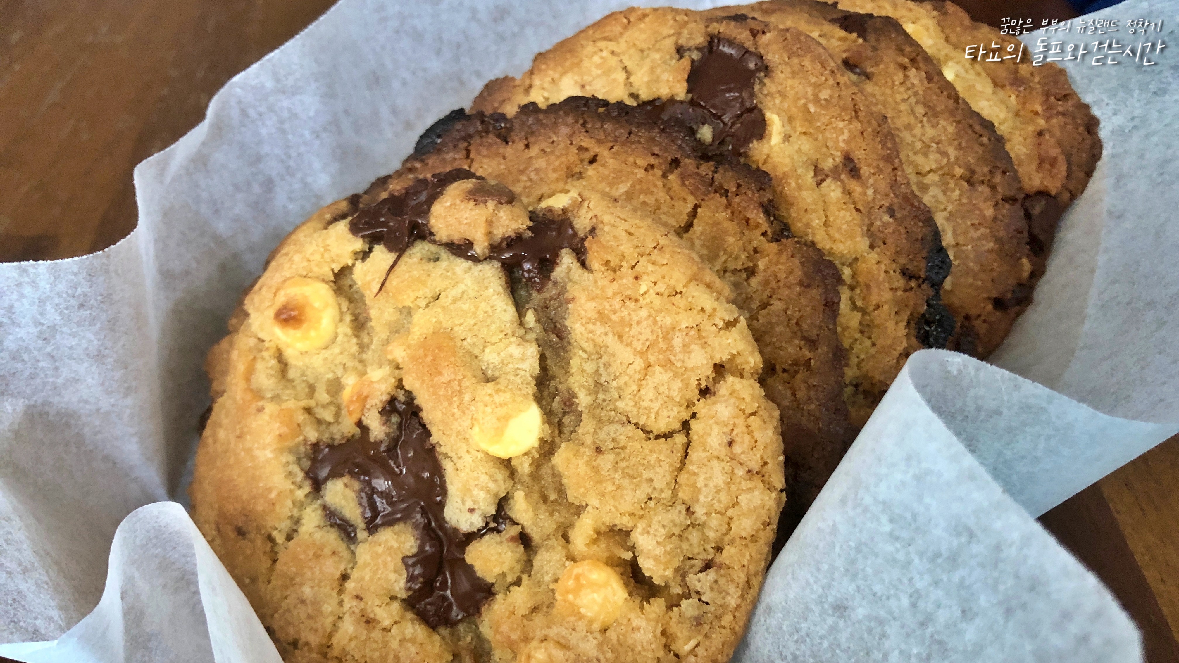 미국 스타일로 촉촉하게 구운 초코칩 쿠키입니다. 요건 선물용으로 구운 것이라 가장 큰 쿠키 2조각만 남기고 모두 포장했어요.