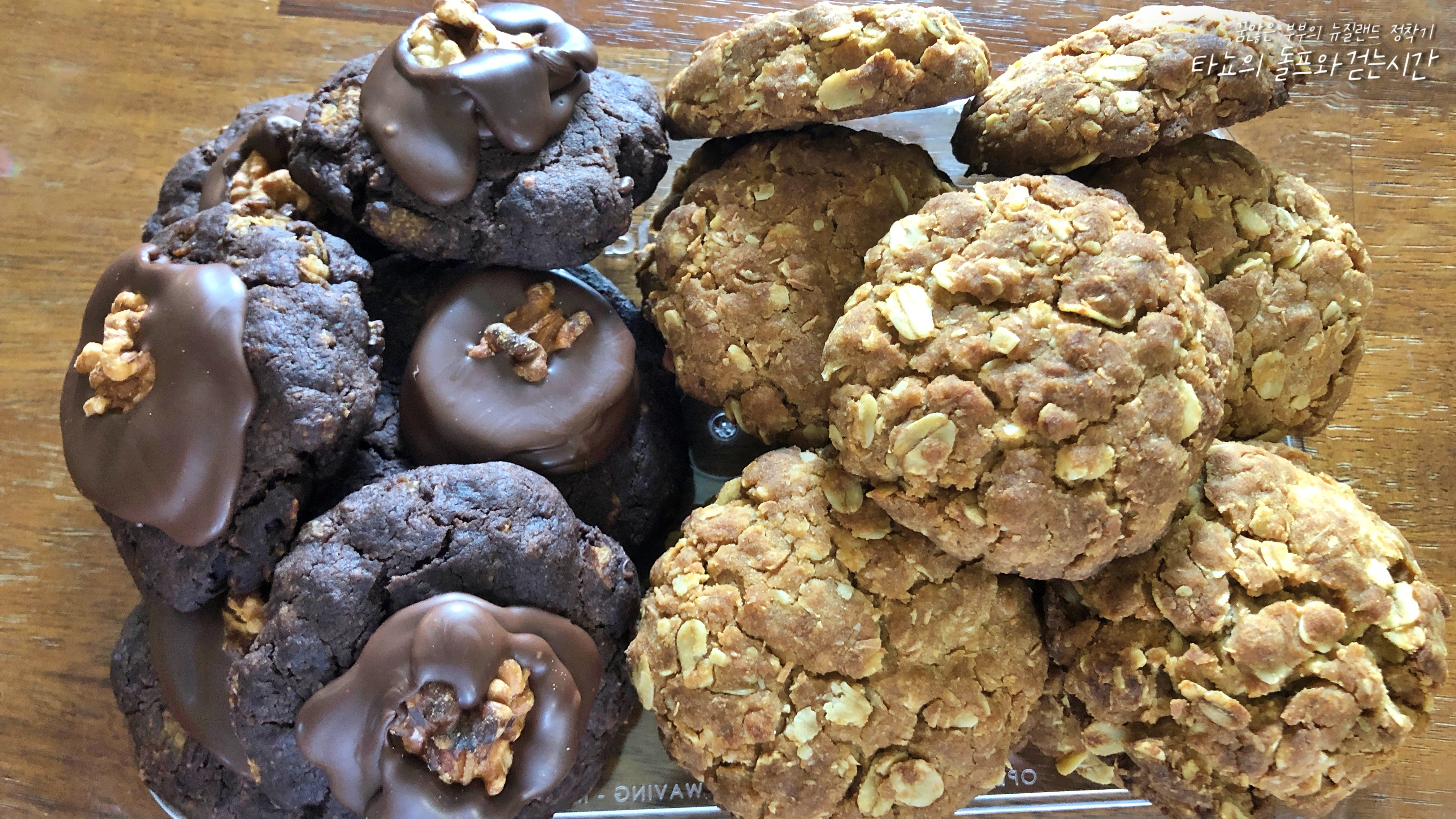 뉴질랜드 카페에서 기본적으로 판매되는 키위들이 가장 사랑하는 쿠키 2종입니다. 검은색이 아프간, 갈색이 안작인데요. 아프간은 초코맛이 진하게 느껴지고 안작은 오트와 코코넛이 듬뿍 들어가 색다른 달콤함을 보여줍니다. 이렇게 만들어두면 새벽 출근하는 신랑이 하나씩 먹고 출근합니다. 특히 안작은 오트가 들어가서 아침에 먹으면 더 든든하다고 하네요. 이렇게 넉넉하게 만들어두면 2주 정도는 간식 걱정이 없습니다.