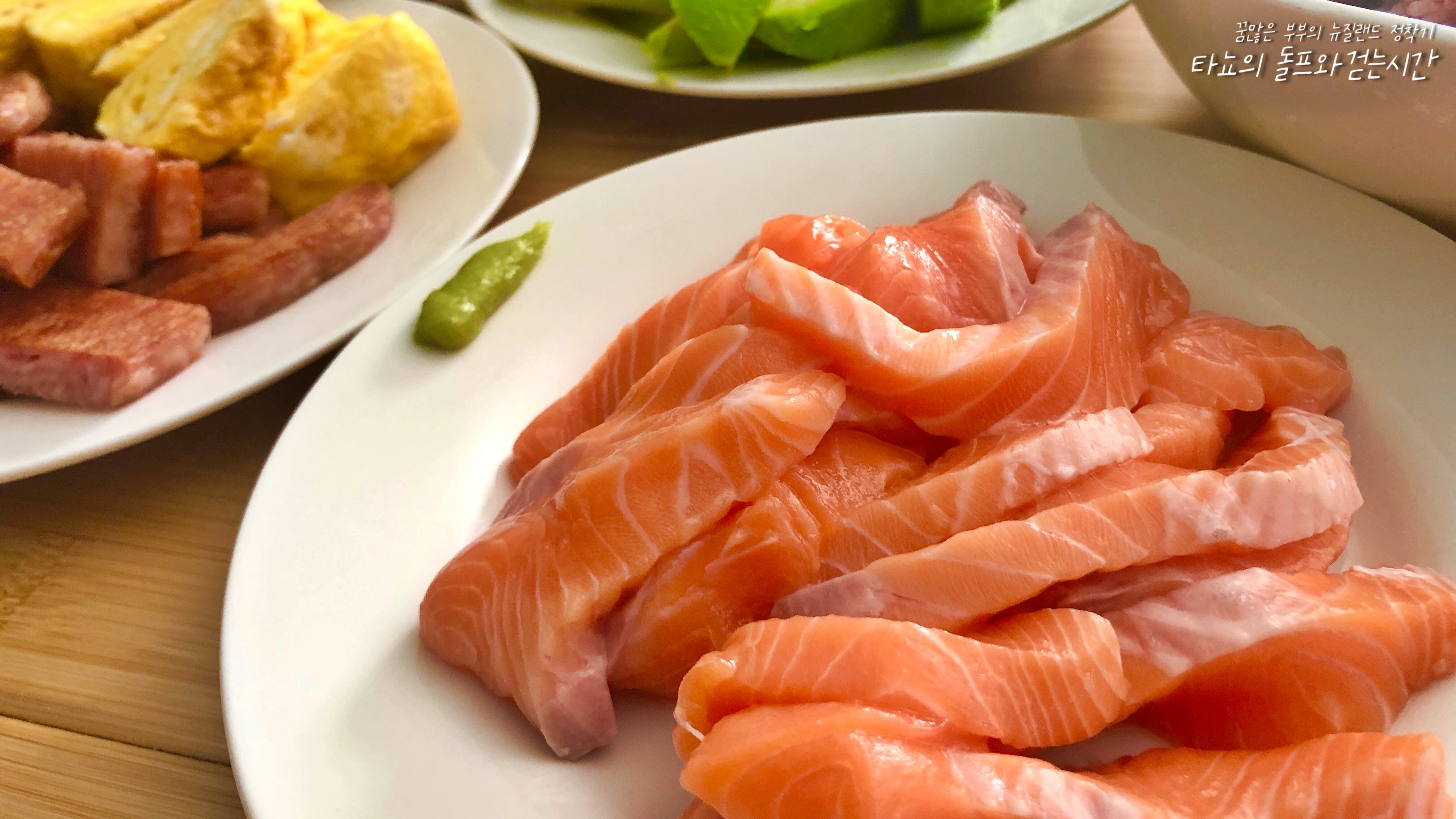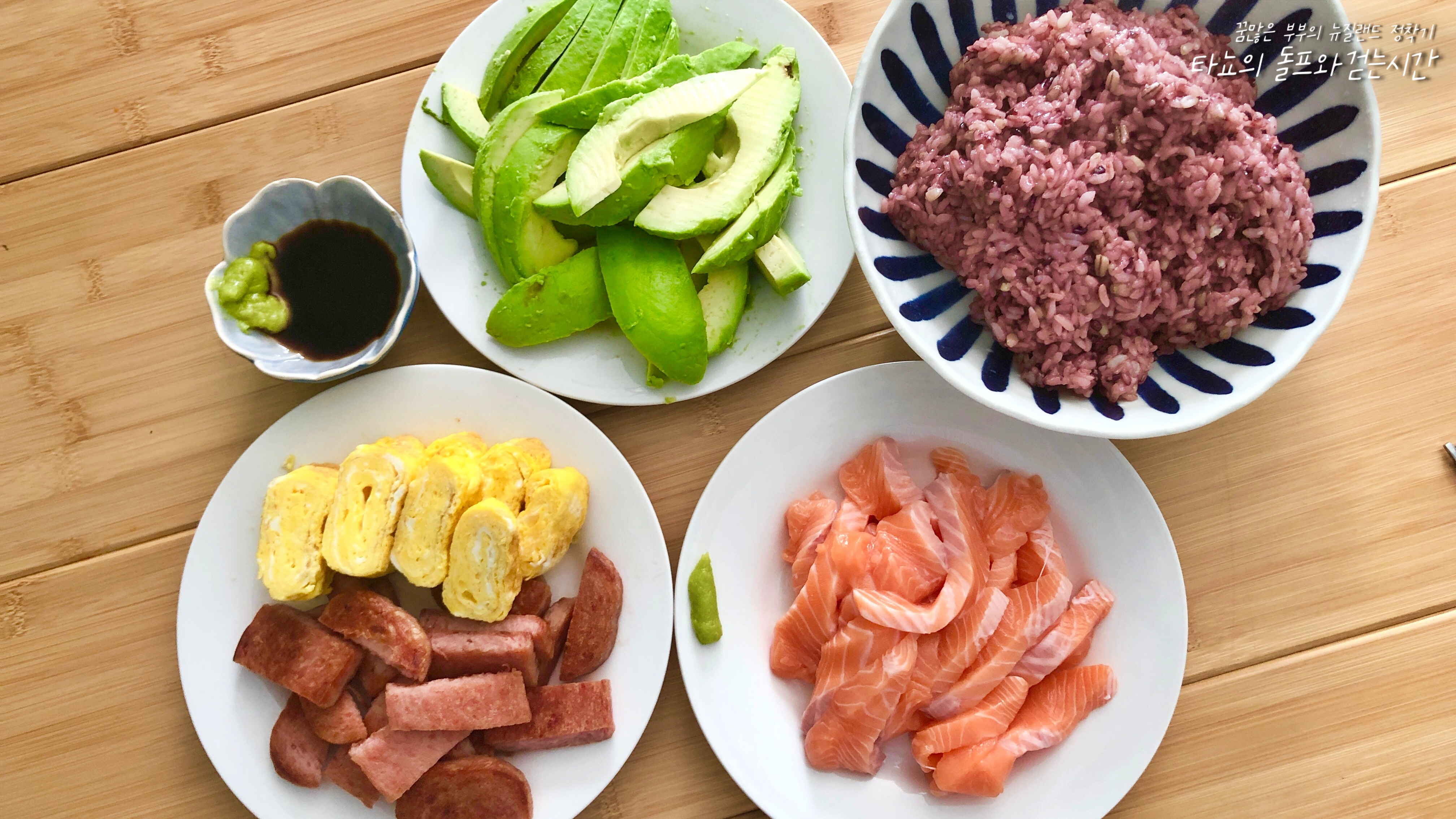 신랑과 집에서 편하게 먹을 때는 초밥을 따로 잡지 않고 이렇게 그냥 덩어리로 준비합니다. 단촛물에 간을 맞춘 밥, 아보카도, 적당한 크기로 자른 연어, 스팸, 달걀말이, 고추냉이와 간장까지 준비하면 최고의 만찬이죠. 여기에 마른김까지 있으면 더 좋고요.