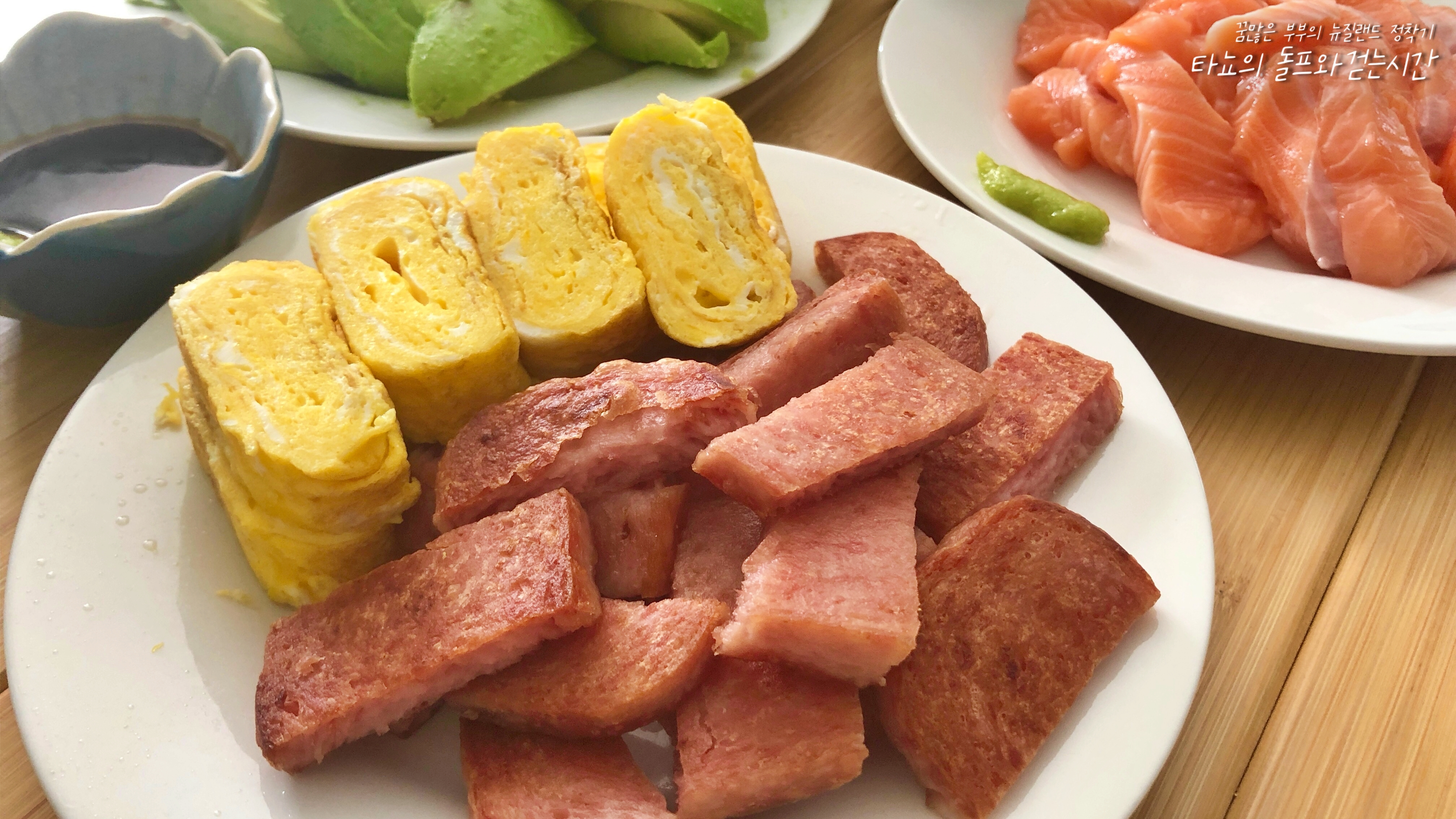신랑이 좋아하는 달걀말이와 스팸도 함께 준비했습니다. 제가 연어를 흡입하는 동안 신랑은 스팸을 흡입...