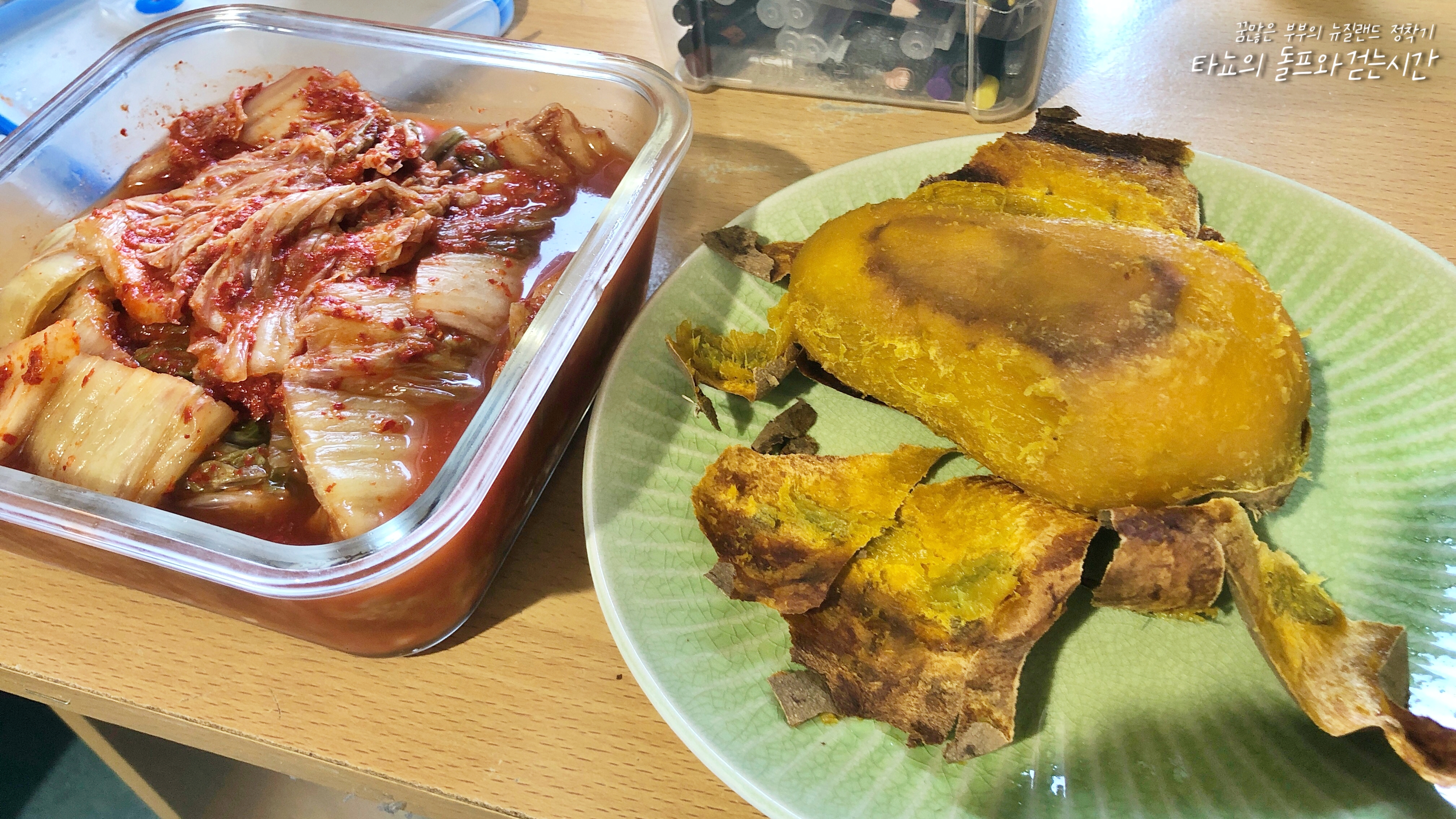 '골드 쿠마라'입니다. 뉴질랜드에서는 고구마를 '쿠마라'라고 부르는데요. 딱 이 시즌에만 잠깐 나오는 상품이 바로 골드 쿠마라입니다. 다양한 종류의 쿠마라가 매 시즌마다 나오지만, 한국에서 먹던 달콤하고 촉촉한 군고구마의 맛을 가장 닮은 것이 바로 이놈입니다. 이게 제일 맛있어요. 220도로 예열한 오븐에 20분, 한 번 뒤집어서 200도에 15분, 또 한 번 더 뒤집어서 180도에 10분 구워주면 한국 길거리에서 추운 겨울에 먹던 그 군고구마 맛을 느낄 수 있습니다. 김치는 빠질 수 없는 찰떡이지만, 김치 불호인 저희 신랑은 인정하지 않는 맛.