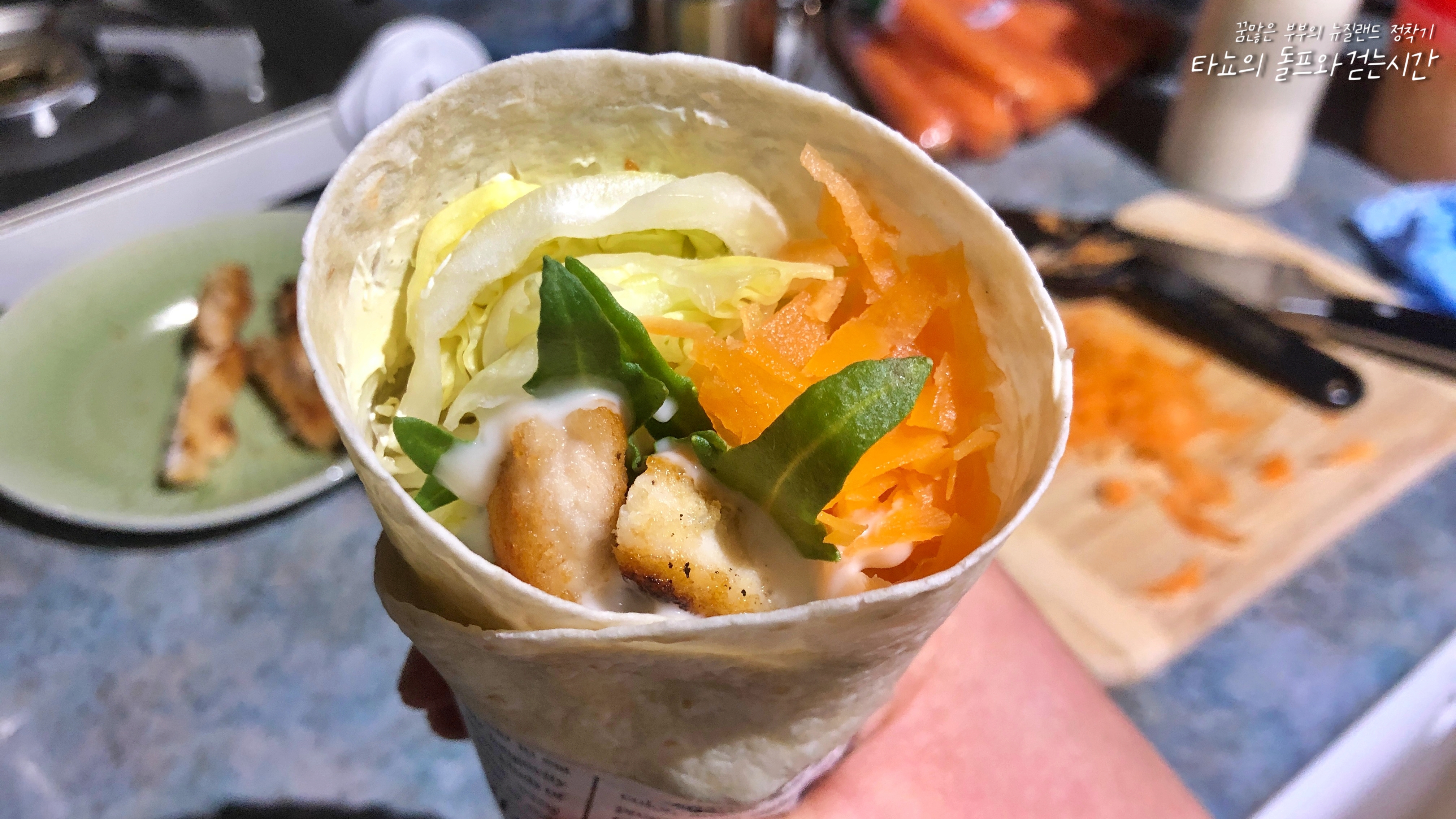 아침에 퇴근하고 돌아왔을 때 배고프면 먹으라고 준비한 아이올리 치킨랩입니다. 카페에서 하루에도 수십 개씩 이런 거 싸서 팔다 보니 이젠 찰떡같이 만드는 치킨랩의 고수.
