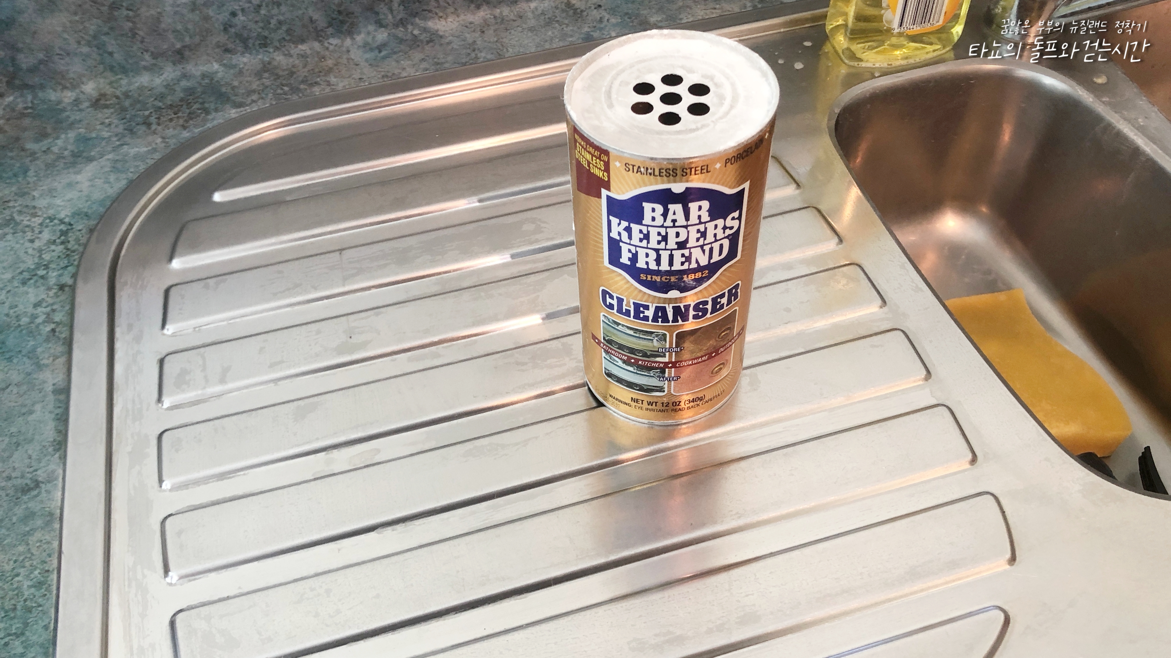 오른쪽 사진에 보이는 저 가루 제품은 최근 인스타에서 굉장히 많이 홍보를 하길래 충동적으로 구입했던 제품인데요. 주로 스텐에 난 얼룩이나 샤워 부스에 난 물방울 얼룩을 지우는데 최적화된 제품입니다. 뉴질랜드에서 렌트 살이를 하다 보면 보통 세입자들이 가장 고생하는 부분이 바로 샤워 부스에 난 물방울 얼룩인데요. 애초에 샤워할 때마다 온 가족이 한마음 한뜻으로 물기를 제거해주는 게 아니라면 이런 제품에 의지할 수밖에 없습니다.