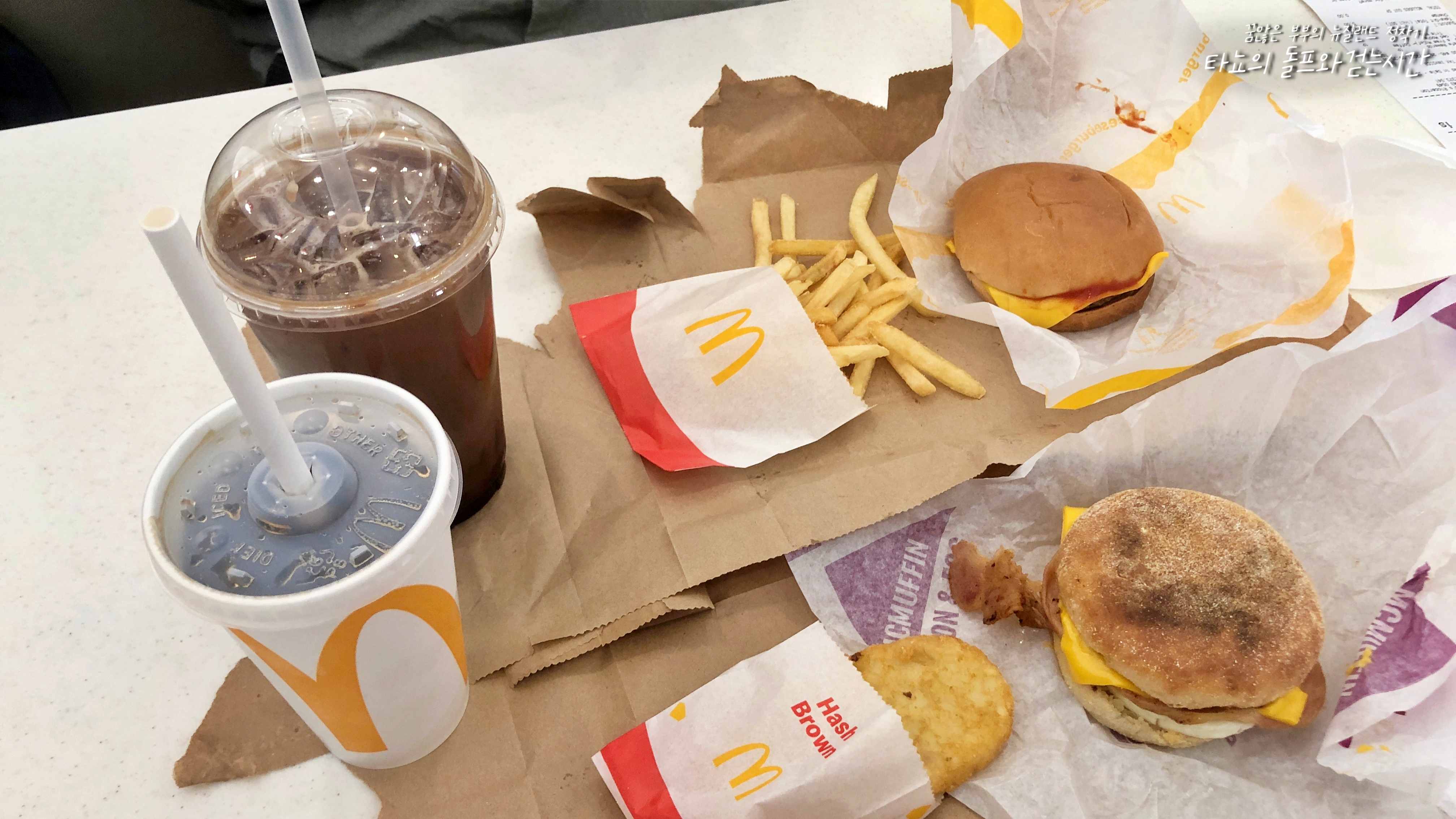 신랑은 아이스 모카, 저는 콜라를 시켰고 각각 치즈버거와 감자튀김, 맥모닝과 해시브라운을 먹었어요. 해롭고 살찌는 맛있는 맛에 감격.