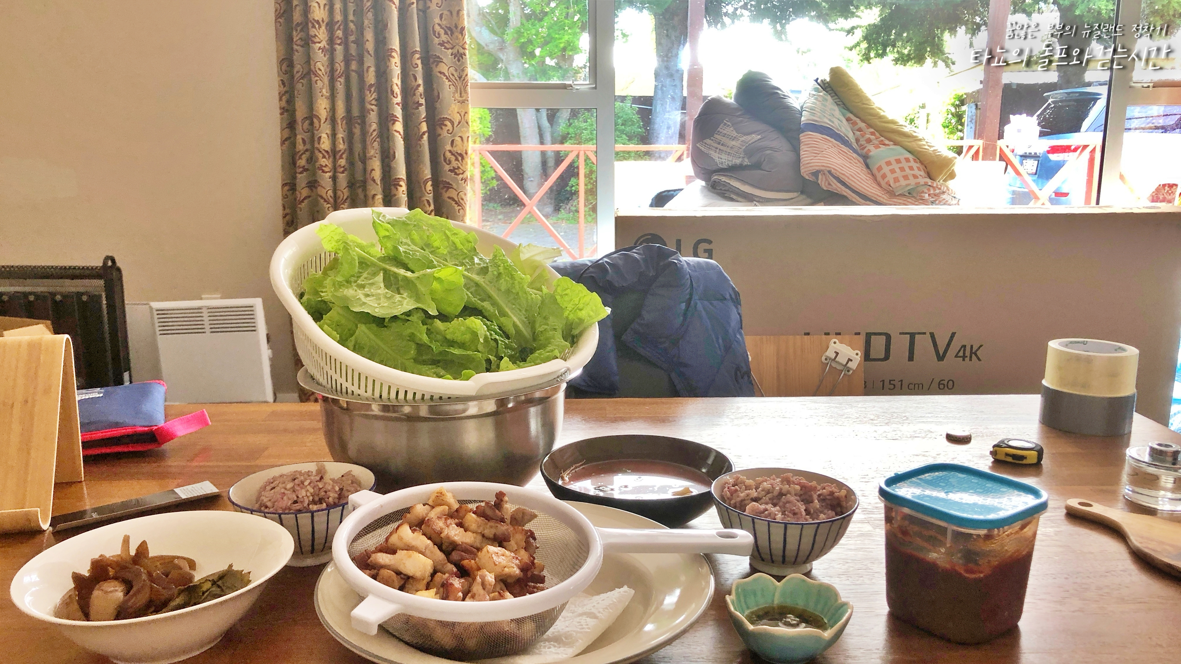 같은 날 점심 겸 저녁으로 먹은 삼겹살, 정리되지 않은 집이라 엉망이지만... 그래도 이사가 끝나서 행복했어요.
