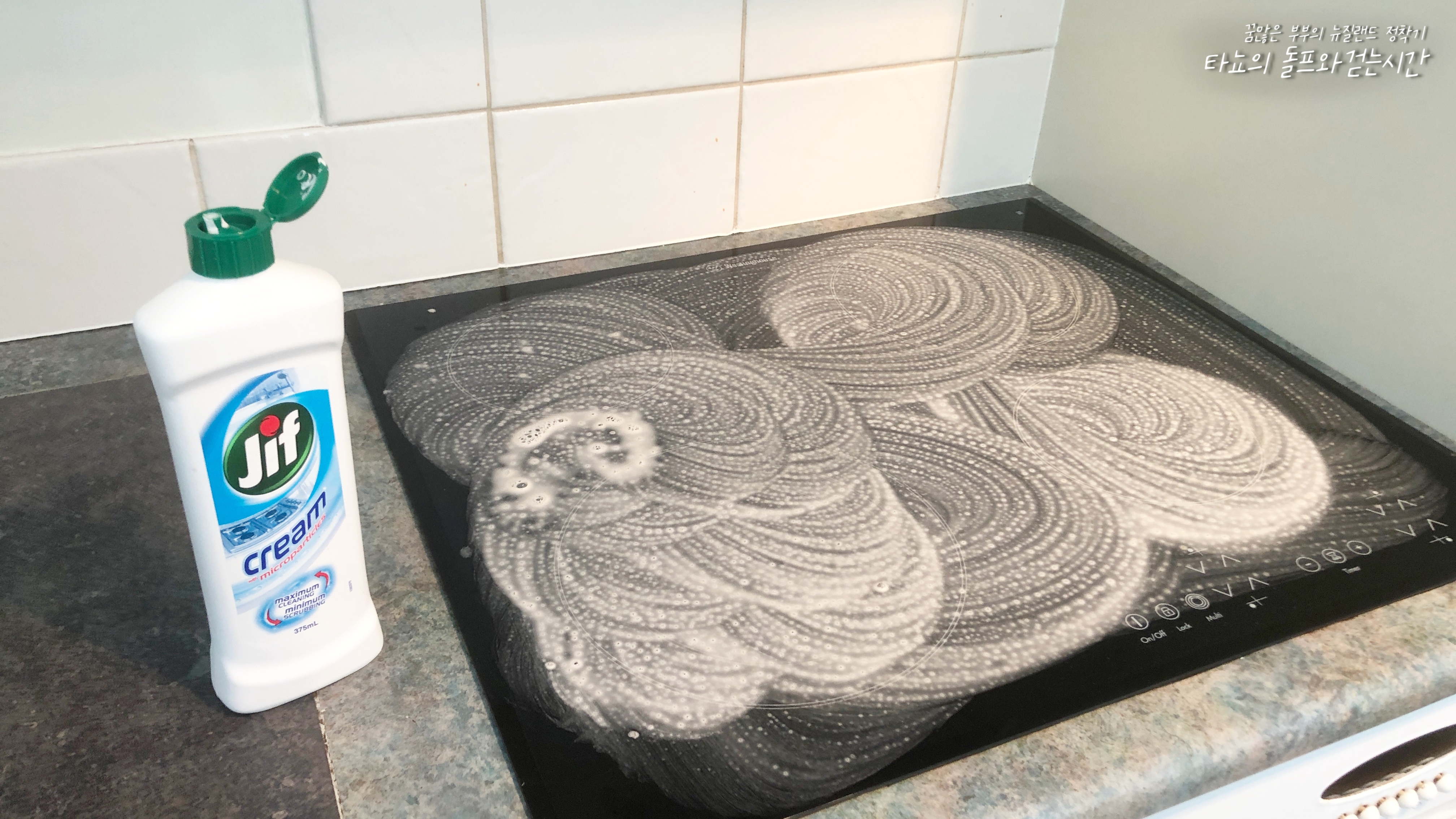 전기레인지 상판도 용도에 맞는 제품으로 꼼꼼하게 닦았습니다. 지프는 굉장히 효과가 좋은데요. 그만큼 독하기 때문에 마스크 꼭 쓰고 사용하는 것을 추천합니다. 이렇게 문지른 다음 10분 정도만 기다렸다가 닦아도 아주 깨끗하게 닦입니다.