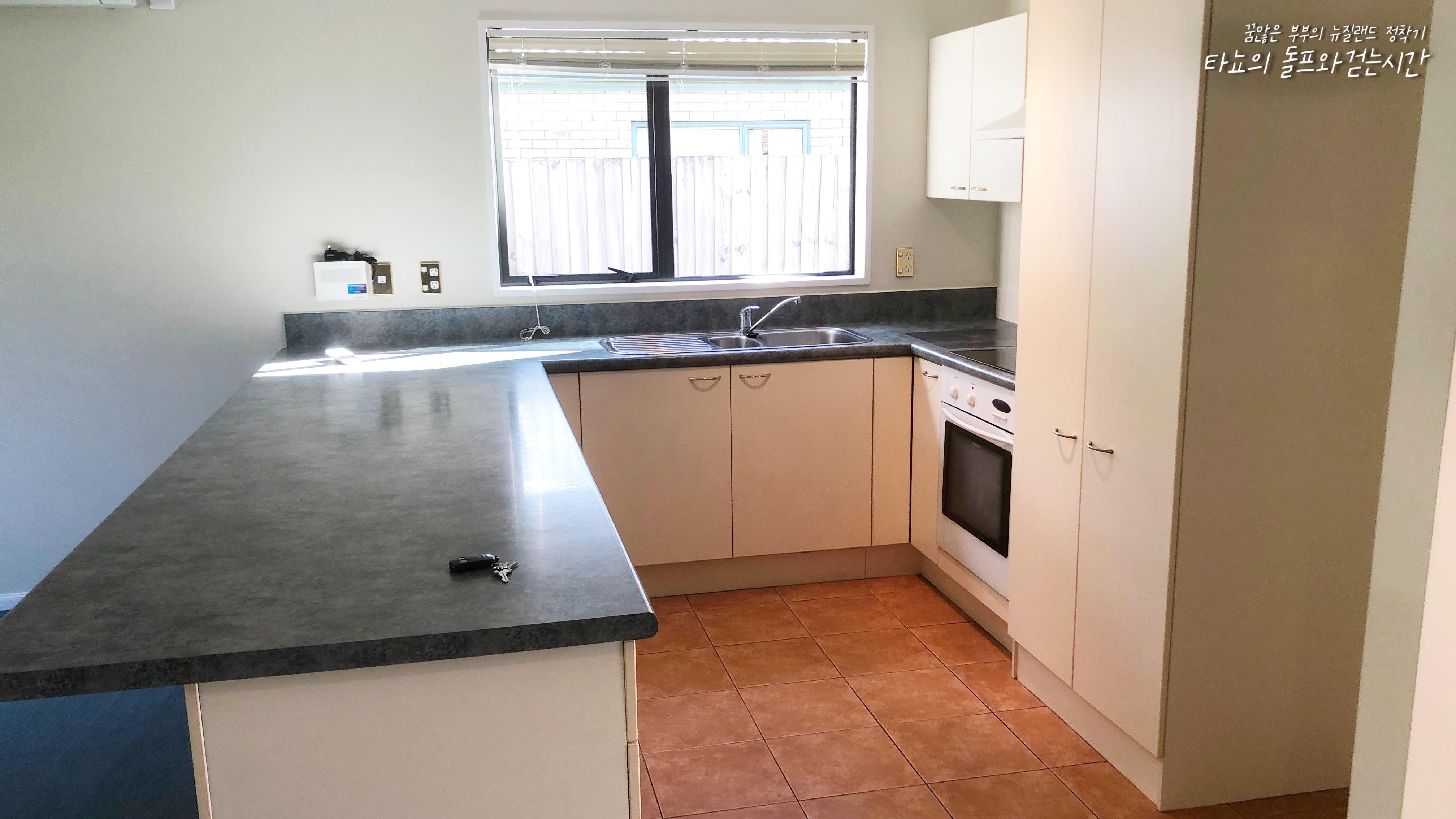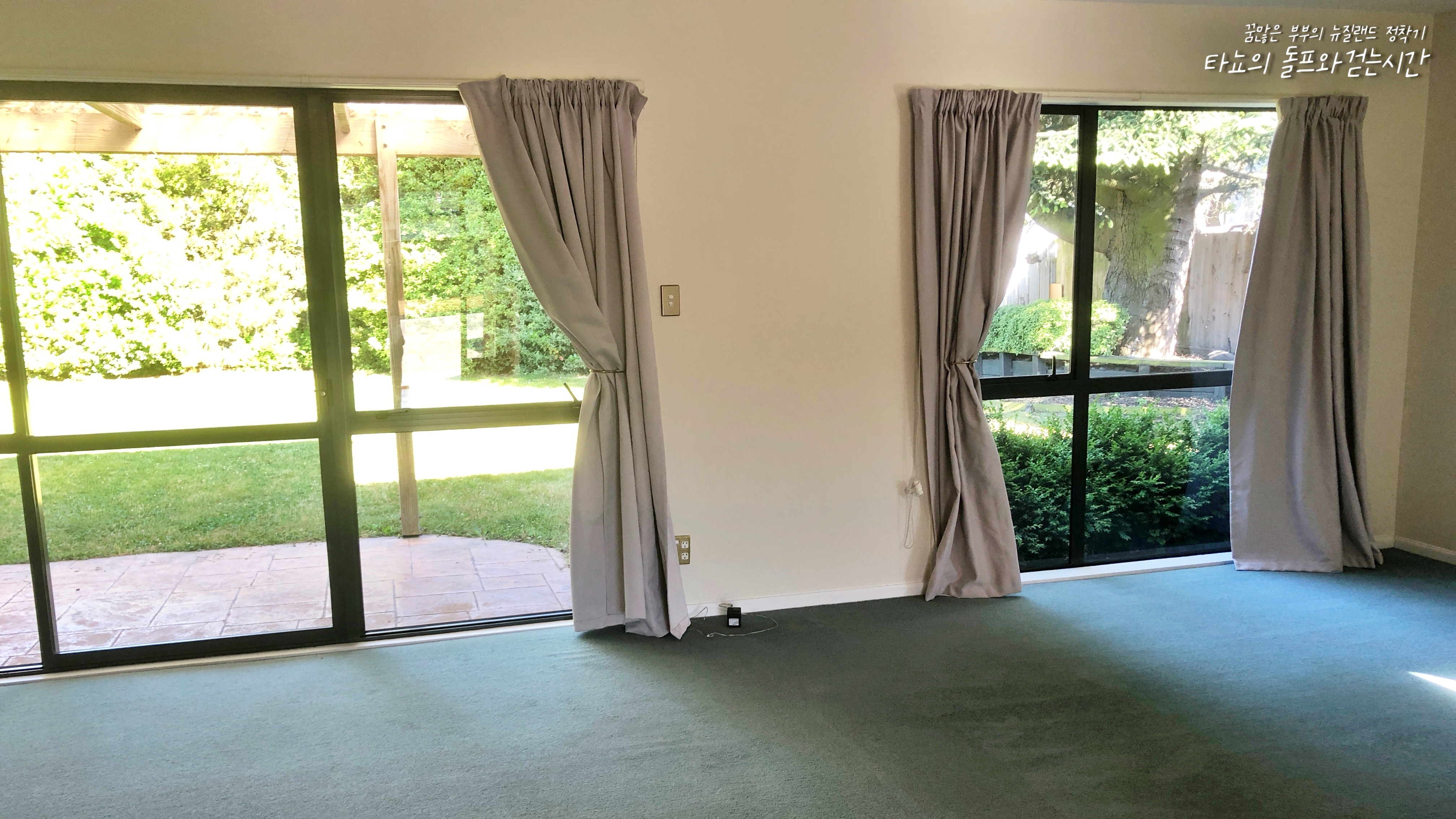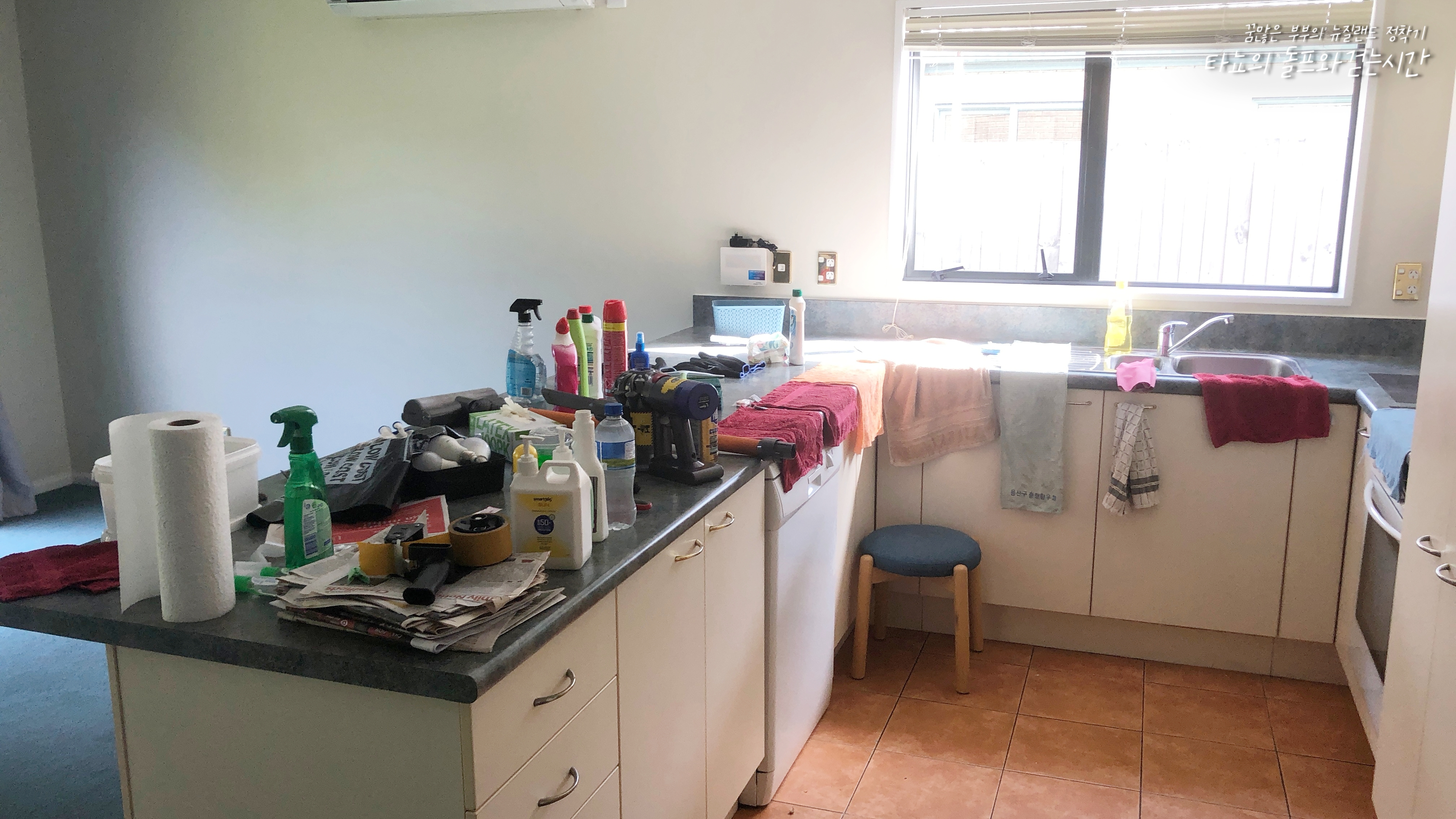 모든 정리가 끝난 거실과 주방의 모습입니다. 거실을 보시면 아시겠지만, 창이 너무 커서 창 닦는데 참 많은 시간이 소비되었습니다. 창은 무조건 안팎을 다 닦아야 합니다. 뉴질랜드에서는 커튼이 굉장히 중요한데요. 커튼에 곰팡이가 피지 않도록 꼭 신경 써야 합니다. 특히 겨울에는 온 동네가 습기로 가득하기 때문에 창문과 창틀에 물이 흐르고 고이는 것을 잘 체크하고 닦아야 합니다. 그냥 방치하면 순식간에 커튼이 곰팡이로 얼룩지게 되니 조심하세요. 혹시라도 곰팡이가 생겼다면 아까 소개했던 30초 곰팡이 제거제 커튼용이 있습니다. 그거 사용하시면 드라마틱하게 곰팡이가 사라지긴 합니다. 그래도 애초에 생기지 않게 관리하는 게 좋겠죠?