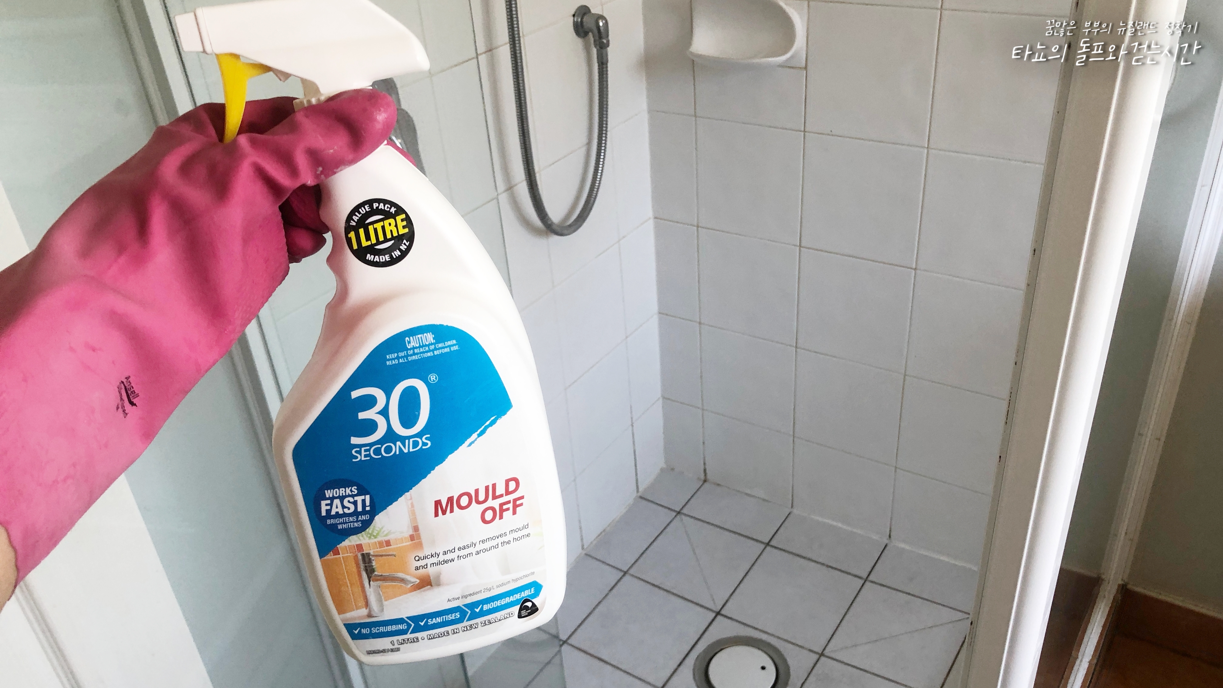 뿌리고 30초만 지나면 곰팡이가 마법처럼 사라지는 제품입니다. 이건 타일 전용으로 나온 제품이에요. 저희는 이번에 이 제품을 사용하면서 신세계를 경험했습니다.