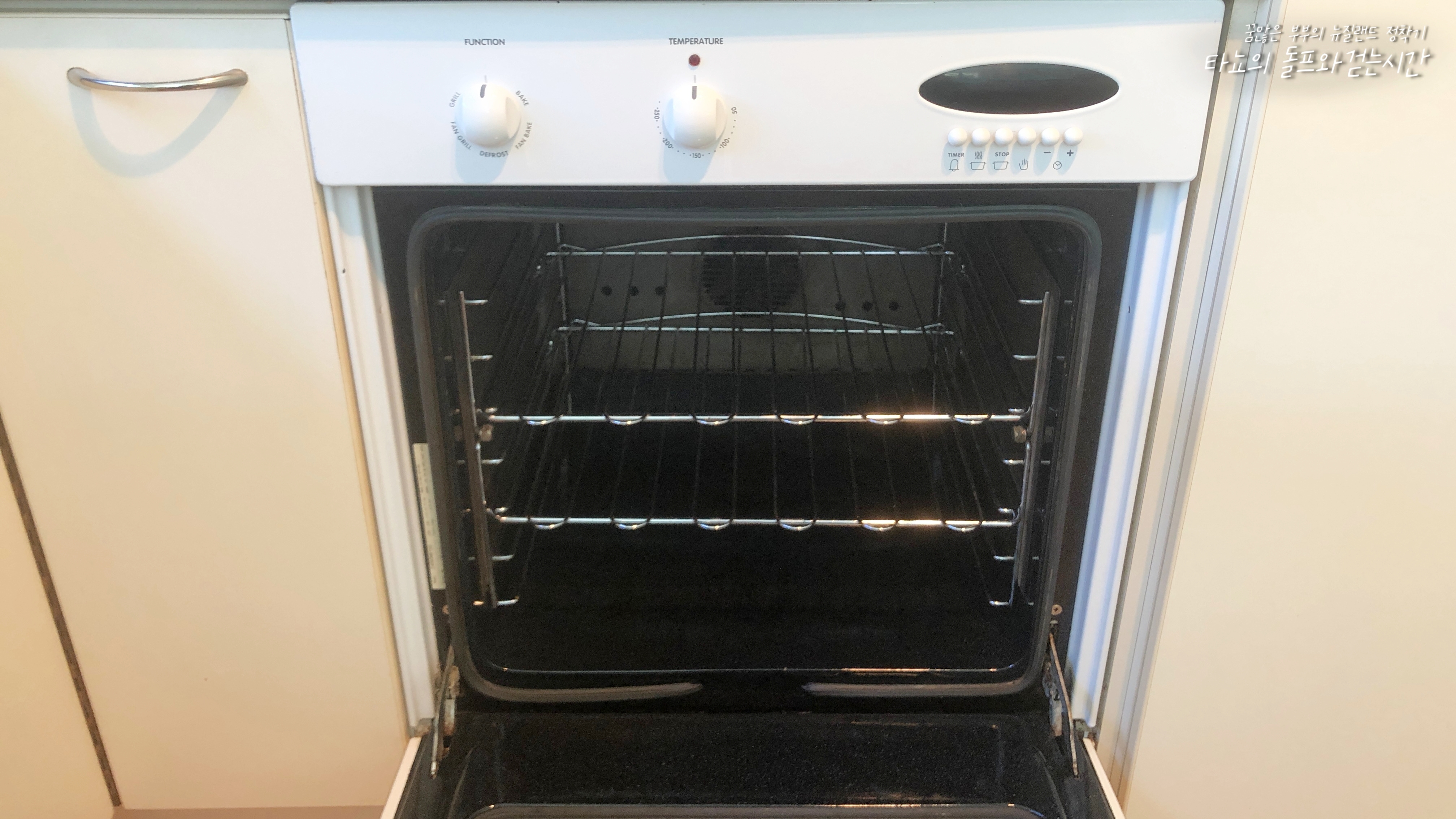 전기레인지 아래에 있는 오븐입니다. 보통 뉴질랜드 집에는 업소에서나 볼 것 같은 대형 오븐이 꼭 장착되어 있습니다. 문화 특성상 오븐은 필수 아이템이죠. 하지만 저는 렌트 집 살면서 이렇게 장착된 오븐을 사용하는 게 약간 불편했습니다. 이 오븐은 너무 오래된 제품처럼 보이기도 했었고 안이 꽤 지저분했기 때문에 애초에 사용하지 않았습니다. 후드 상태만 봐도 이전 사람들이 얼마나 청소를 안 했을지가 눈에 선했죠. 3년을 살면서 한 번도 사용하지 않았지만, 그래도 나갈 때는 최상의 상태를 만들어야 하기 때문에... 열심히 닦아서 처음보다 나은 상태로 만들어줬습니다.