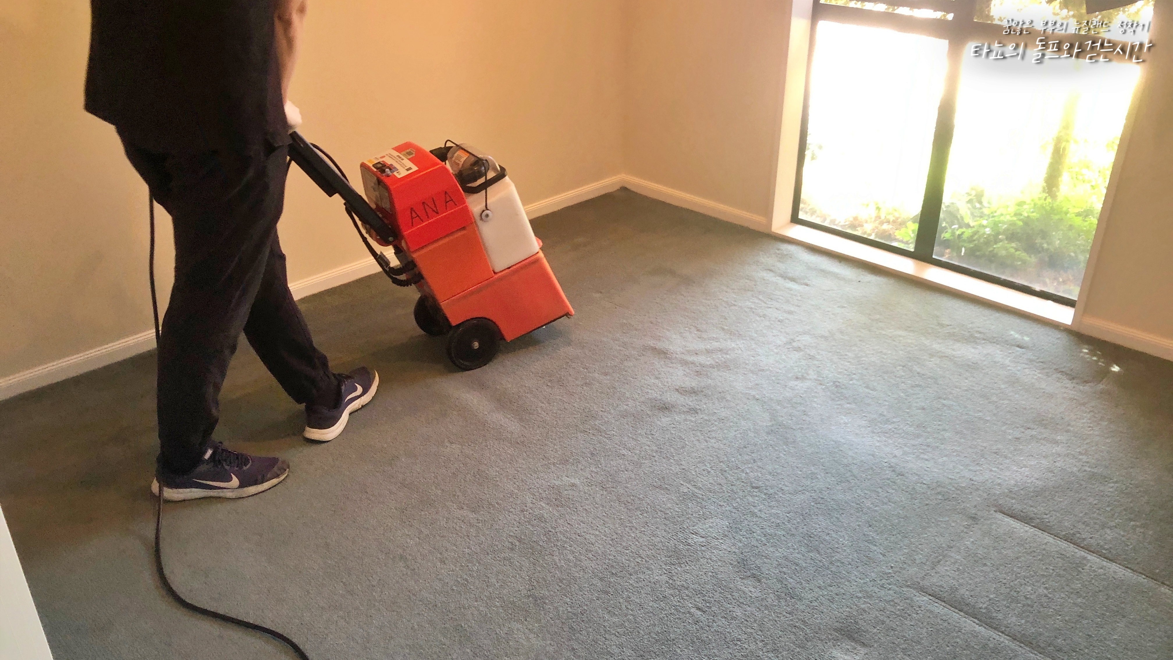 제가 자잘한 것들을 치우는 동안 신랑은 바닥 청소를 시작했습니다. 이건 카펫 물청소기인데요. 뜨거운 물과 전용 세제를 넣어서 카펫을 샴푸 해준다고 생각하시면 됩니다. 물기를 제거하는 작업도 동시에 이뤄지기 때문에 물바다가 되는 일은 없습니다. 그래도 양말이 약간 축축해질 수 있기 때문에 적어도 파이널 인스펙션 하루 전에는 마무리하고 하룻밤을 바짝 말려주는 것이 좋습니다. 저희는 가까운 동네 마트 '카운트다운'에서 대여했고 전용세제도 20불에 함께 구매했습니다. 정확한 금액이 기억나지 않는데 어쨌든 100불 안에 바닥청소를 끝냈습니다. 이것도 반납할 때 상태가 더러우면 본드 비를 떼일 수 있습니다. 필터 깨끗하게 청소한 다음 반납합니다.