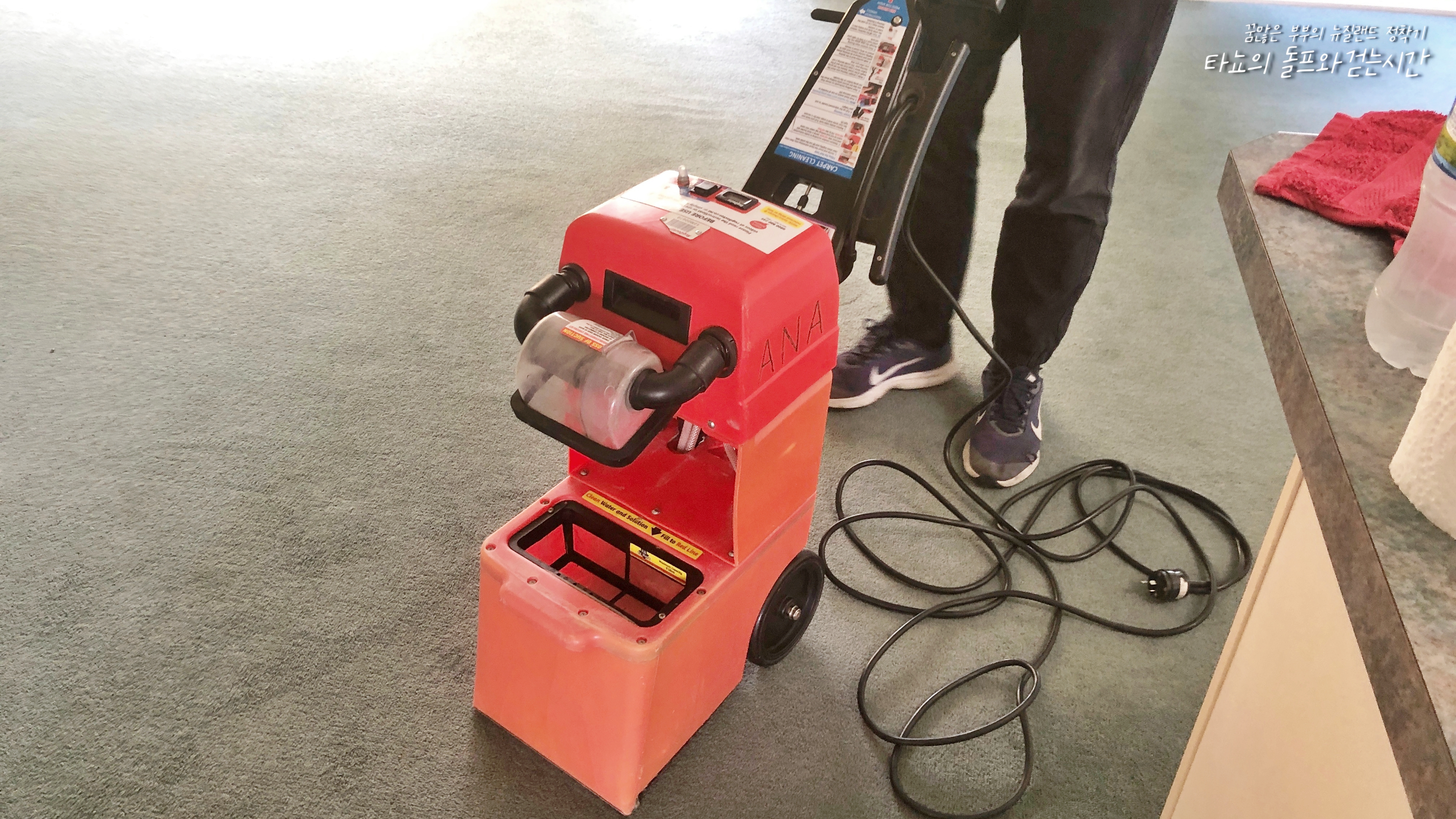 제가 자잘한 것들을 치우는 동안 신랑은 바닥 청소를 시작했습니다. 이건 카펫 물청소기인데요. 뜨거운 물과 전용 세제를 넣어서 카펫을 샴푸 해준다고 생각하시면 됩니다. 물기를 제거하는 작업도 동시에 이뤄지기 때문에 물바다가 되는 일은 없습니다. 그래도 양말이 약간 축축해질 수 있기 때문에 적어도 파이널 인스펙션 하루 전에는 마무리하고 하룻밤을 바짝 말려주는 것이 좋습니다. 저희는 가까운 동네 마트 '카운트다운'에서 대여했고 전용세제도 20불에 함께 구매했습니다. 정확한 금액이 기억나지 않는데 어쨌든 100불 안에 바닥청소를 끝냈습니다. 이것도 반납할 때 상태가 더러우면 본드 비를 떼일 수 있습니다. 필터 깨끗하게 청소한 다음 반납합니다.