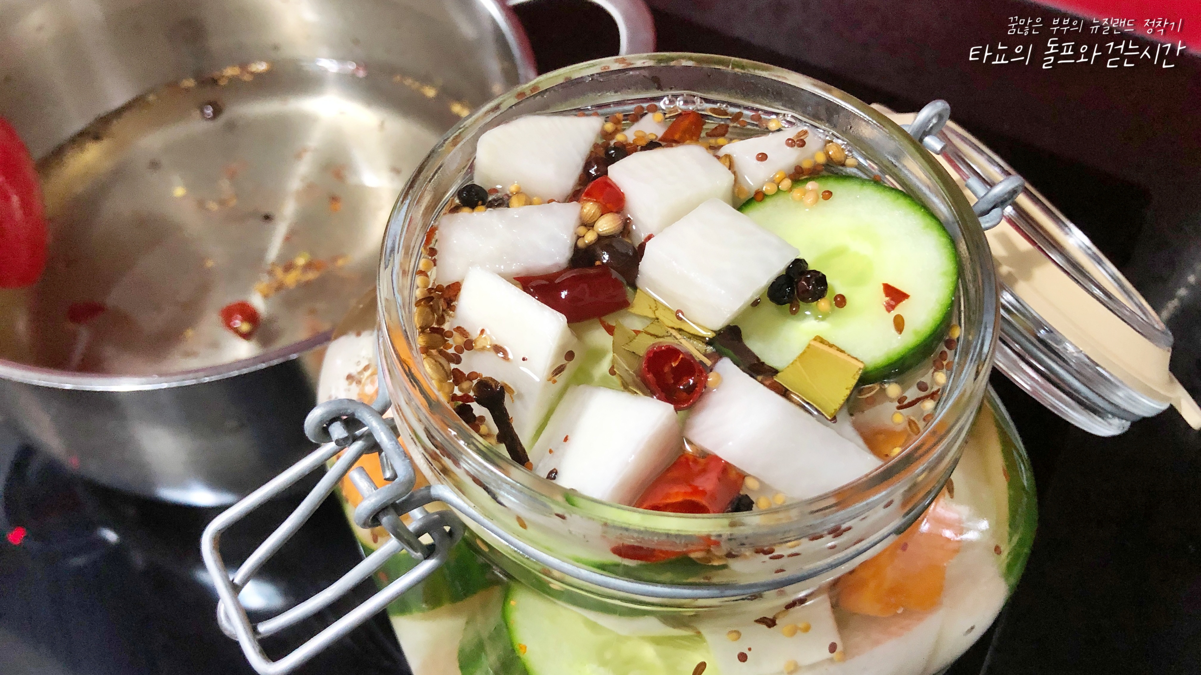 뚜껑을 열어 맛을 봤습니다. 아삭아삭한 식감, 매콤한 향기, 새콤달콤한 맛! 정말 맛있게 잘 완성되었어요. 이렇게 만들어 냉장고에 보관하면 치킨을 먹거나 피자, 파스타 등 약간 느끼한 음식을 먹을 때 찰떡궁합입니다. 제가 피클을 먹을 때면 신랑은 장난기 가득한 얼굴로 드라마 '파스타'에서 이선균이 했던 말을 반복합니다. 야만적인 식습관이라나 뭐라나... ㅎㅎ 야만적인 식습관이면 어떤가요. 제 입에 맛있으니 만족합니다.