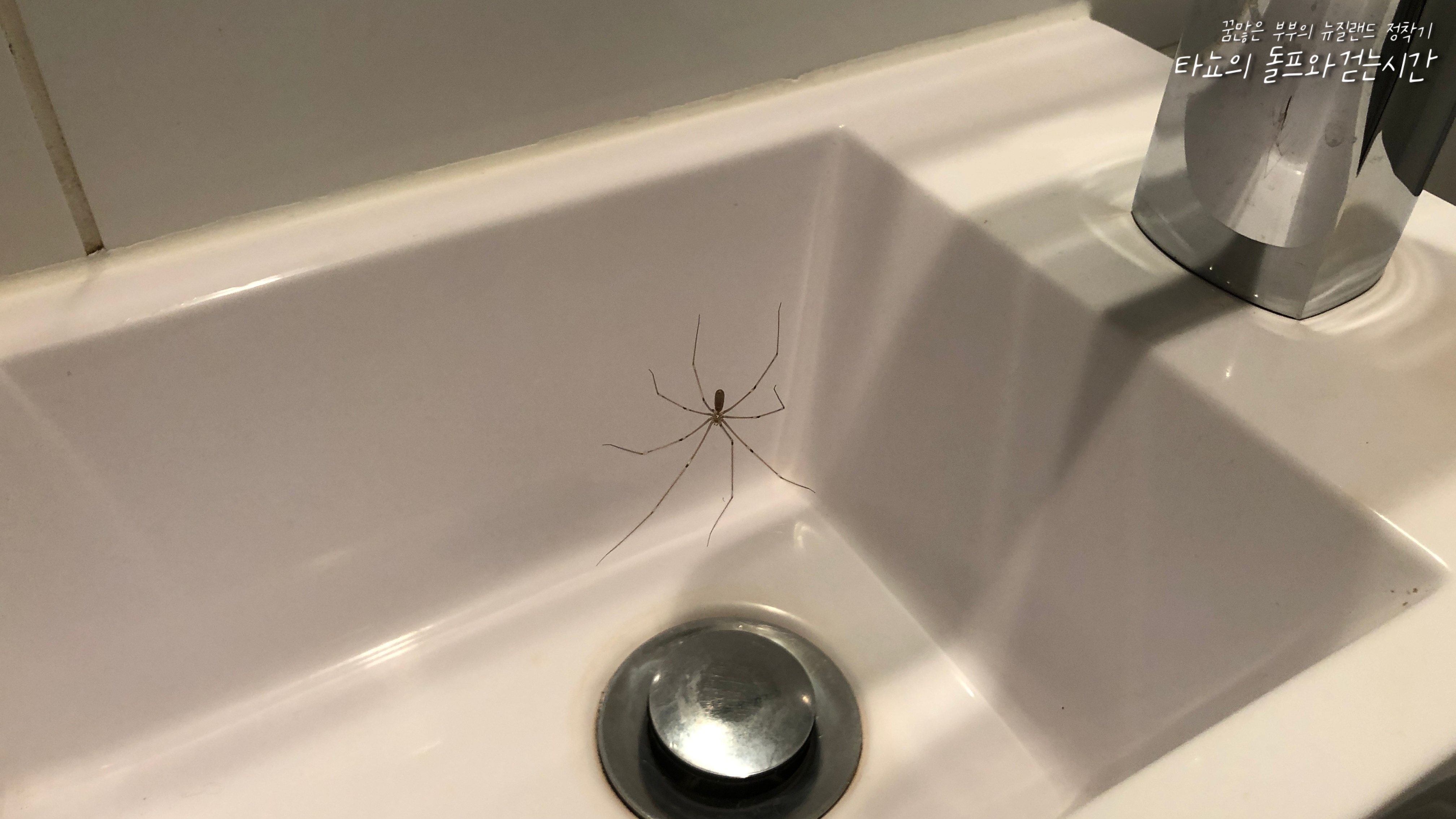 옛날 집의 가장 큰 단점이 있다면 벌레가 많다는 것이다. 뉴질랜드의 집은 한국처럼 벽돌집이 아닌 나무집이다. 게다가 바닥에는 카펫이 깔려 있기 때문에 벌레천국이라 볼 수 있다. 눈에 잘 보이지 않는 벌레까지 포함한다면 얼마나 많은 벌레들이 있을까. 어쨌든 사진 속 거미는 생각보다 큰 놈인데 저렇게 쌩뚱맞은 장소에 종종 등장해서 우리를 놀래킨다. 그래도 뉴질랜드에 서식하는 모든 거미는 독이 없다고 한다.