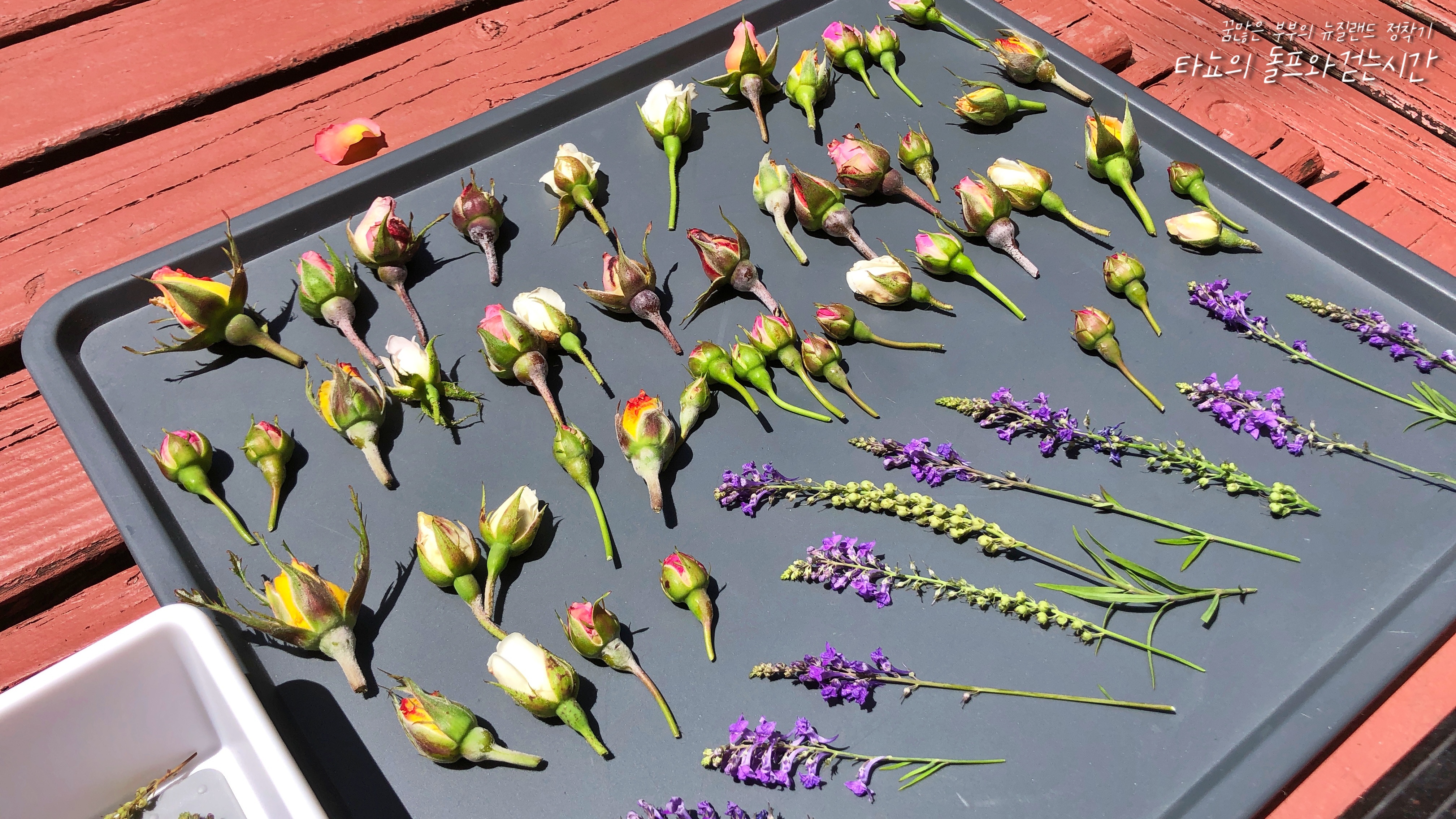 요즘 뉴질랜드는 한창 여름인데 기온이 높은 날은 31도까지 오르기도 하고 추운 날은 10도 이하를 겉돌기도 한다. 뉴질랜드의 하루에는 사계절이 있다. 오늘은 그중에서 날이 좋은 구름 한 점 없는 30도의 날이라 꽃을 말리기에 참 좋았다.
