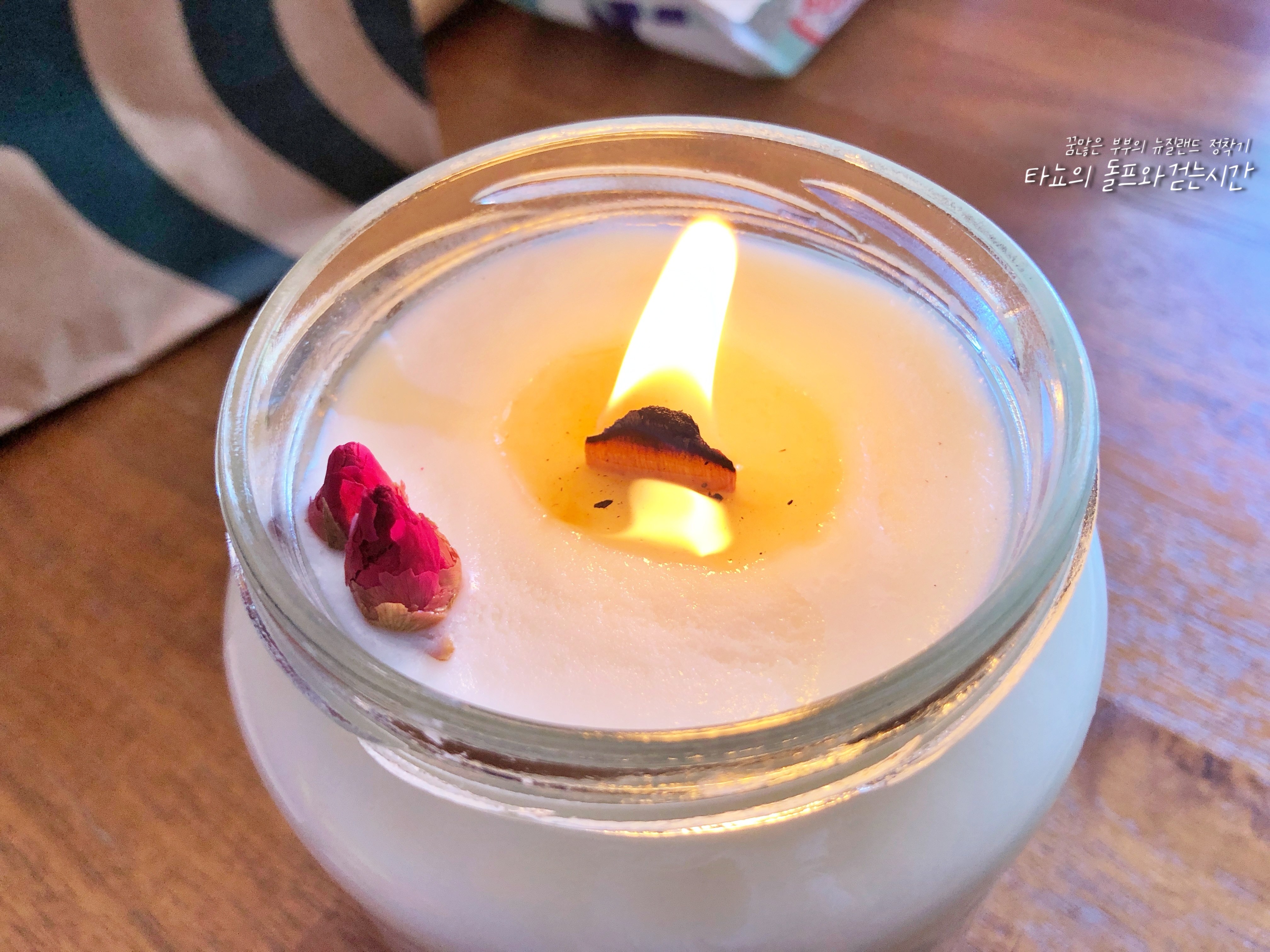 이건 잼 병에다가 대충 만든 소이캔들이다. 말린 장미를 2개 박아 넣었는데 별로 예쁘진 않다. 그저 우드 심지의 사운드를 확인하고자 시험용으로 만들어봤다. 우연히 소이 왁스를 넉넉하게 얻었는데 덕분에 온 집이 캔들로 가득하다.