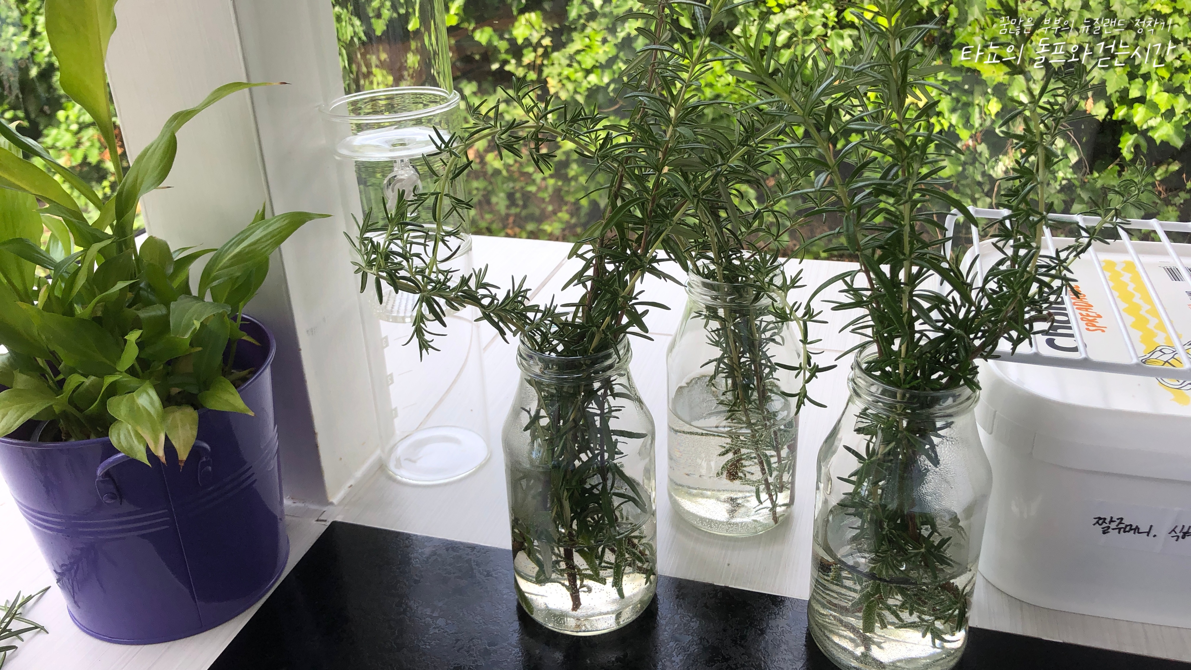 햇살이 좋은 곳에 두고 매일 지켜보는 중이다. 혹시나 물이 상할까 봐 물도 매일 갈아주고 있다. 로즈메리는 음식에 사용해도 좋지만, 우리 신랑이 가장 좋아하는 자리는 수저 아래이다. 테이블을 세팅할 때 포크와 나이프 또는 수저 아래에 로즈메리 가지 하나를 깔면 향도 좋고 보기에도 참 예쁘다.