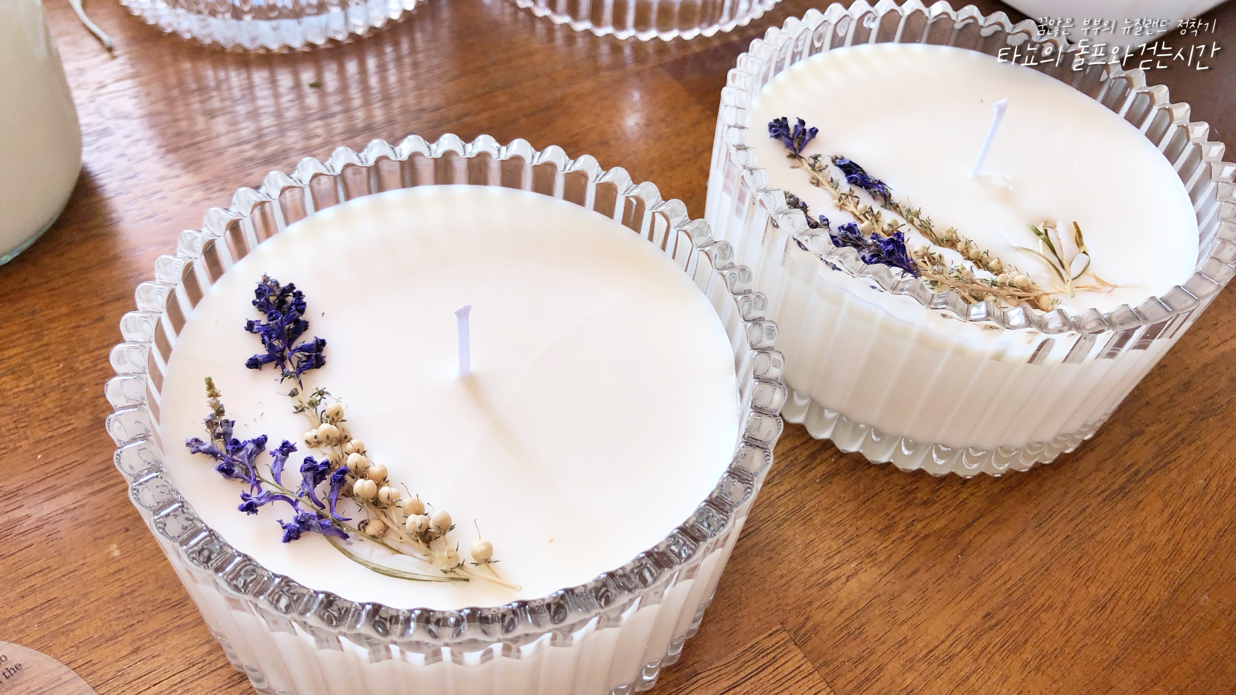 소이 왁스를 녹여 작은 초를 만들고 그 위에 말린 꽃을 살포시 얹었다. 생각보다 장미보다 이 이름도 모를 보라색 꽃이 참 예쁘더라. 예쁜 뚜껑과 한 세트로 나온 이 유리용기는 한국에서도 초 만들 때 종종 사용되고 있는 제품이었다. 사실 구입하고 싶었지만 여긴 한국이 아니기에 이런 용기를 어디서 구하나 고민되었었는데 2달러 샵(주로 한국인들이 운영하는 일종의 1000원 샵)에서 $3.99에 판매하고 있길래 잔뜩 사버렸다. 받는 사람이 행복하기를 바라며.