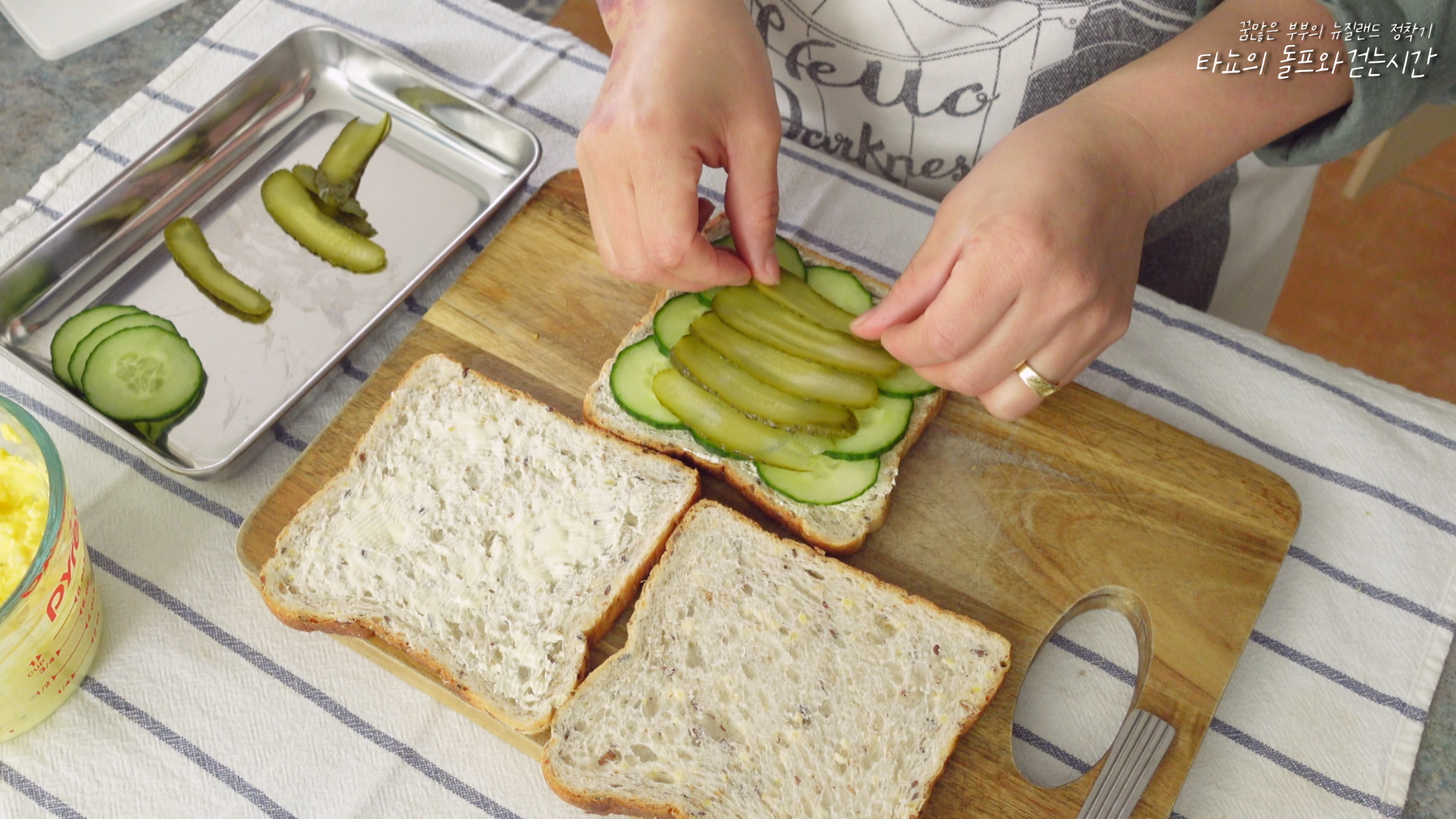 달걀 오이 클럽 샌드위치라 적으니 뭔가 어색해서 여기서 불리는 대로 '에그 큐컴버 클럽 샌드위치'라 적었다. 오이와 피클이 달걀 샐러드와 만나면 궁합이 참 좋다. 카페에서도 근무할 때 팔던 메뉴인데 매일 넉넉하게 만들어도 한결같이 다 팔리는 인기 메뉴였다. 하지만 신랑이 더 좋아하는 것은 햄치즈 클럽 샌드위치이다. 얇은 햄을 돌돌 꼬아 말아서 넣어주면 모양이 예쁘다.