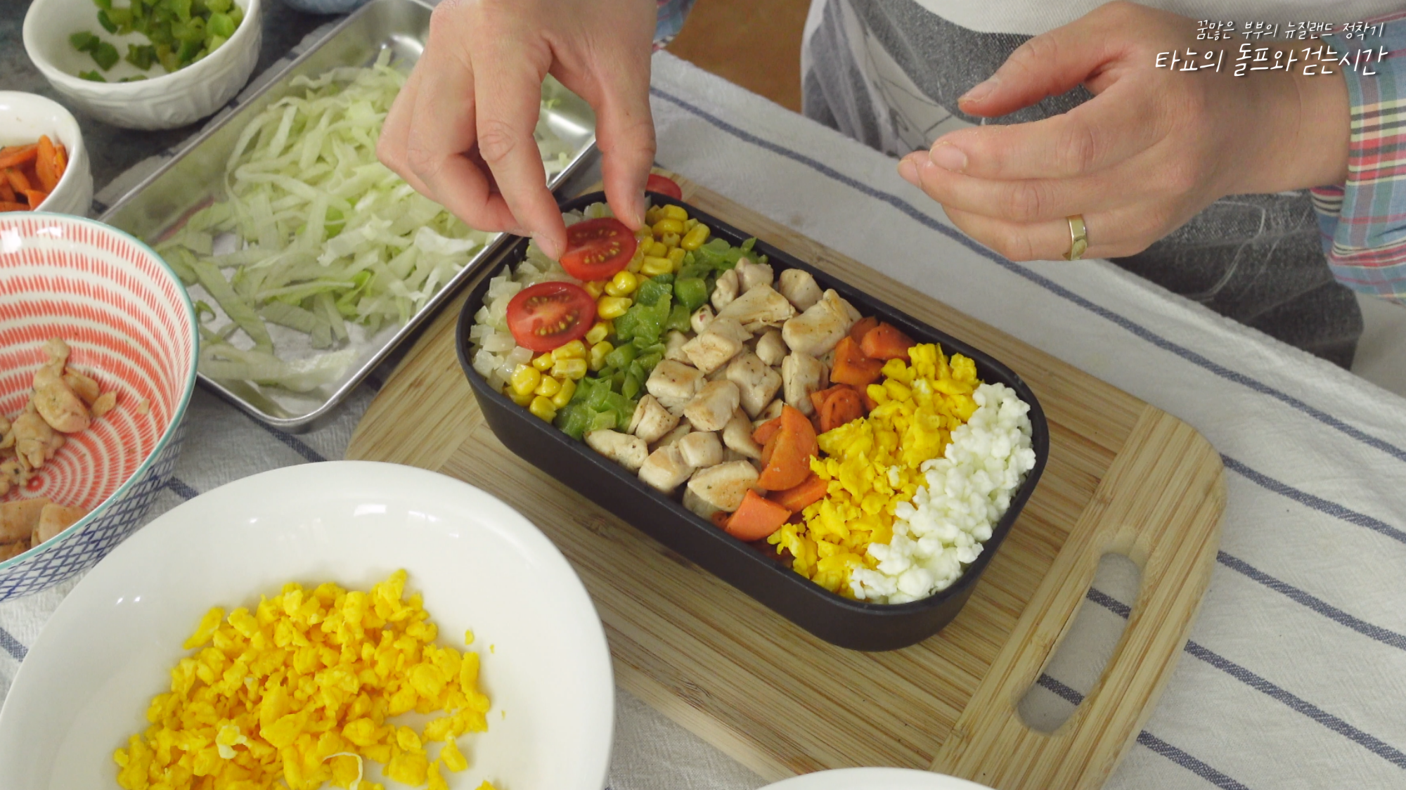 밥 위에 아삭한 양상추를 올리고 그 위에 마요네즈와 함께 알록달록한 음식들을 올려서 장식했다. 달걀노른자와 흰자를 분리해서 스크램블 에그를 만들고 당근, 피망, 옥수수, 양파, 닭고기를 구워서 올렸다. 밥은 보통 1 공기를 계량해서 넣고 있는데 이 기준으로 간장 1큰술, 참기름 1큰술을 넣어주면 간이 딱 좋다.