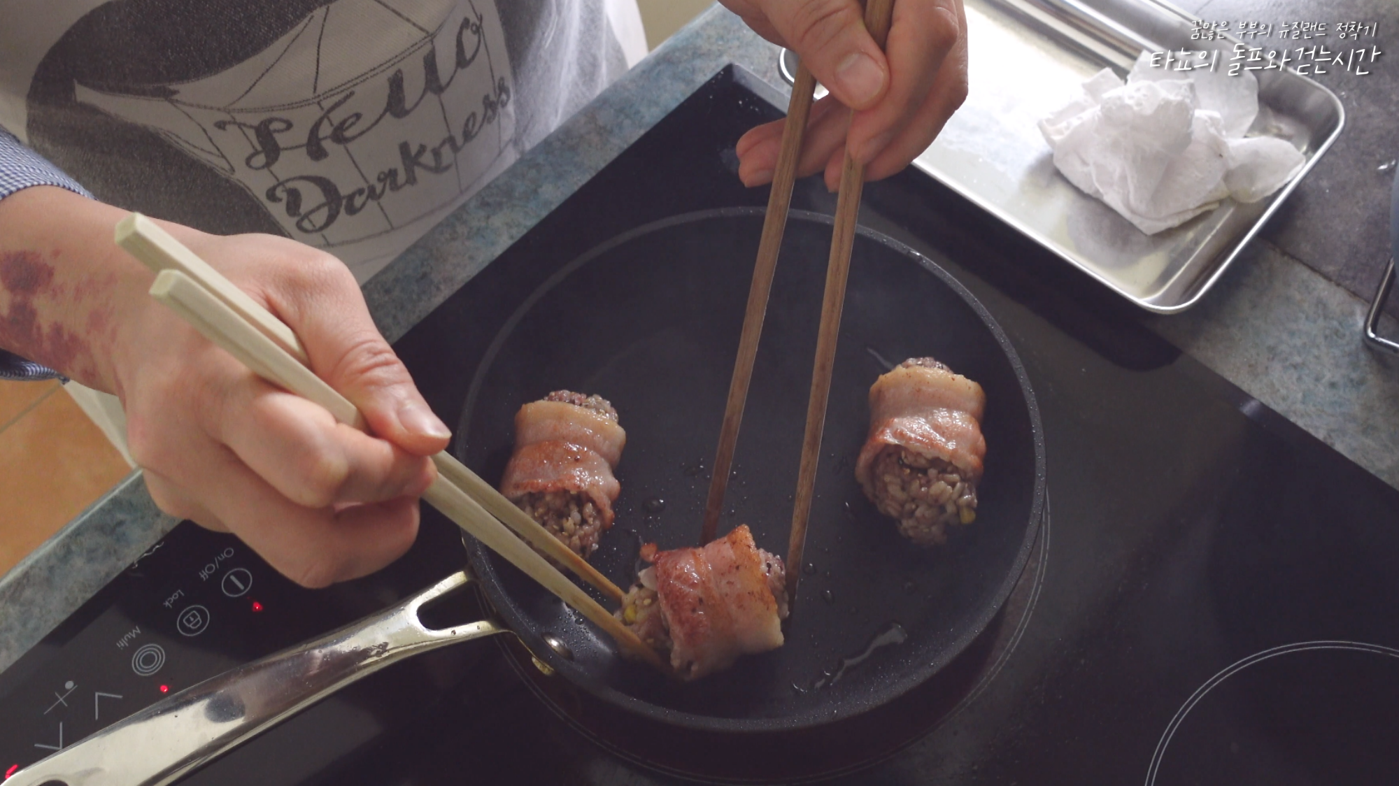 베이컨 오일 파스타와 베이컨 말이 주먹밥