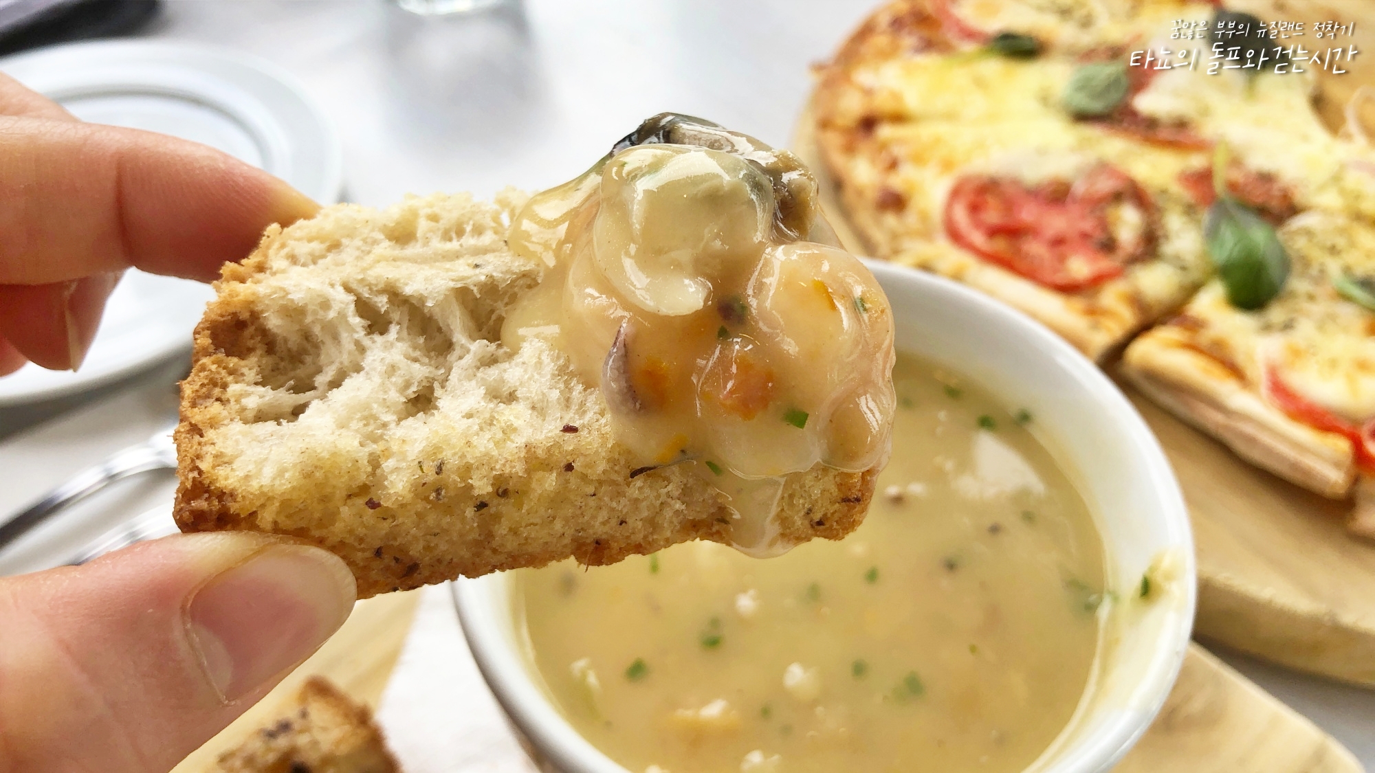 대략 40분 전에 1차로 거하게 먹었던 우리의 양심이 조금 가책을 느끼긴 했지만, 그래도 우리는 열심히 주문했다. 정성을 다해 메뉴를 고르고 메뉴가 나왔을 때는 진심으로 기뻤다. 평소 피자 욕심이 있는 신랑은 마르게리타 피자를 주문했고 쌀쌀한 날씨에 차우더가 굉장히 당겼던 나는 씨푸드 차우더를 주문했다. 사실 피시&칩스 가게에서도 씨푸드 차우더를 먹고 싶었지만, 거기 주력 메뉴가 아닌지라 포기했었다. 하지만 레스토랑이라면 이야기가 달라지지. 진심으로 반갑게 씨푸드 차우더를 주문했다!