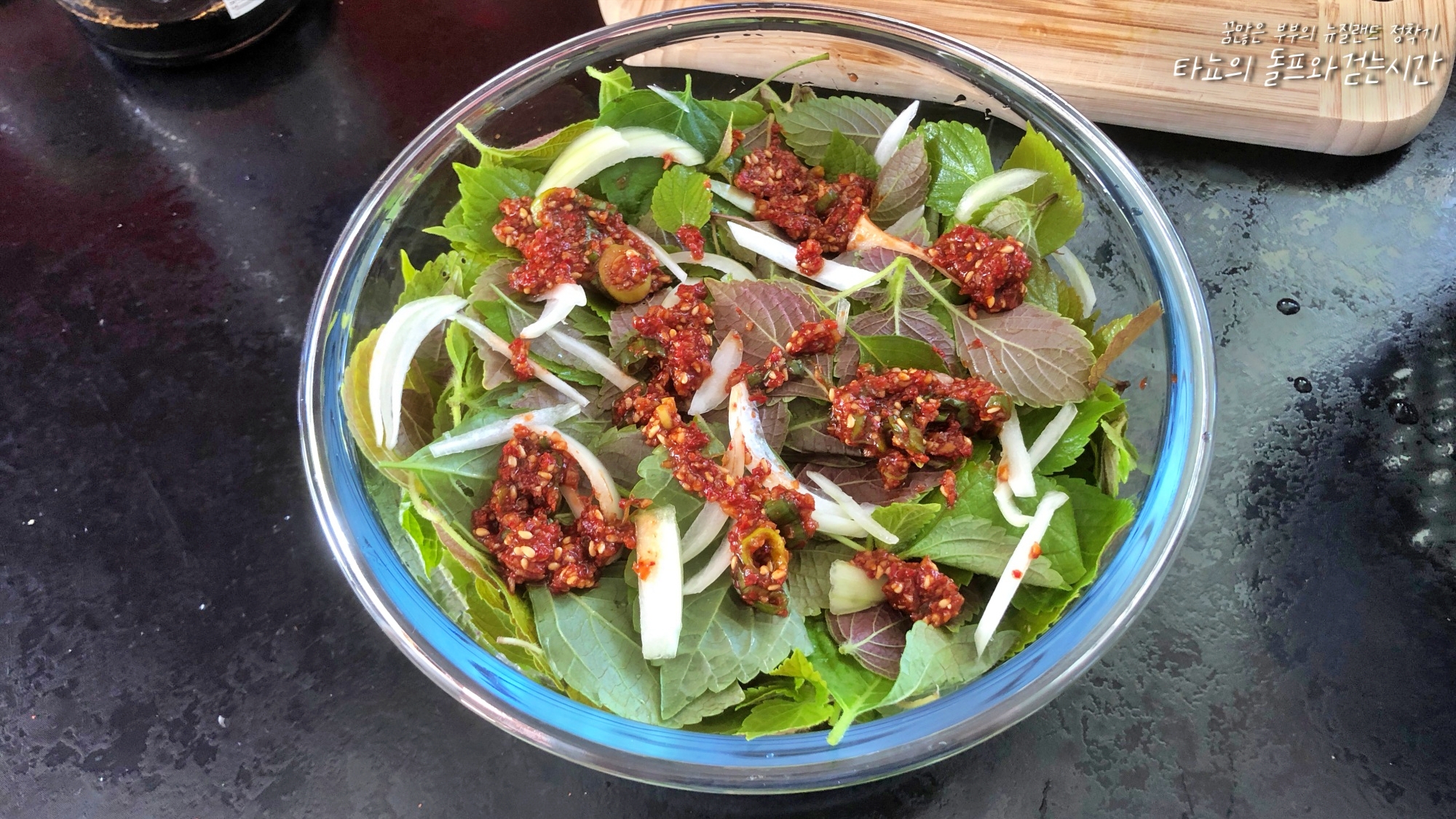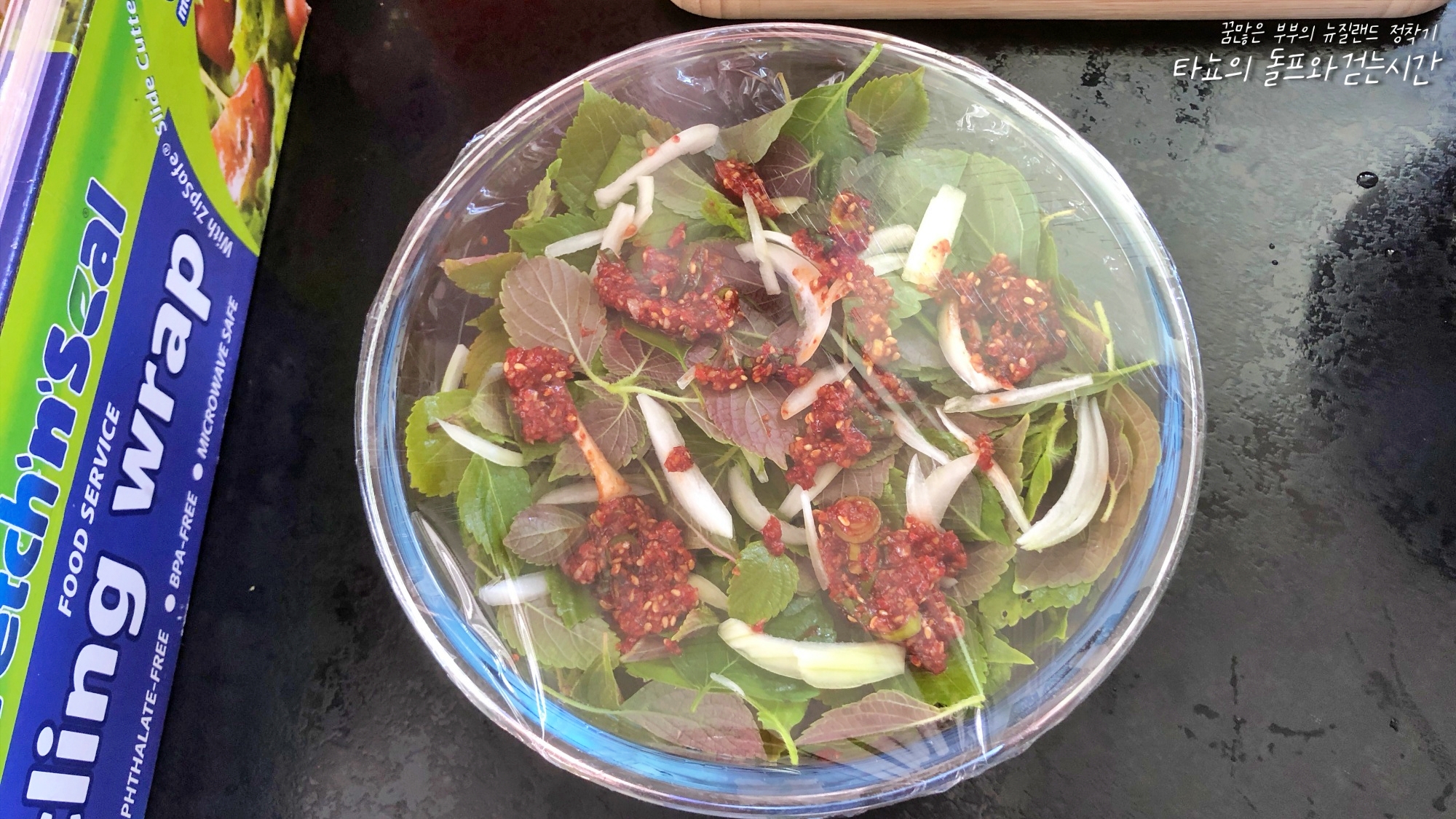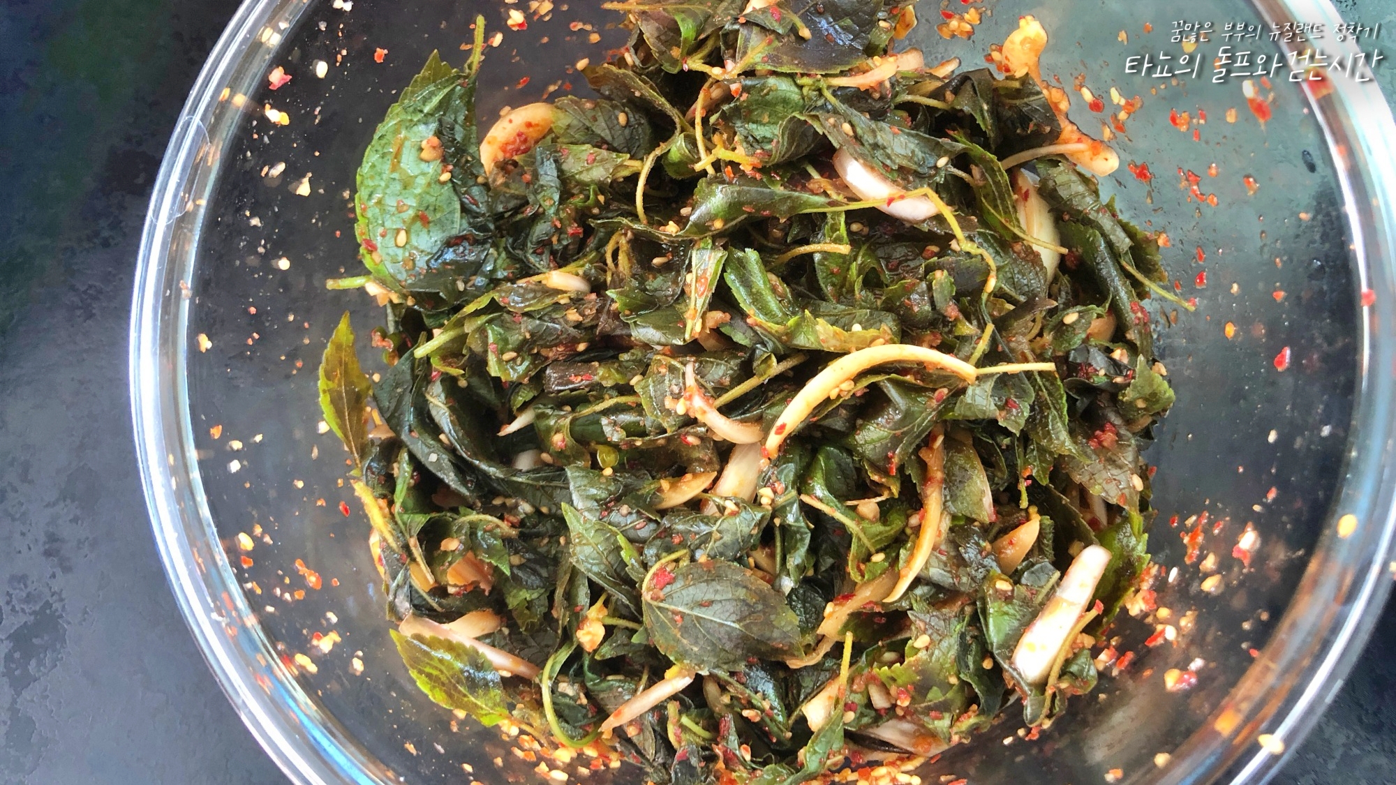 1분 돌렸지만 숨이 살짝 죽었을 뿐, 감감무소식.. 깻잎 20장은 30초만 돌려도 약간 물이 나와서 촉촉하게 양념에 젖는다.