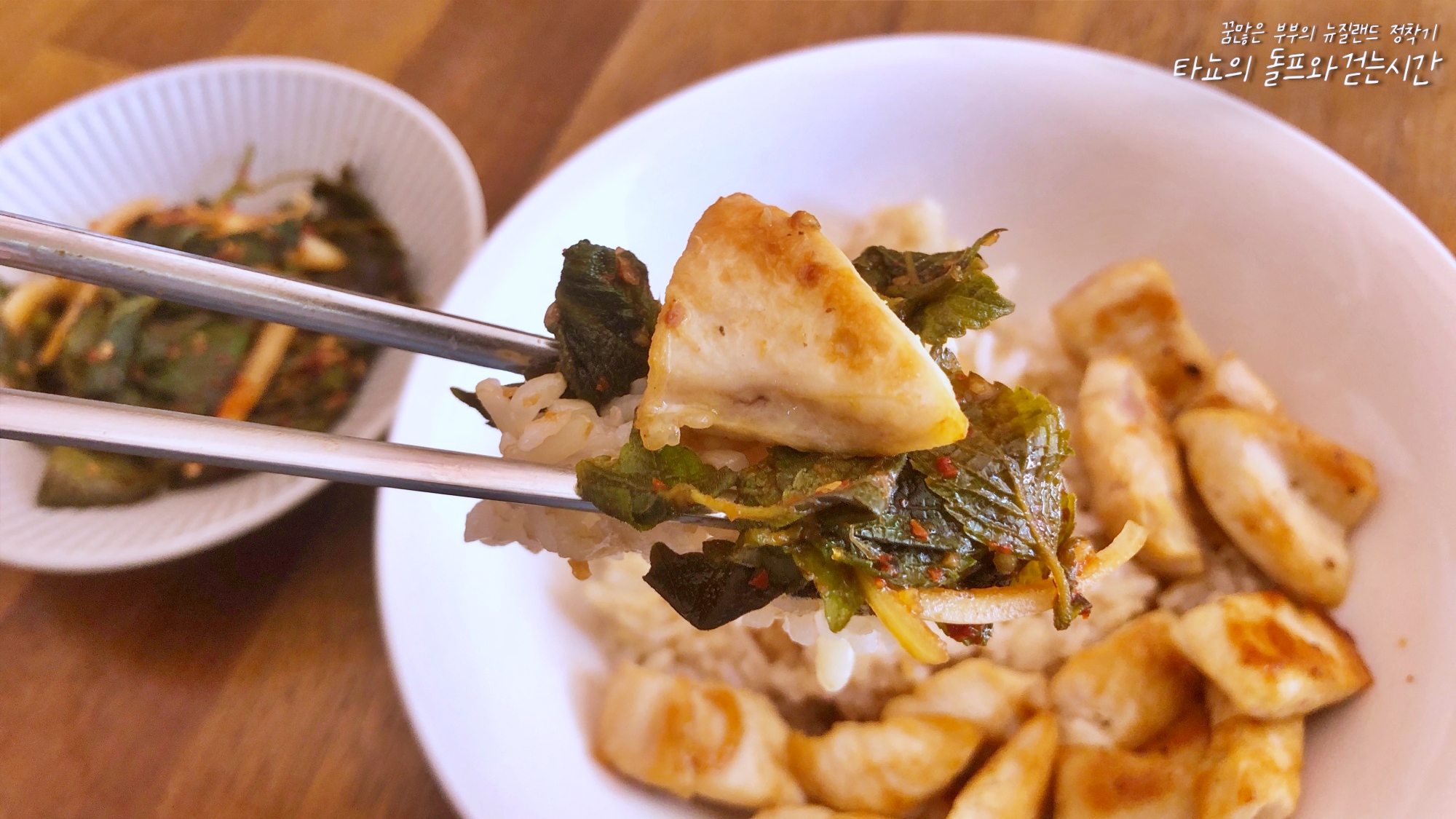 요즘 다이어트 해본답시고 점심을 약소하게 먹고 있다. 현미밥에 구운 닭가슴살 1/2 덩이 그리고 깻잎찜과 함께 맛있는 혼밥 타임. 구운 닭가슴살과 깻잎찜이 이렇게 잘 어울리다니!