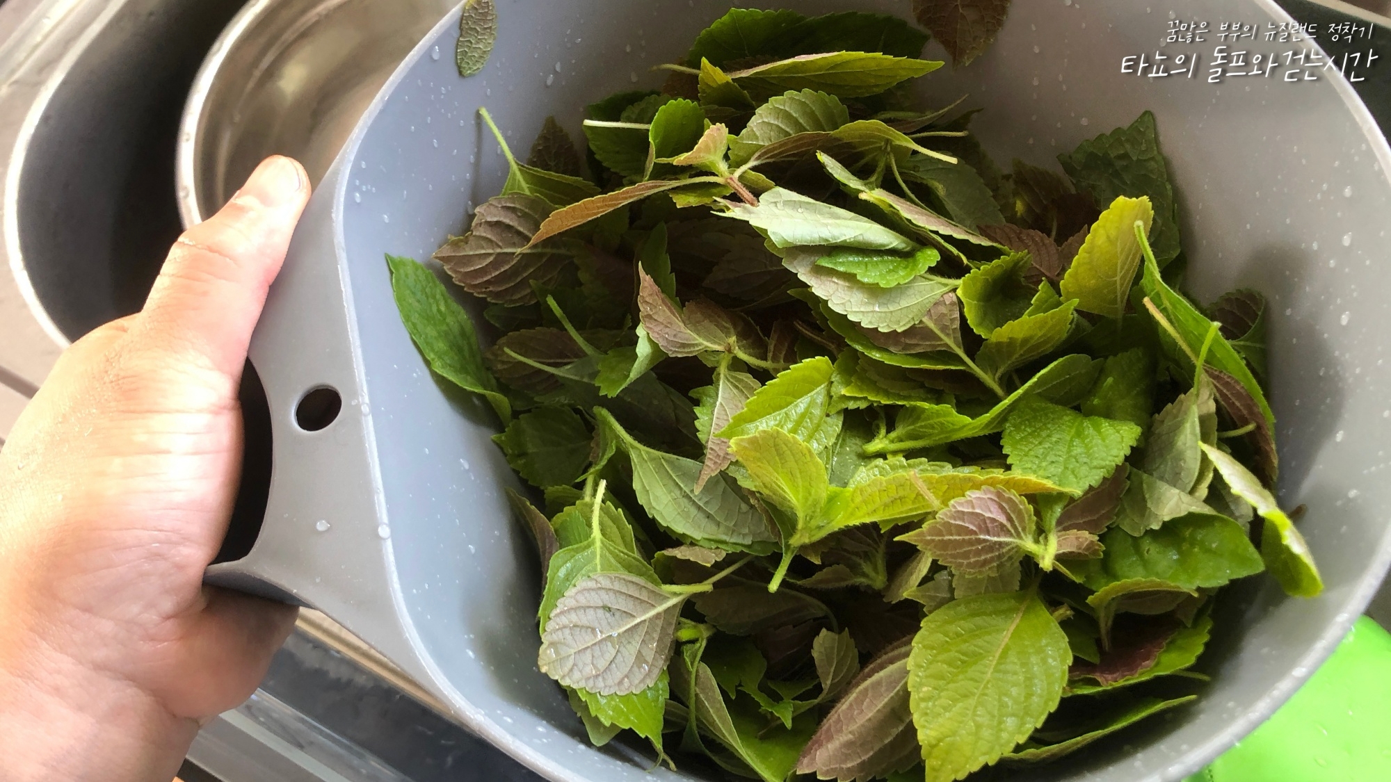 그래도 깻잎인데 버리기 아까워서 열심히 주워 담아 반찬을 만들었다. 차가운 물에 식초 2큰술 넣고 10분간 담갔다가 뺐다.
