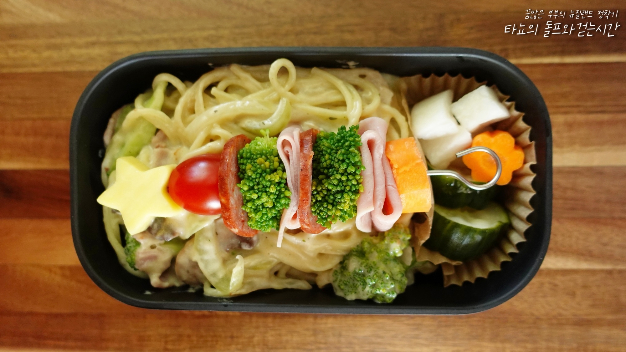 베이컨과 버섯, 양파, 브로콜리가 듬뿍 들어간 크림 파스타에 별 모양 치즈와 방울토마토, 살라미와 햄, 브로콜리와 당근을 꽂은 꼬치를 얹어서 준비한 점심 도시락이다. 야채 피클을 곁들여서 준비했다.