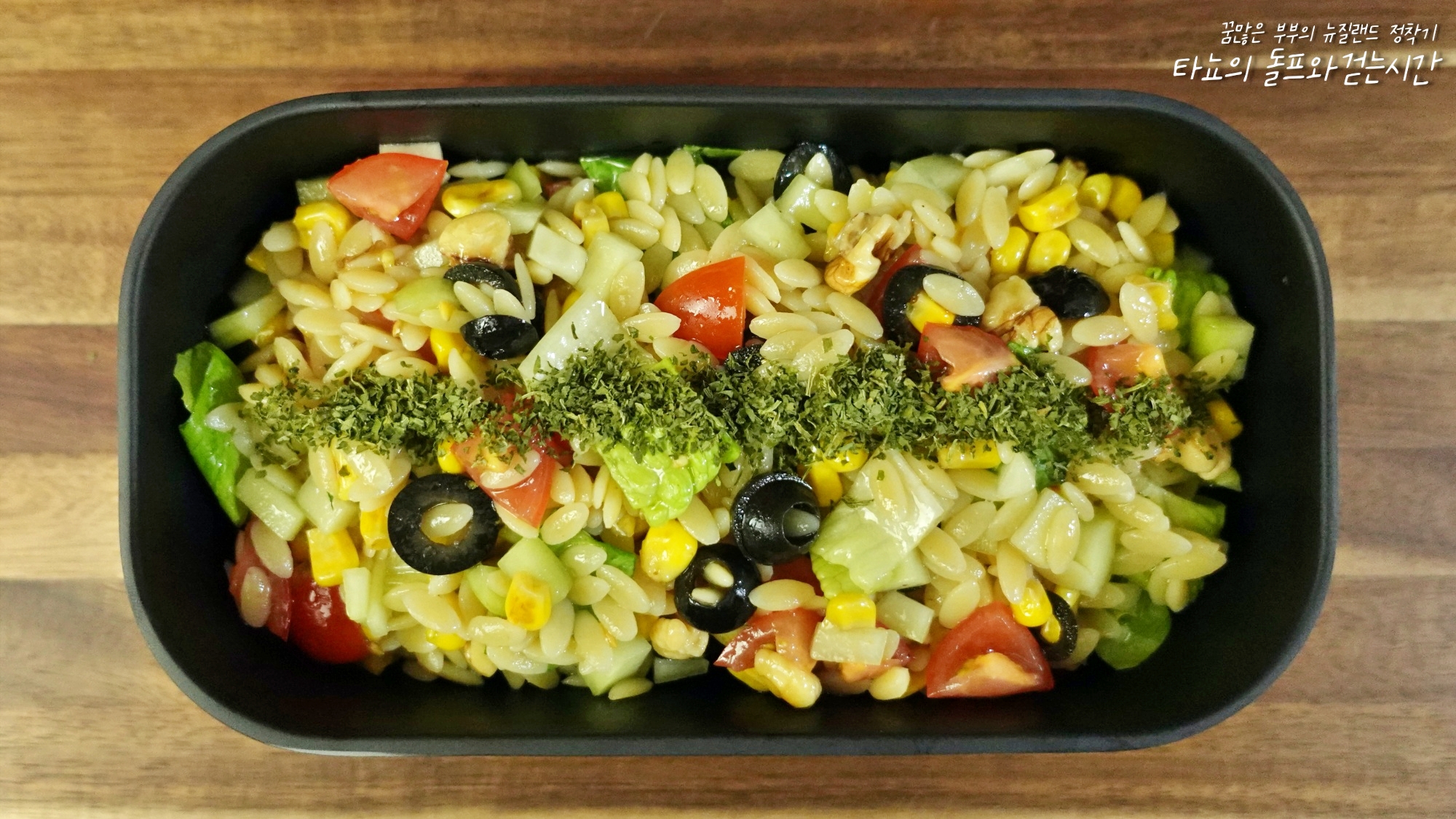 쌀 모양의 파스타 '오르조'와 호두, 토마토, 올리브, 로메인 상추, 오이, 옥수수 잔뜩 넣어서 파스타 샐러드를 만들었다. 레드와인 비네거를 사용했는데 새콤한 맛이 나서 신랑은 입맛에 별로라고 했던 문제의 도시락. 내 입맛에는 딱 좋았지.