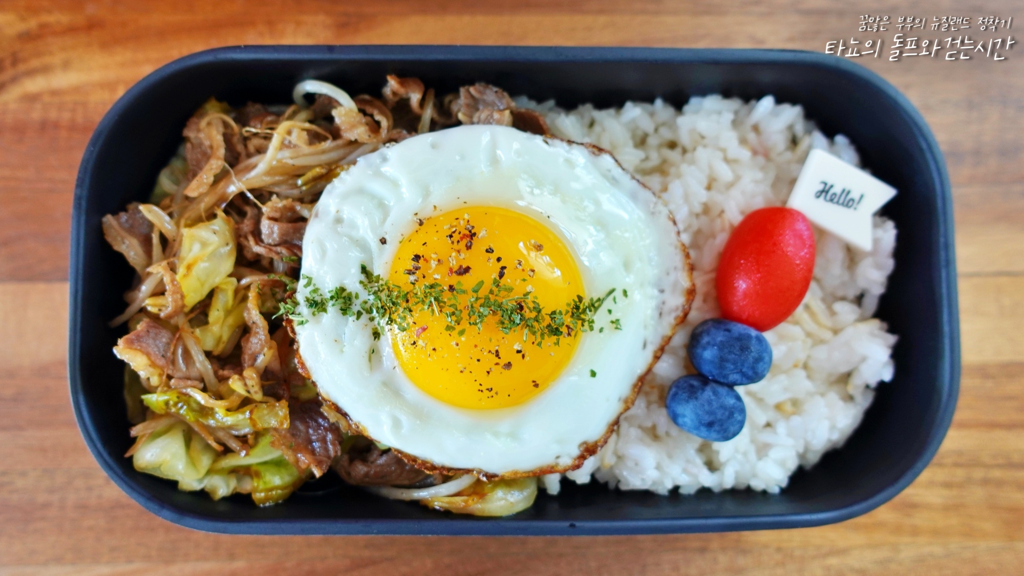콩나물 불고기는 진정한 밥도둑이다. 맘 놓고 먹으면 제대로 과식할 수 있는 진짜 위험한 음식이지만, 도시락에 담으면 절제할 수 있기에 오히려 좋다. 밥 1공기에 콩불 든든하게 넣고 부드럽고 심심한 맛의 스크램블 에그를 올렸다.