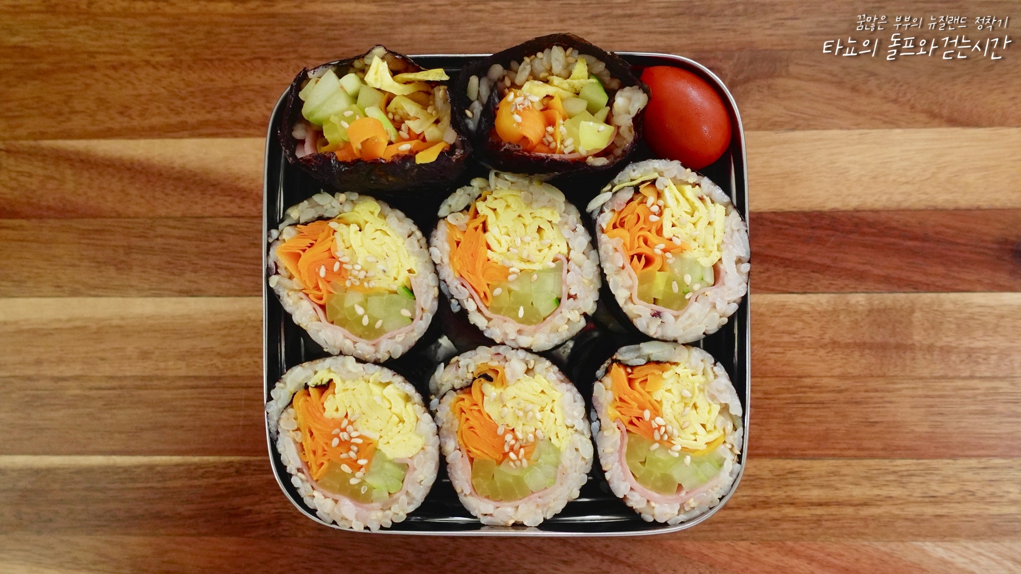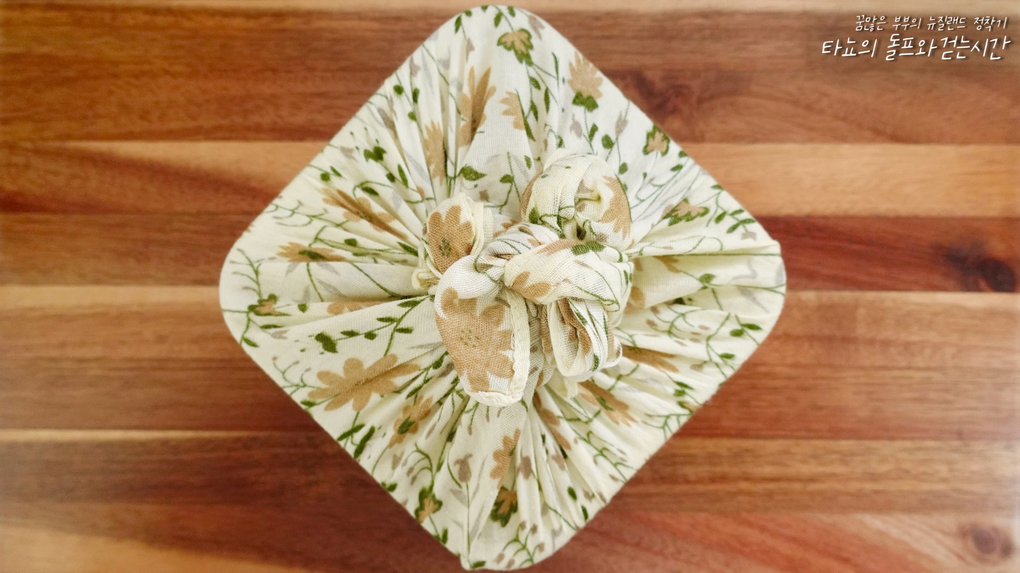 하루는 달걀과 당근, 오이, 햄, 단무지를 넣고 김밥을 쌌고 또 하루는 달걀과 단무지, 오이만 넣고 김밥을 쌌다. 이 네모난 스텐 도시락은 신랑이 회사 첫 출근 때 웰컴 키트로 받아온 것인데 생각보다 쓰임새가 좋다. 도시락 밴드가 없어서 보자기로 꽁꽁 싸서 보냈다.