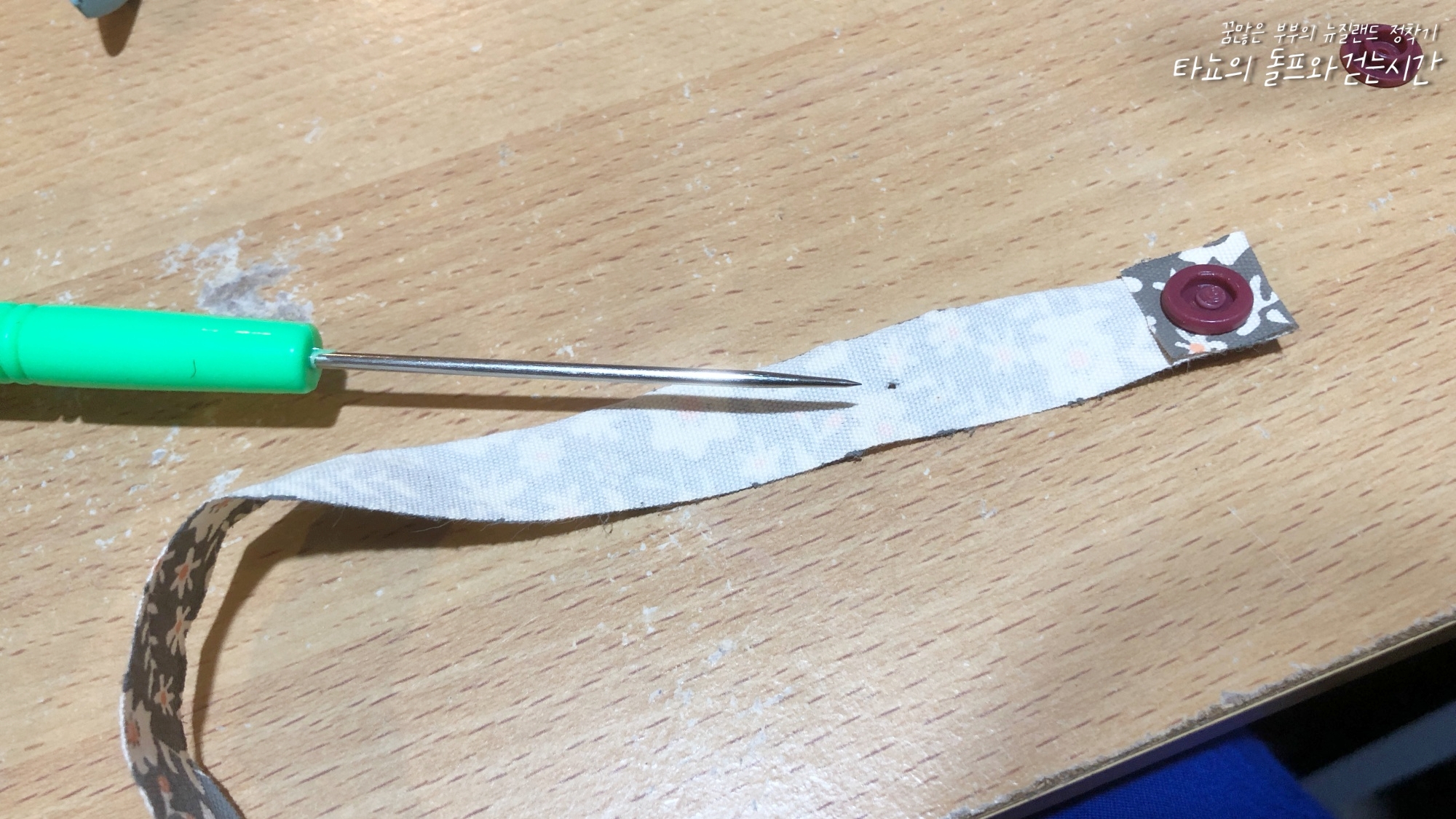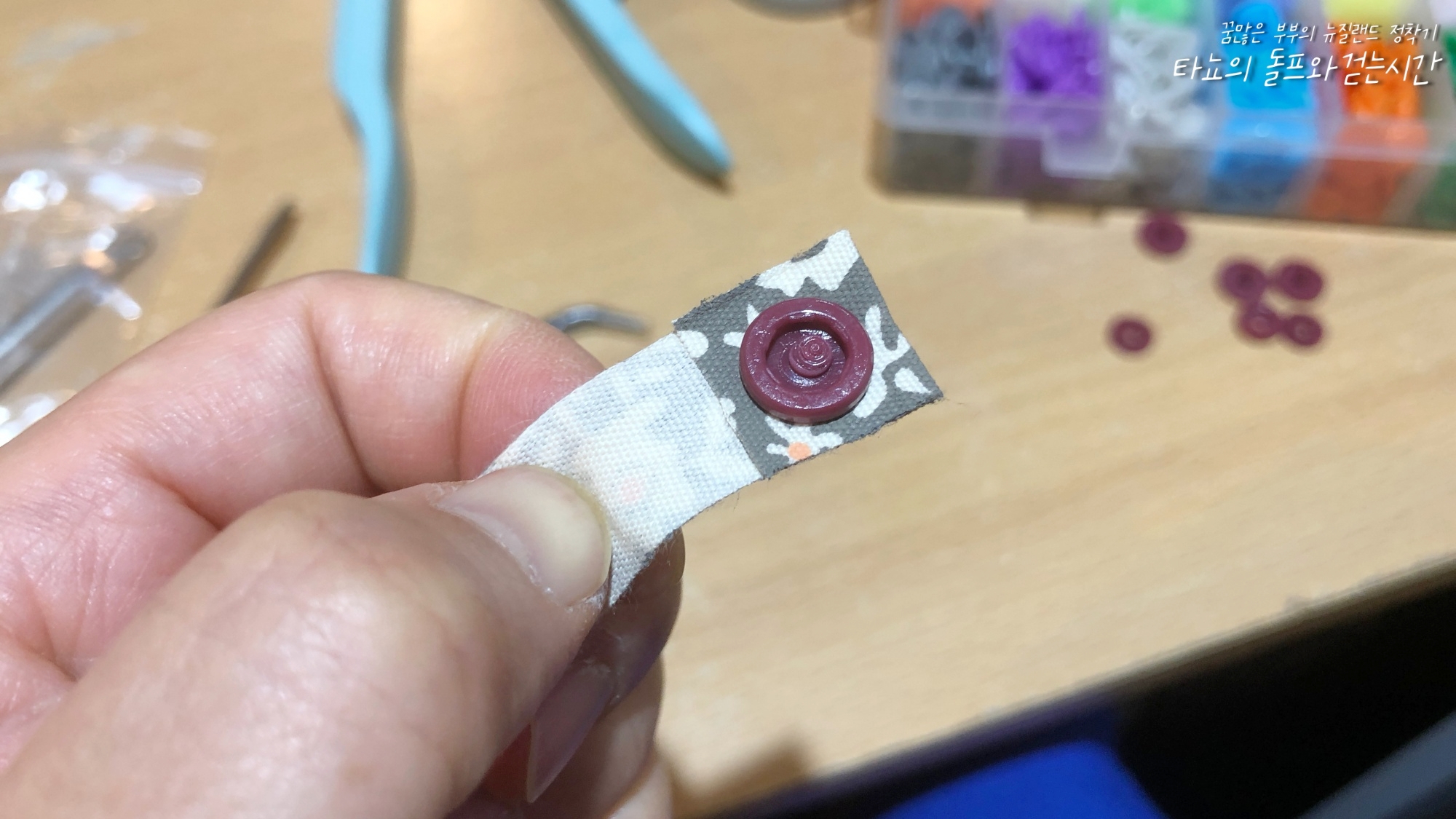 집에 있는 천으로 된 리본이 이런 꽃무늬 뿐이라 일단 이걸로 만들어 봤다. T단추는 서로 짝이 있는데 오른쪽 사진에 보이는 게 한 세트다. 똑딱이 단추 모양이 파인 것과 돌출된 것, 2가지로 나뉘니 잘 체크하고 만들어야 한다. 자칫 잘못 짝을 지어주면 단추가 닫히지 않는다.