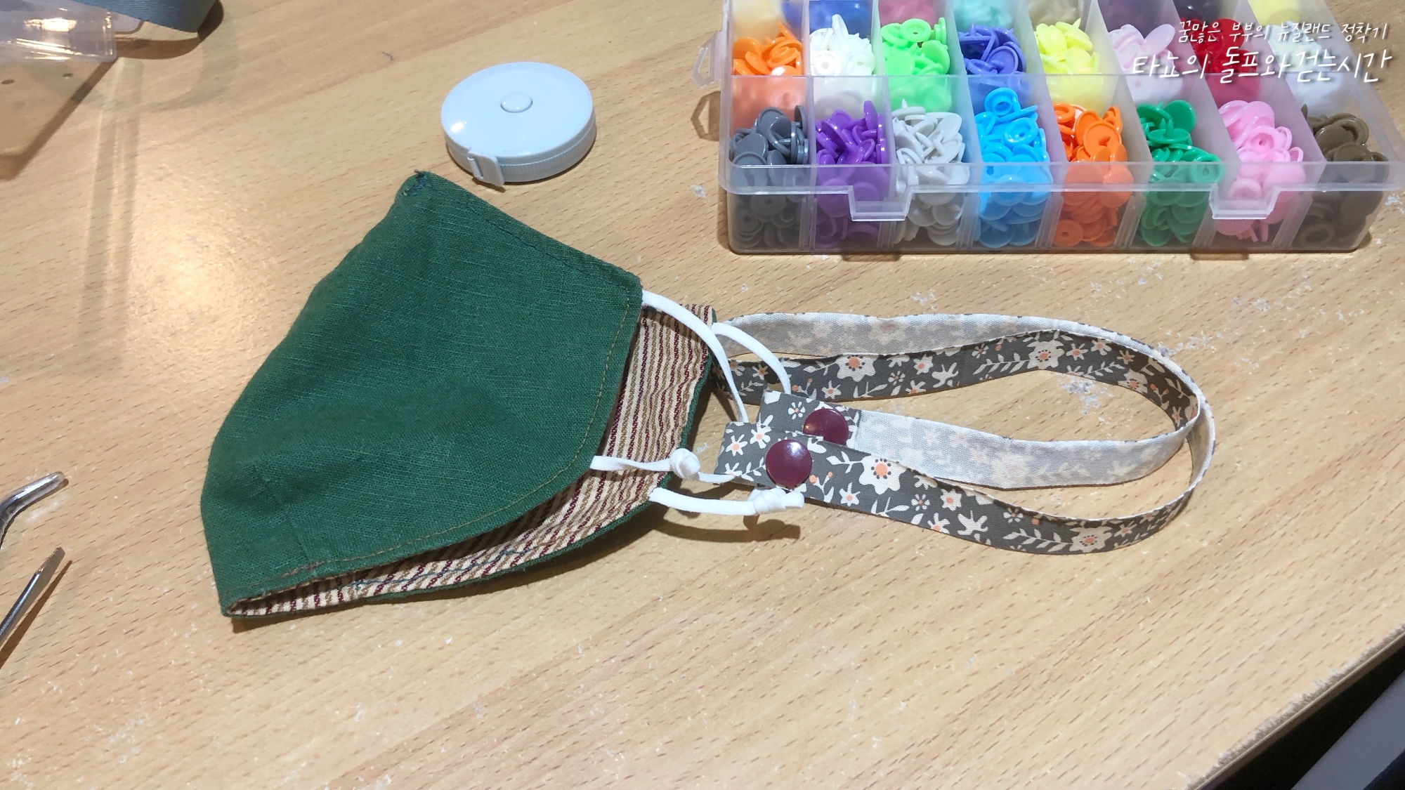어떤지 보려고 내 마스크에 먼저 걸어 봤는데 길이도 모양도 좋았다. 리본의 종류만 다를 뿐, 파는 것과 차이가 없었다.