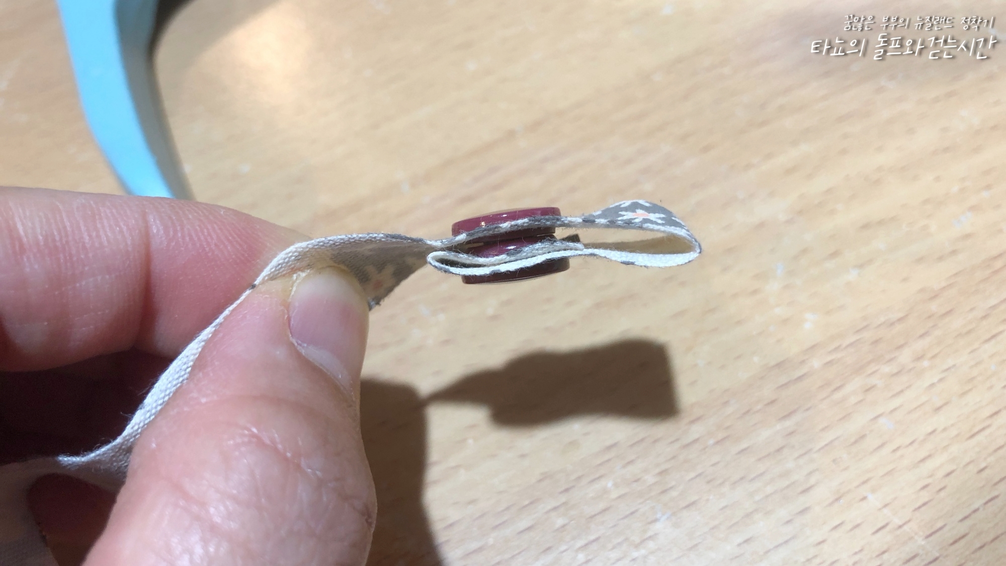 리본 살짝 젛어서 요렇게 압정 모양으로 생긴 것을 먼저 꽂아준다. 나는 송곳으로 구멍을 살짝 낸 다음 끼웠다. 그리고 오른쪽 사진처럼 짝꿍 단추를 끼워주면 된다.