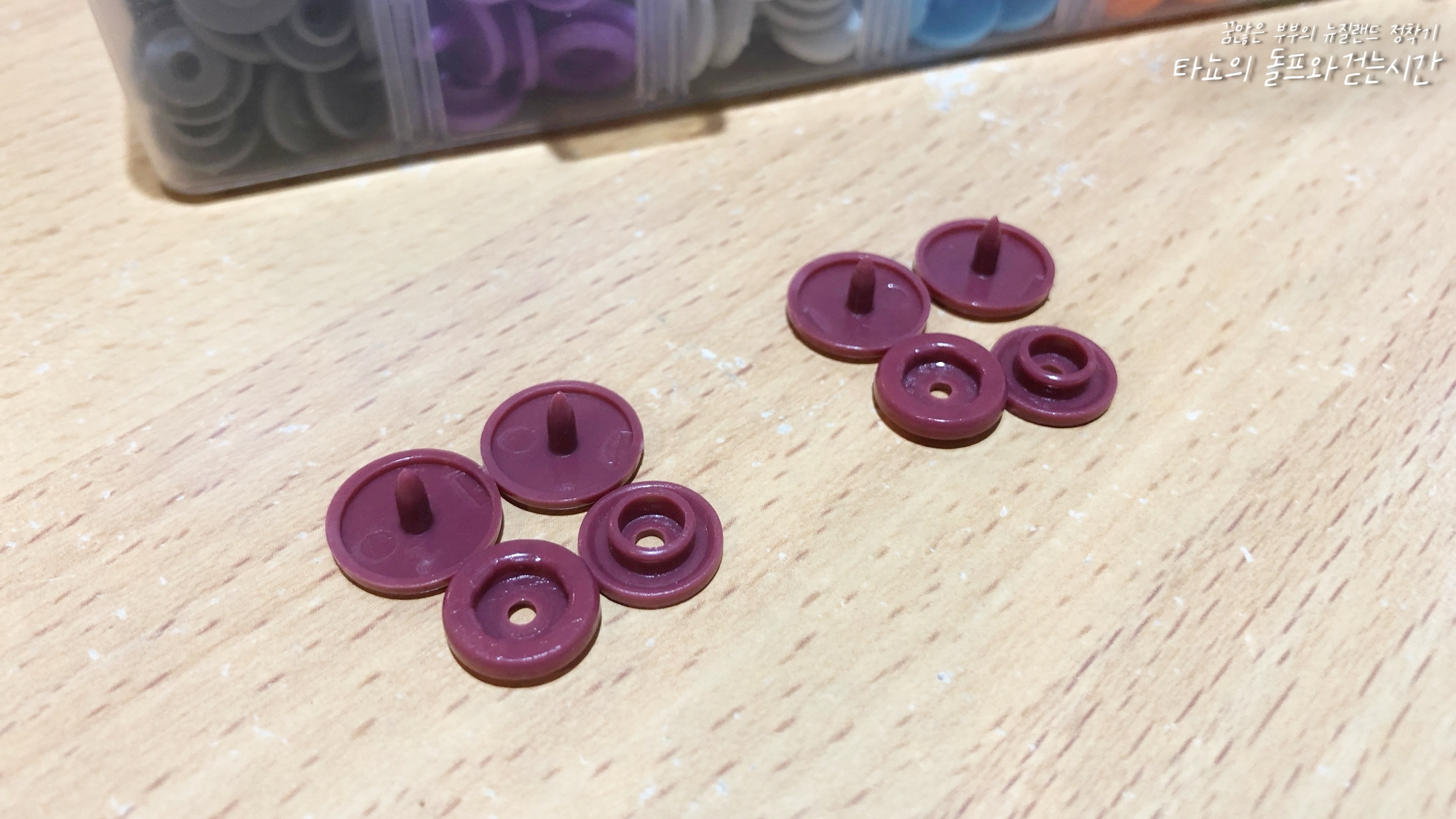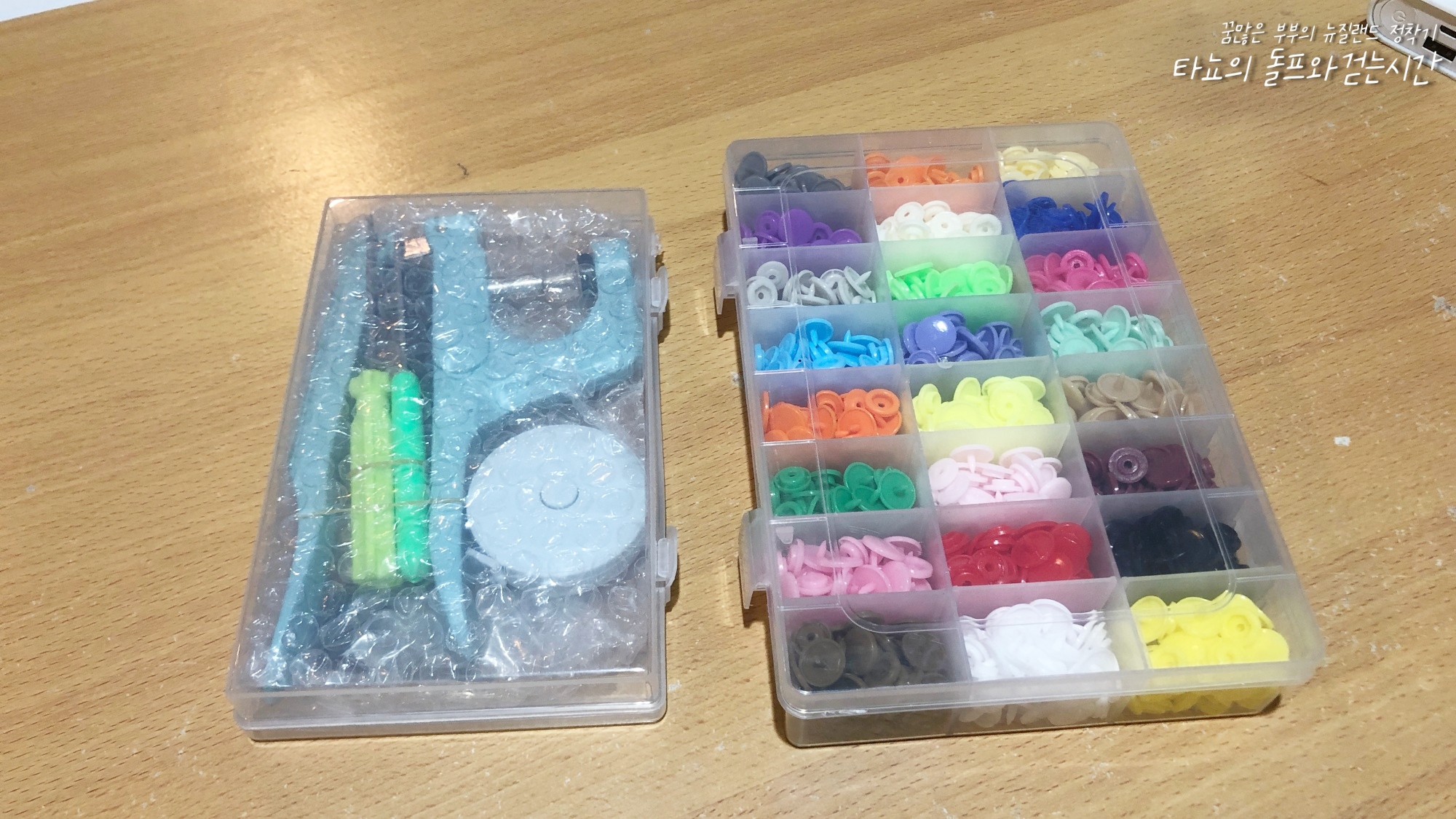 이걸 T단추 프레스라고 부른다는 것도 이번에 처음 알았다. 단추색은 24색으로 주문했고 줄자와 집게, 송곳, 여분 고무 패킹 등이 함께 들어 있었다.