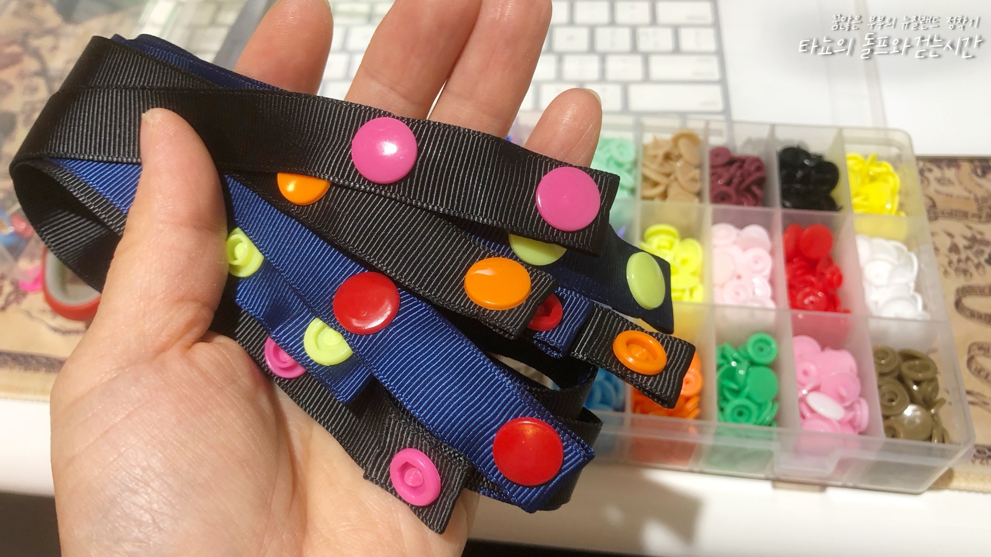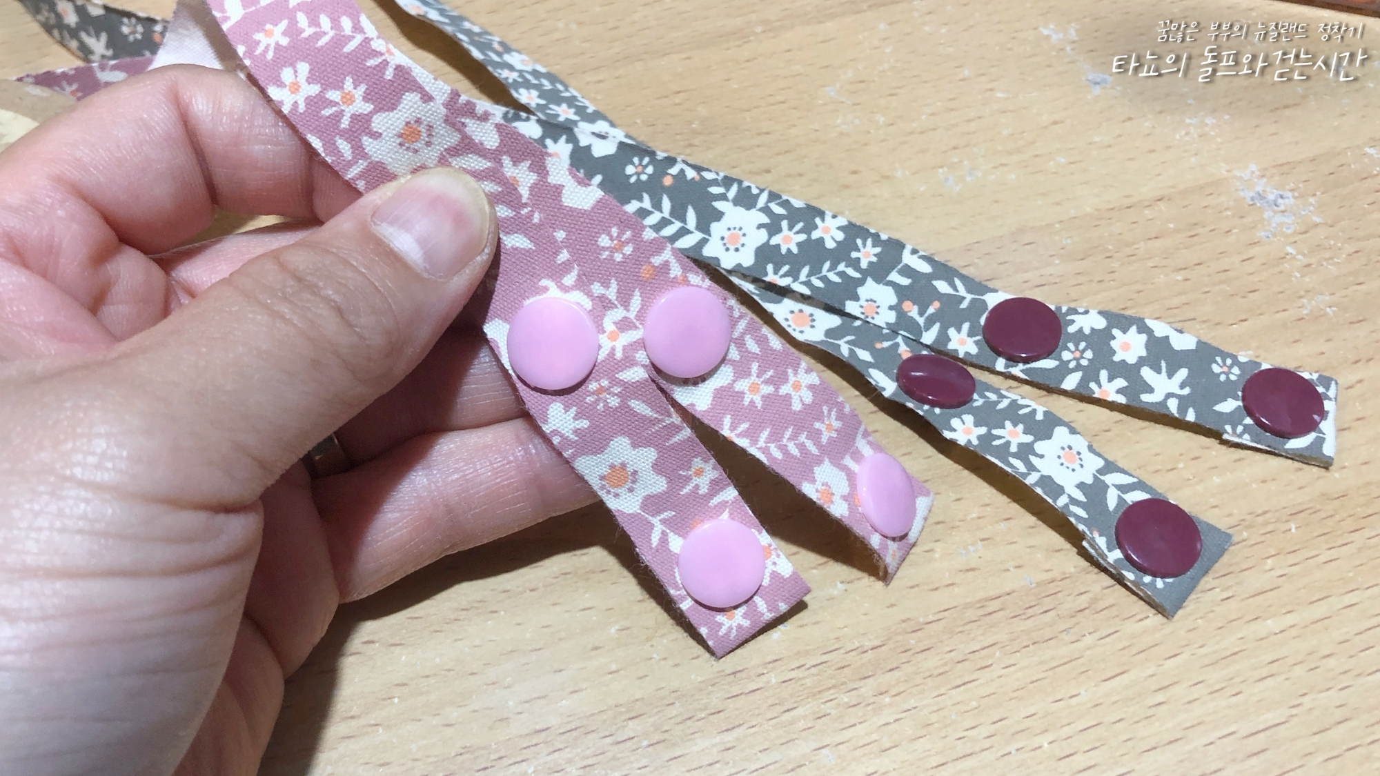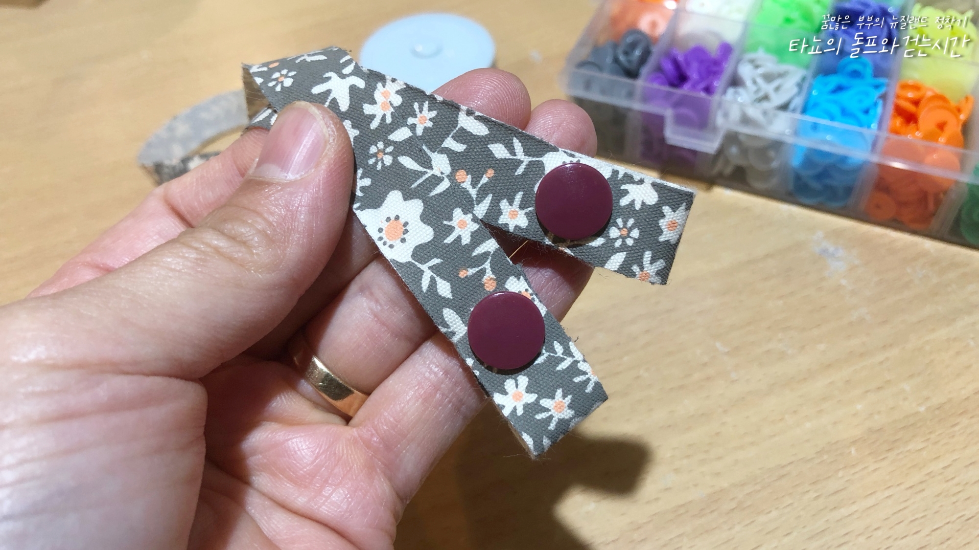집에 있는 천으로 된 리본이 이런 꽃무늬 뿐이라 일단 이걸로 만들어 봤다. T단추는 서로 짝이 있는데 오른쪽 사진에 보이는 게 한 세트다. 똑딱이 단추 모양이 파인 것과 돌출된 것, 2가지로 나뉘니 잘 체크하고 만들어야 한다. 자칫 잘못 짝을 지어주면 단추가 닫히지 않는다.