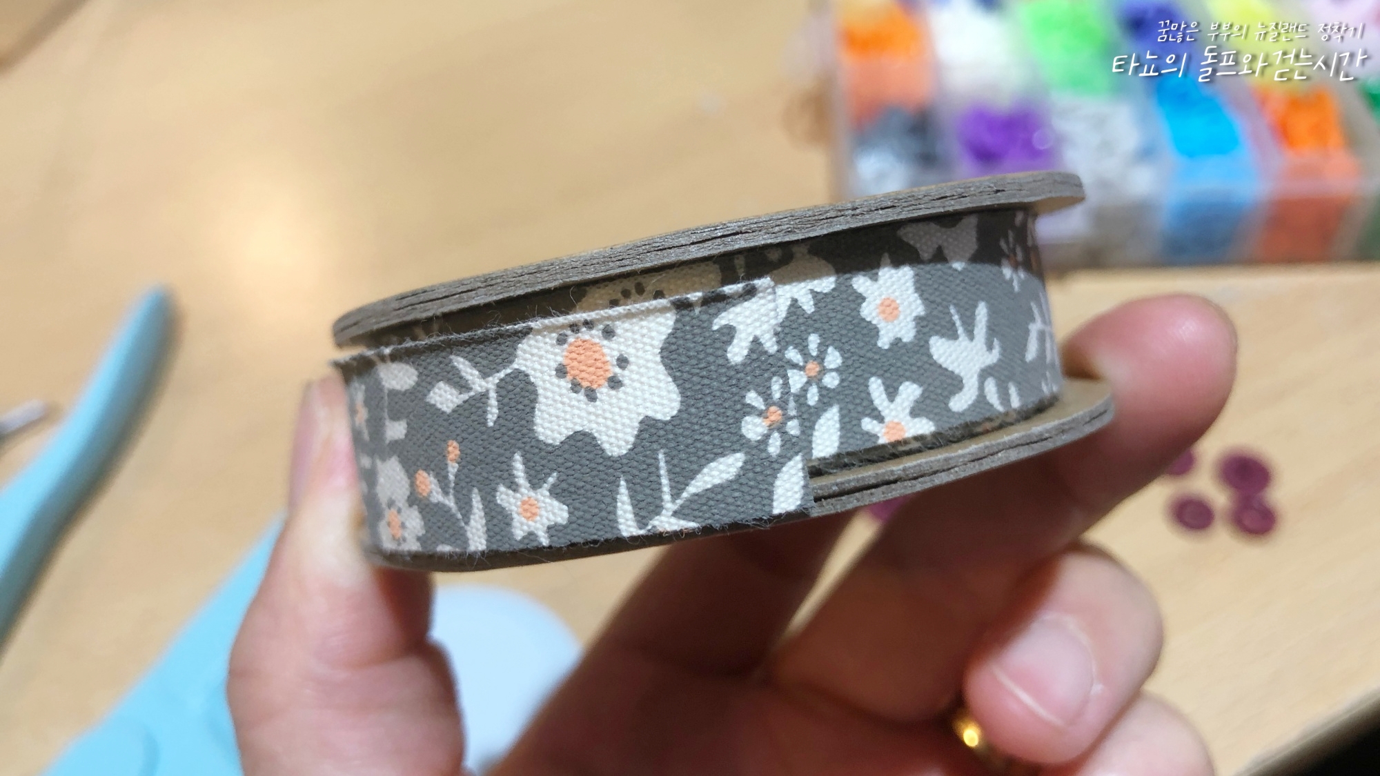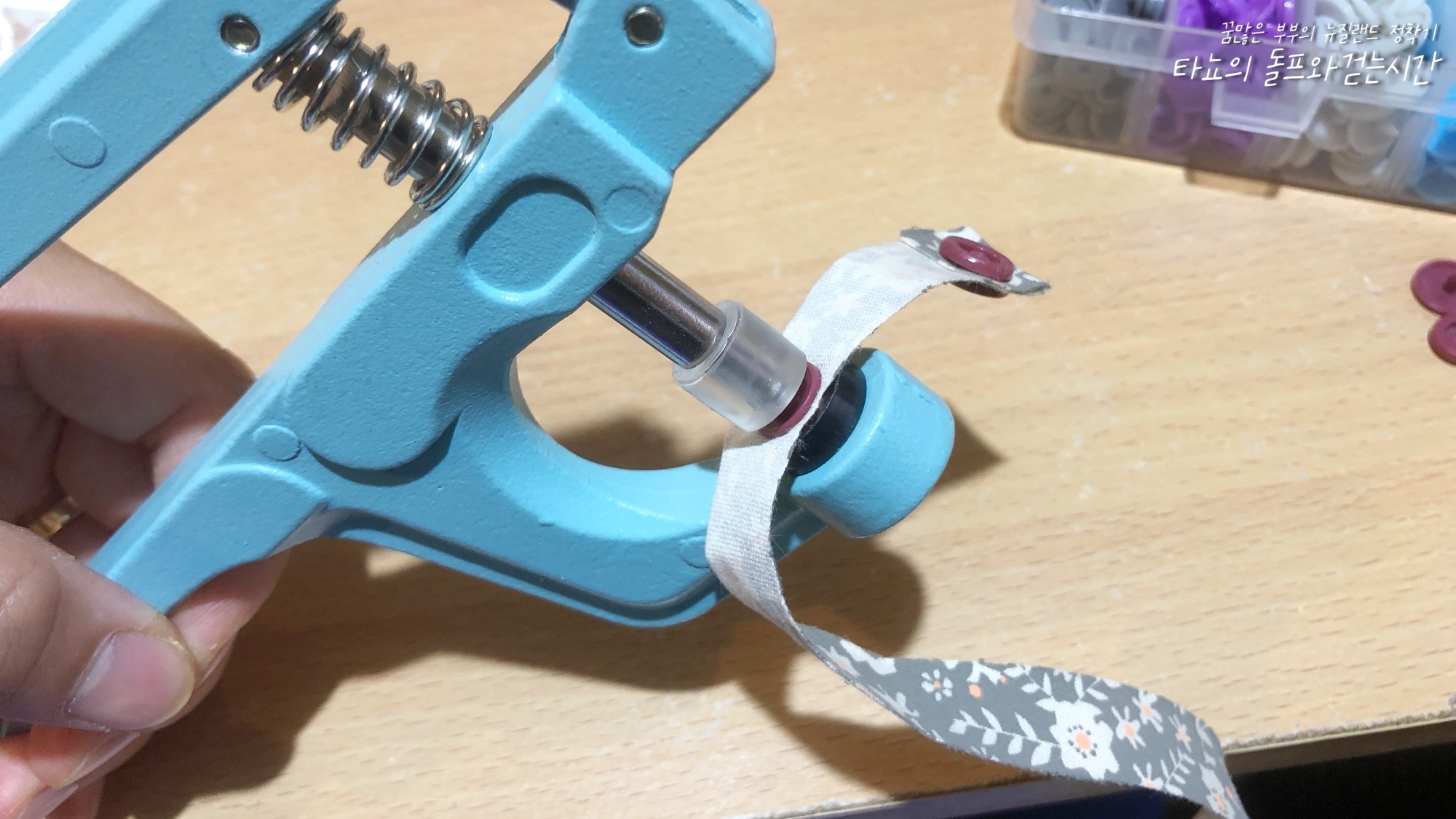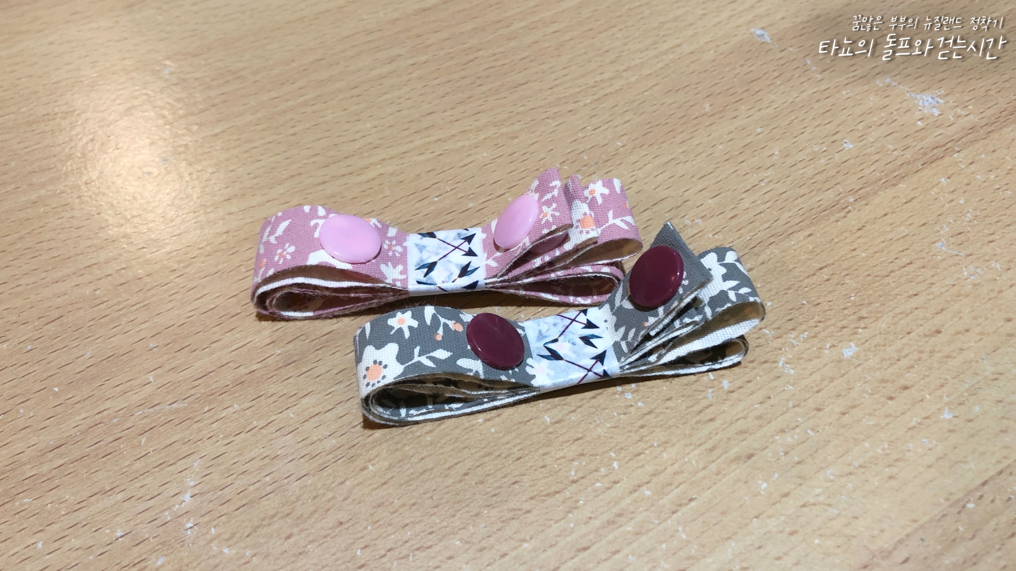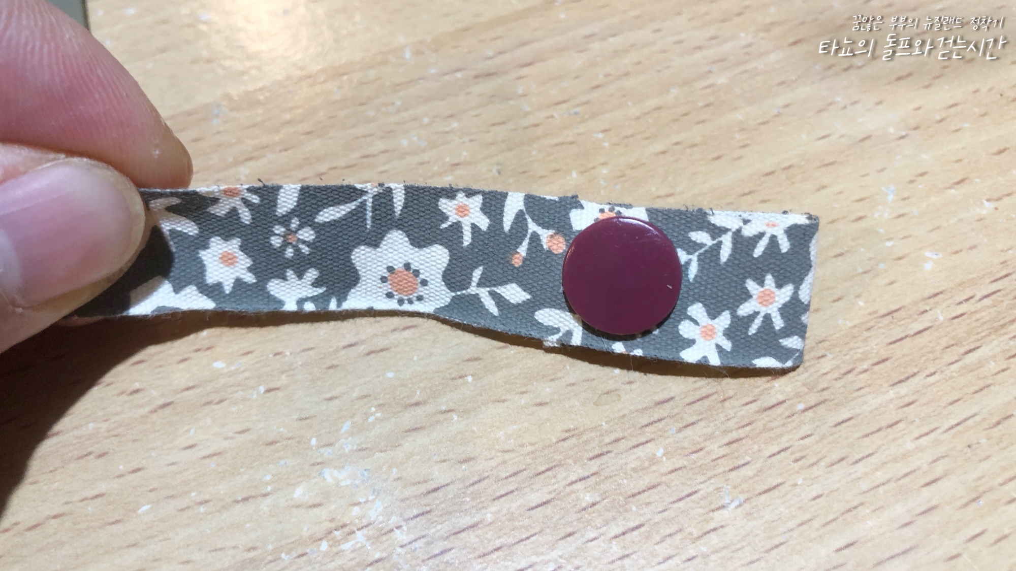 집에 있는 천으로 된 리본이 이런 꽃무늬 뿐이라 일단 이걸로 만들어 봤다. T단추는 서로 짝이 있는데 오른쪽 사진에 보이는 게 한 세트다. 똑딱이 단추 모양이 파인 것과 돌출된 것, 2가지로 나뉘니 잘 체크하고 만들어야 한다. 자칫 잘못 짝을 지어주면 단추가 닫히지 않는다.