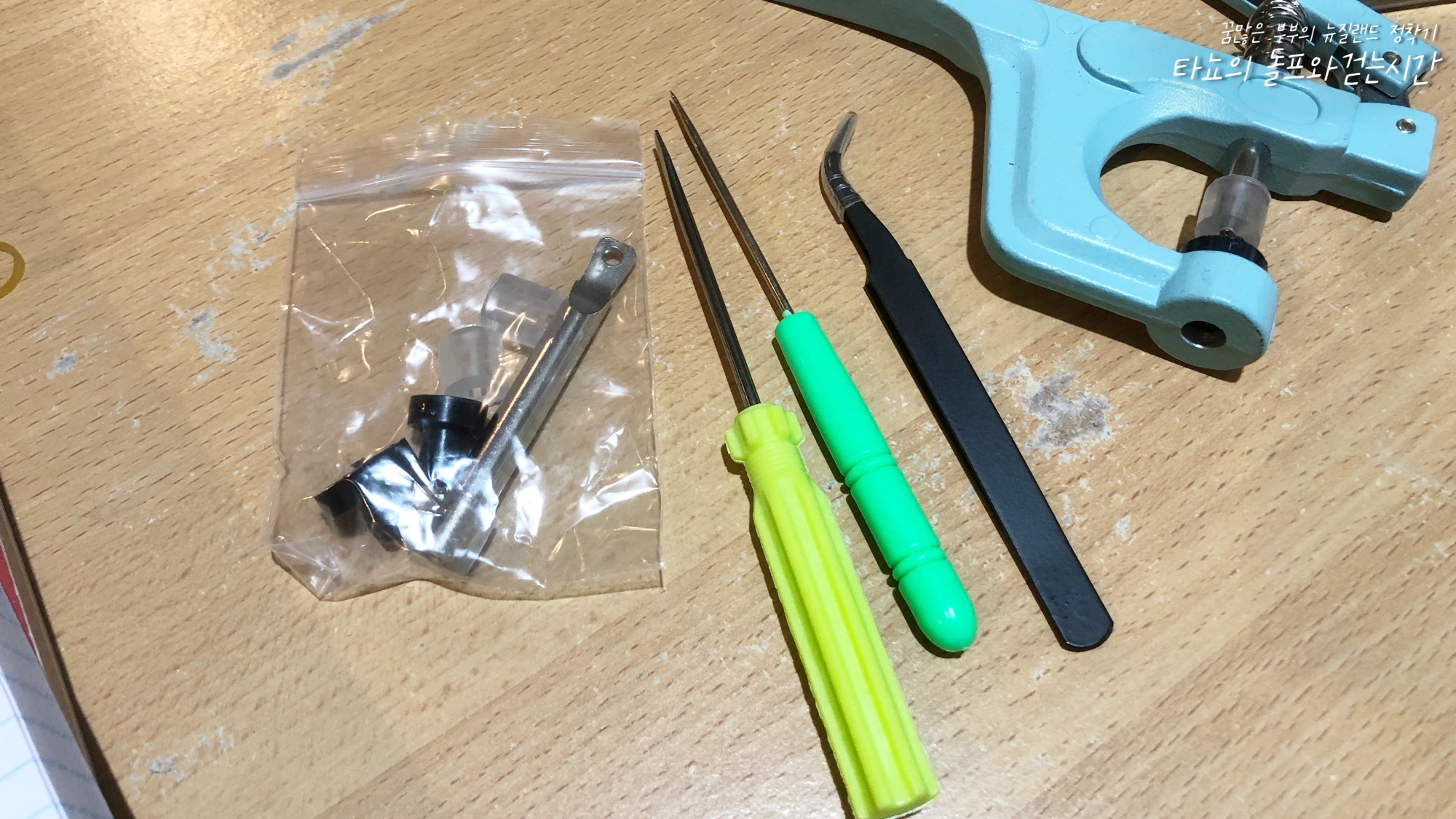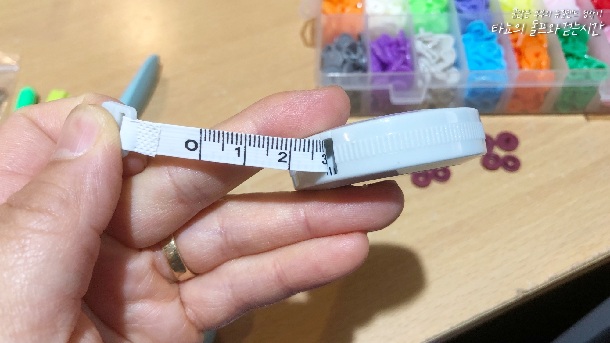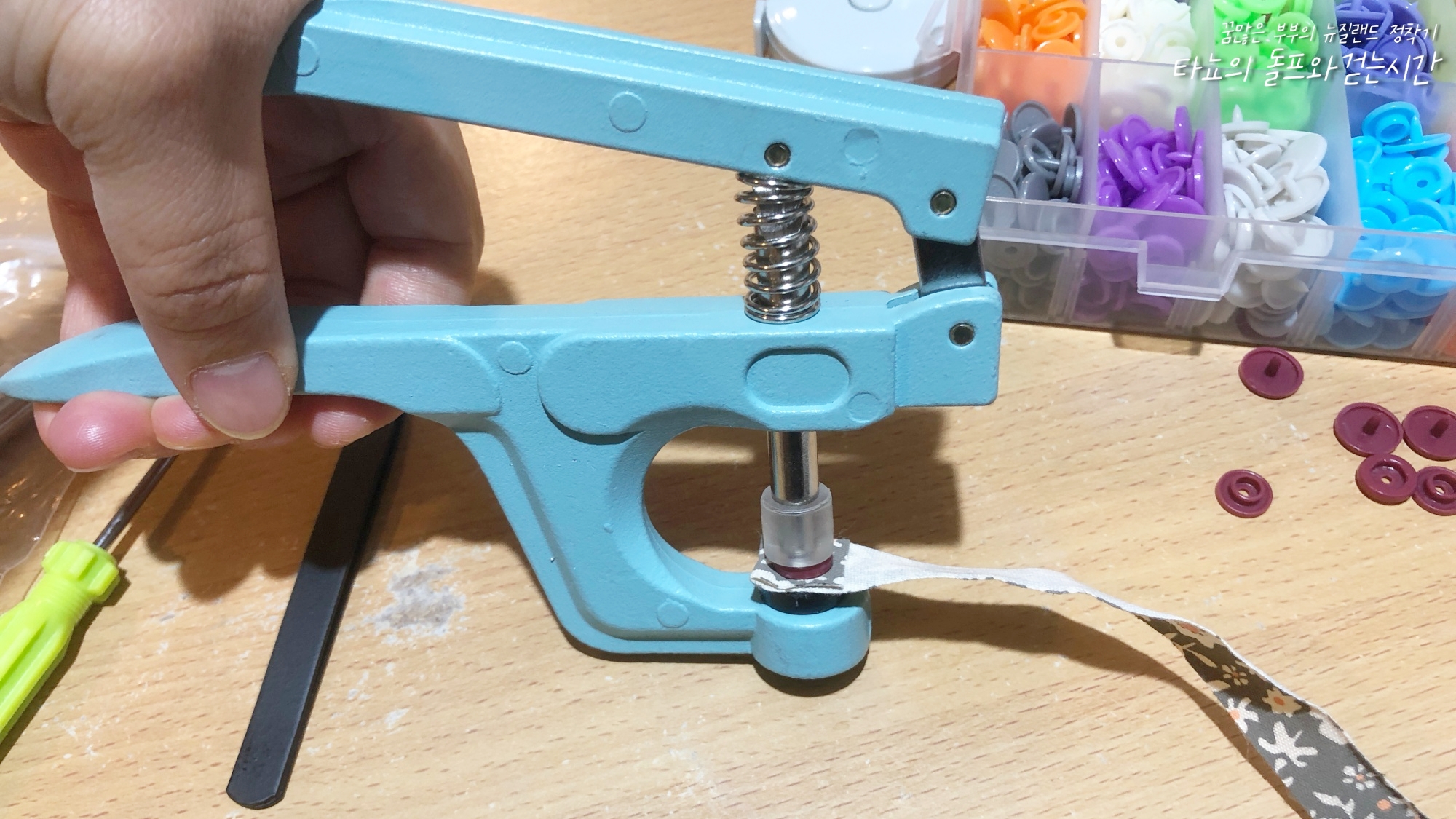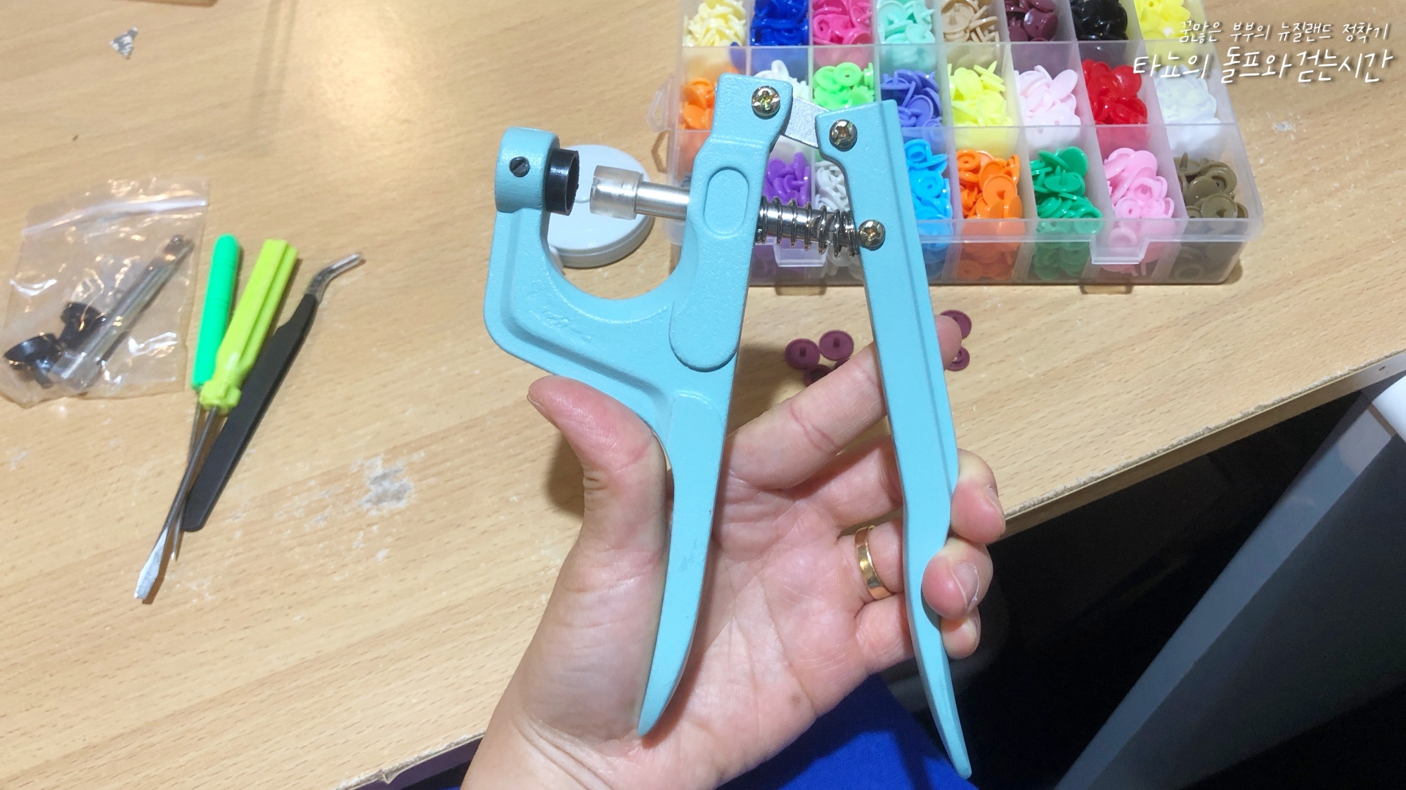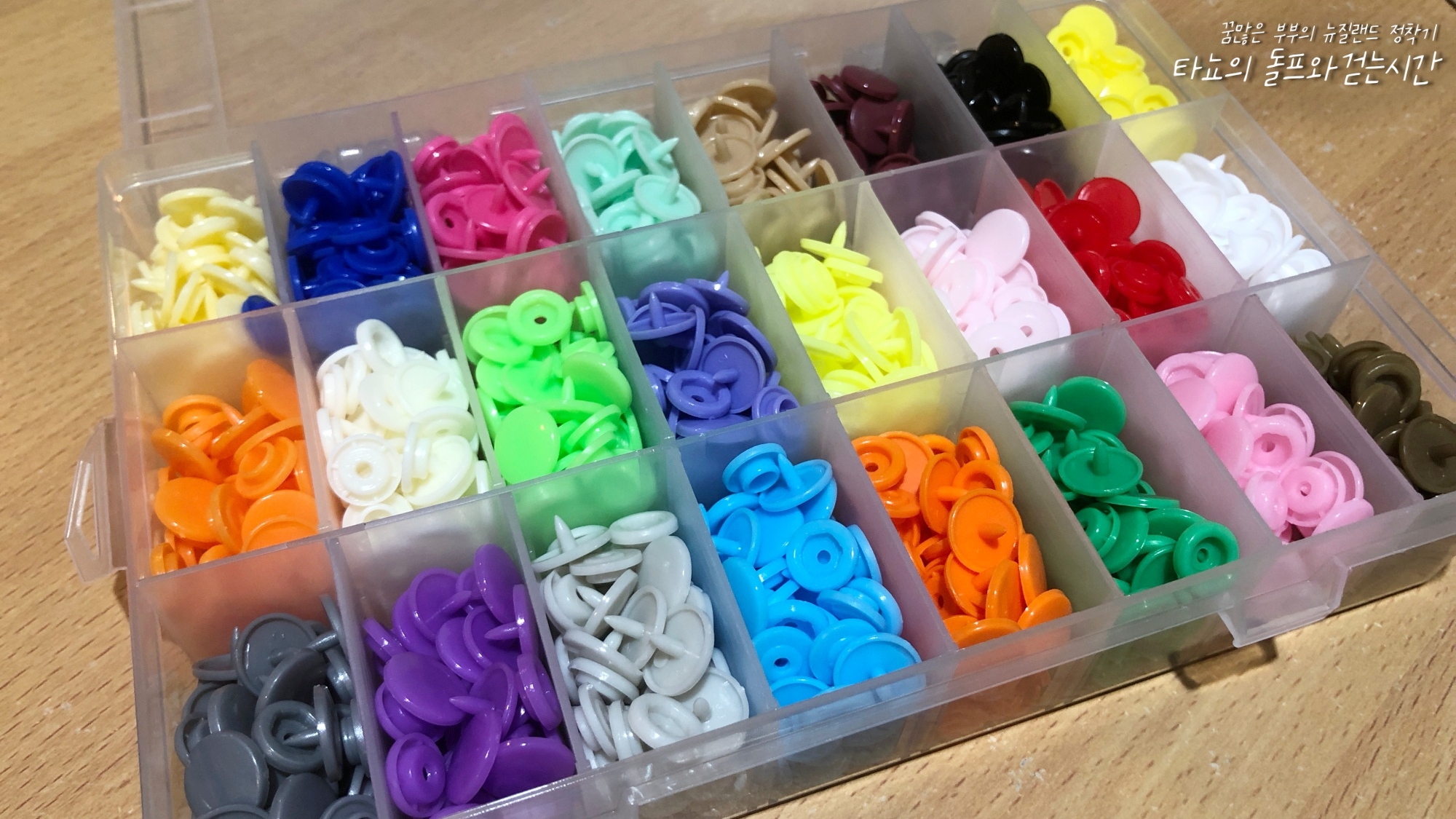 이걸 T단추 프레스라고 부른다는 것도 이번에 처음 알았다. 단추색은 24색으로 주문했고 줄자와 집게, 송곳, 여분 고무 패킹 등이 함께 들어 있었다.