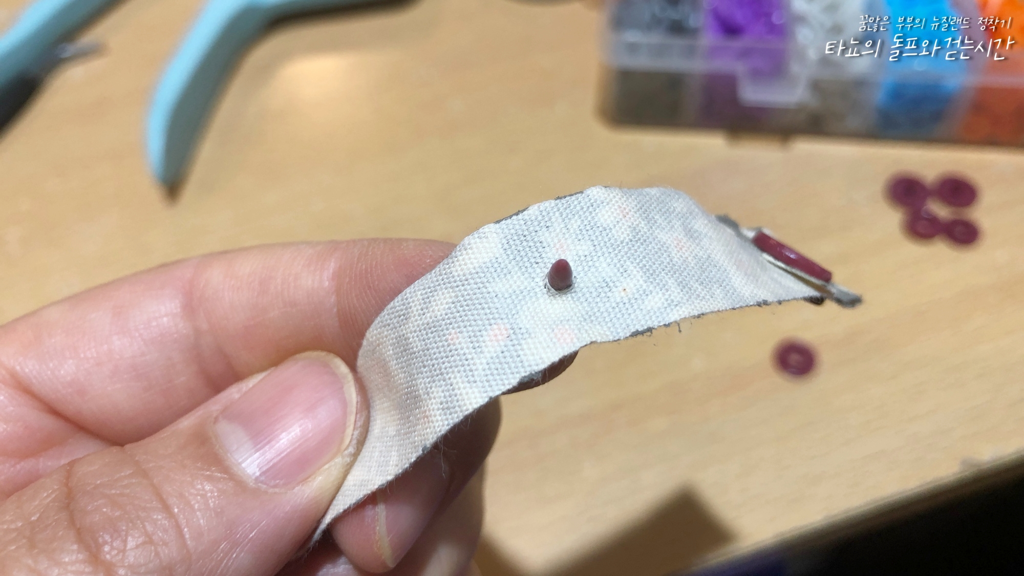 리본 살짝 젛어서 요렇게 압정 모양으로 생긴 것을 먼저 꽂아준다. 나는 송곳으로 구멍을 살짝 낸 다음 끼웠다. 그리고 오른쪽 사진처럼 짝꿍 단추를 끼워주면 된다.
